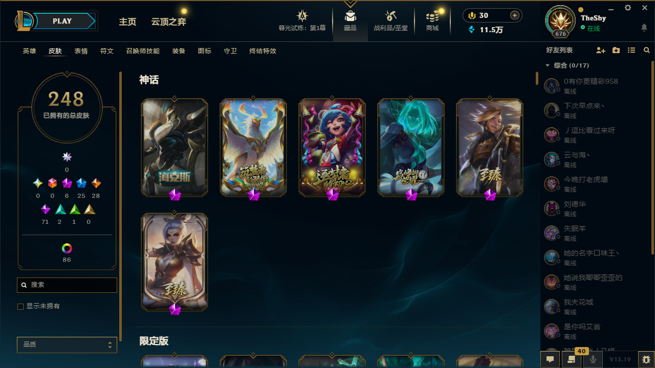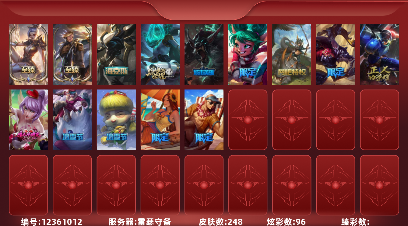 【10889514】[12361012]【gpz_961869】 t27753【雷瑟守备】248皮肤 96炫彩 6臻彩 6神话/25限定/28传说/171英雄 账号等级:676【重要头像】爱情之歌 觅心之翼奎因 KDA萨勒芬妮 魄罗宇航员 沐浴震惊 不错哦 【重要皮肤】灵能特工伊泽瑞尔至臻 玉剑传说武剑仙至臻 零之枪骑赫卡里姆 胜利剑圣易 胜利之王泰达米尔 胜利巨口克格莫