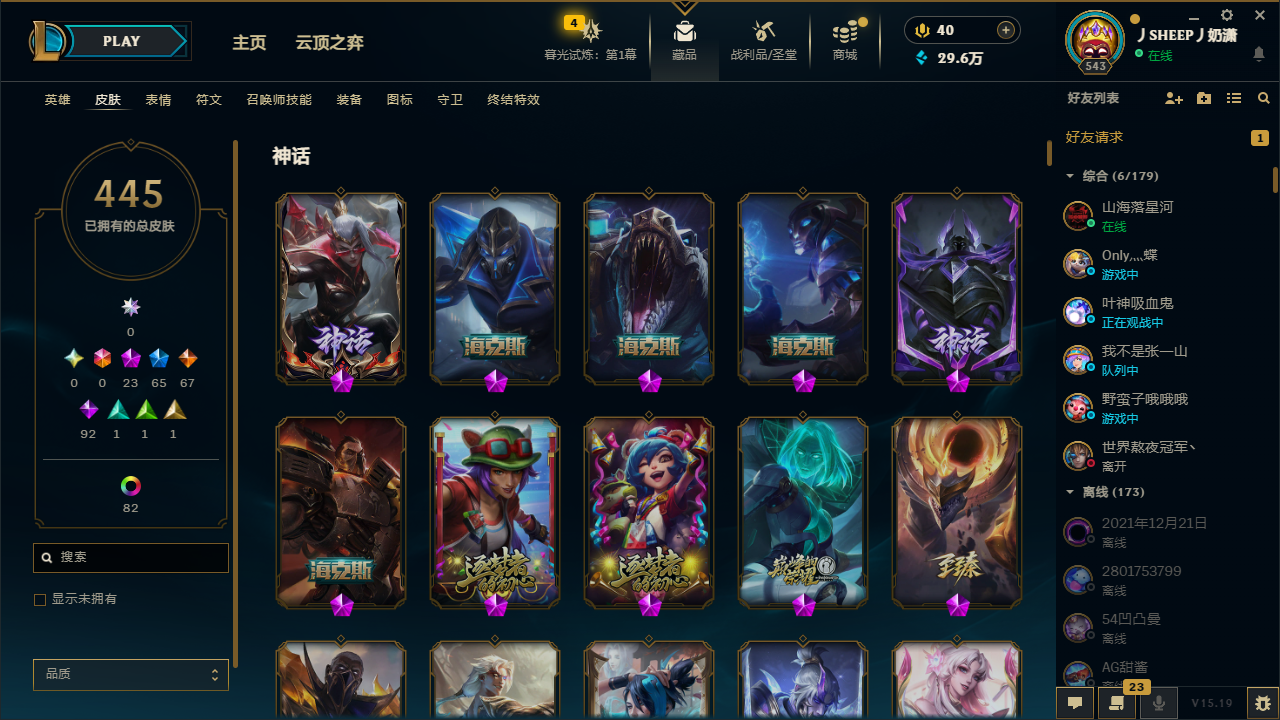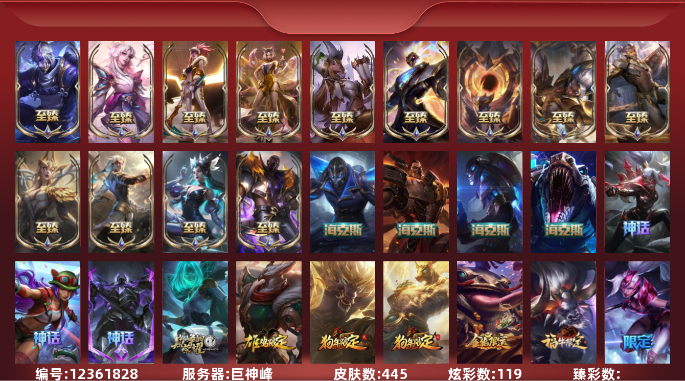 【10889697】[12361828]【gpz_961876】 t27750【巨神峰】445皮肤 119炫彩 9臻彩 23神话/65限定/67传说/171英雄 账号等级:543【重要头像】爱情之歌 心型钥匙 御星魔矢艾希 星守卡莎 星守卡莎炫彩 披萨鸡 至臻星之守护者辛德拉 【重要皮肤】莲华温泉厄斐琉斯至臻 灵魂莲华劫至臻 灵魂莲华拉克丝至臻 斗魂觉醒派克至臻 星之守护