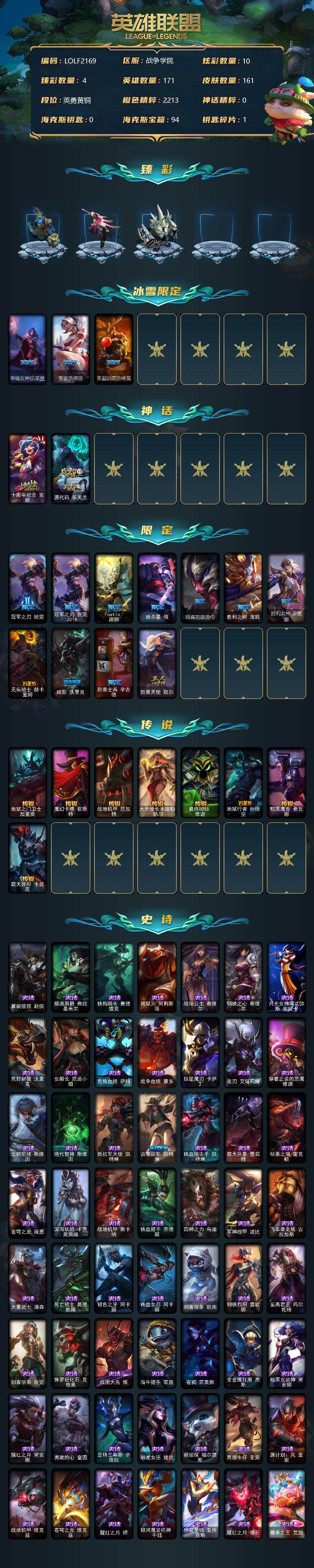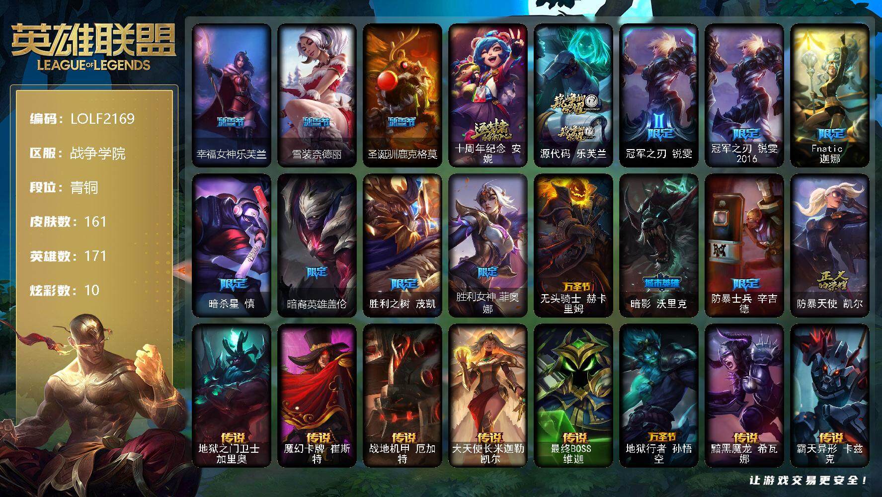 【10889698】【LOLF2169】171英雄/161皮肤/2神话/14限定/4臻彩/10炫彩/8传说/56史诗/青铜账号等级:193/冠军典狱长锤石凯旋圣装/玉剑传说无影竞星/霸天巨兽雪崩墨菲特/魔女阿卡丽虚荣/幸福女神乐芙兰/雪装奈德丽/圣诞驯鹿克格莫/十周年纪念安妮/源代码乐芙兰/冠军之刃锐雯/冠军之刃锐雯2018/Fnatic迦娜/暗杀星慎/暗裔英雄盖伦/胜利之树茂凯/胜利女神菲奥娜