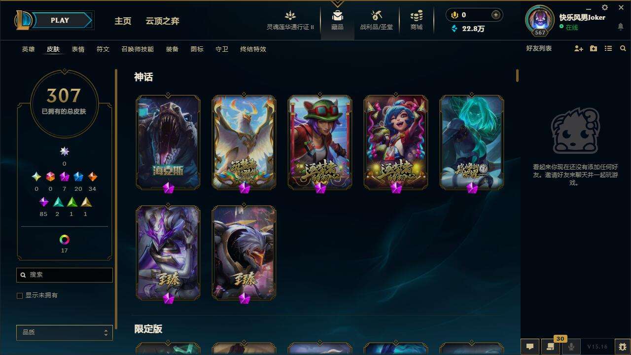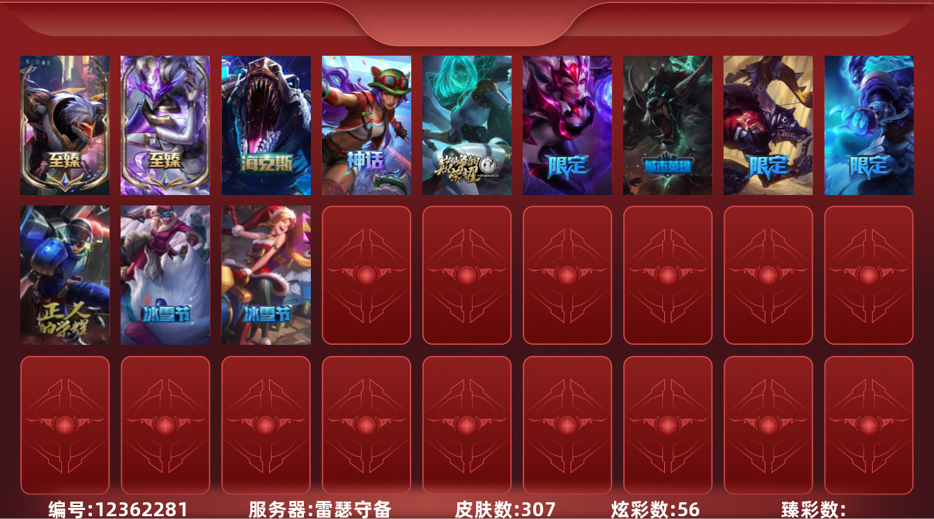 【10889835】[12362281]【gpz_961882】 t25134【雷瑟守备】原皮龙瞎 307皮肤 56炫彩 8臻彩 7神话/20限定/34传说/171英雄 账号等级:567 云顶神话:1 【重要头像】爱情之歌 击拳 KDA萨勒芬妮 魄罗宇航员 此志无双羽饰骑士 不错哦 圣诞捣蛋鬼金克丝 【重要皮肤】斗魂觉醒萨科至臻 源计划阴劫至臻 海克斯科技雷克顿 荣誉使者玛尔扎哈 龙的传人李青