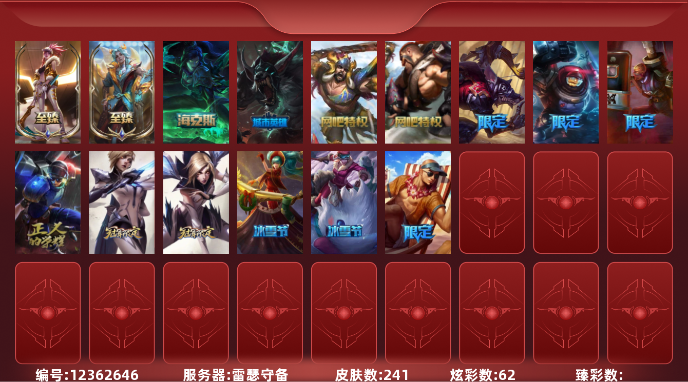 【10889885】[12362646]【gpz_961887】 t25153【雷瑟守备】241皮肤 62炫彩 7臻彩 4神话/28限定/22传说/171英雄 账号等级:374 【重要头像】云顶战斗学院伊泽瑞尔 云顶古琴娑娜 KDA萨勒芬妮 【重要皮肤】天龙之子伊泽瑞尔至臻 KDA阿卡丽至臻 摄魂使者薇恩 胜利巨口克格莫 电玩女神厄运小姐 点心宝贝阿木木 天龙之子斯莫德 胜利女神瑟庄妮 胜利机