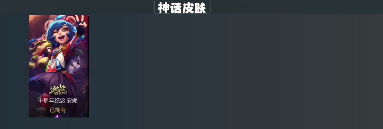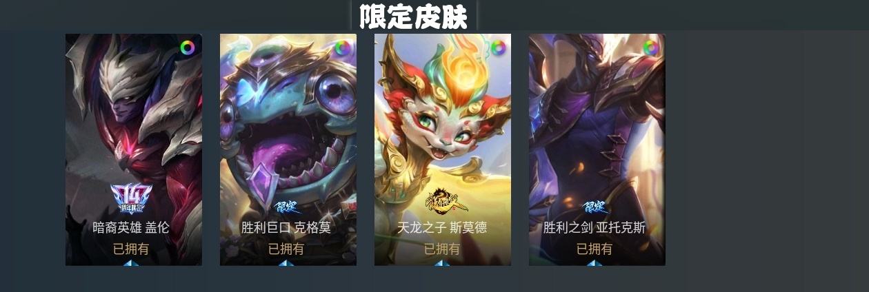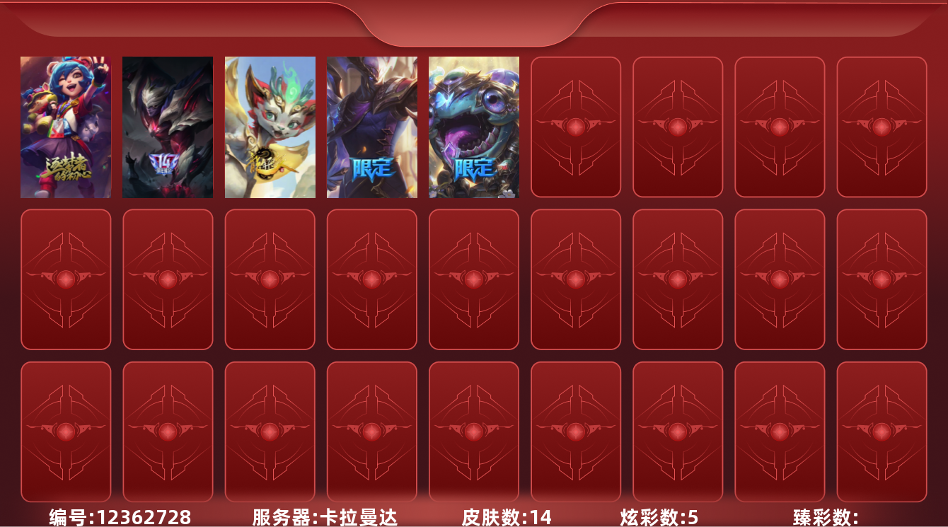 【10889979】[12362728]实名: 不可修改 英雄数: 101 皮肤数: 14 炫彩数: 5 赛季限定皮: 胜利之剑 亚托克斯,胜利巨口 克格莫 年限: 天龙之子 斯莫德 周年: 10周年 安妮 其他限定/神话皮: 暗裔英雄 盖伦
