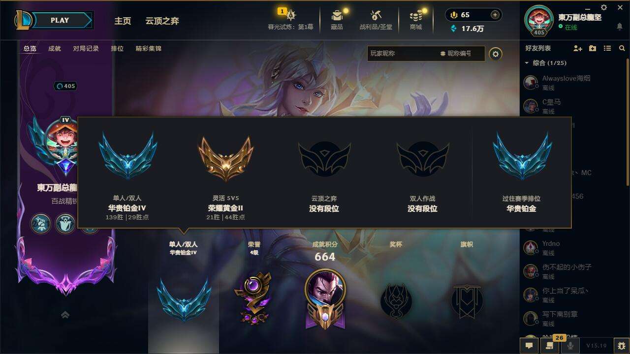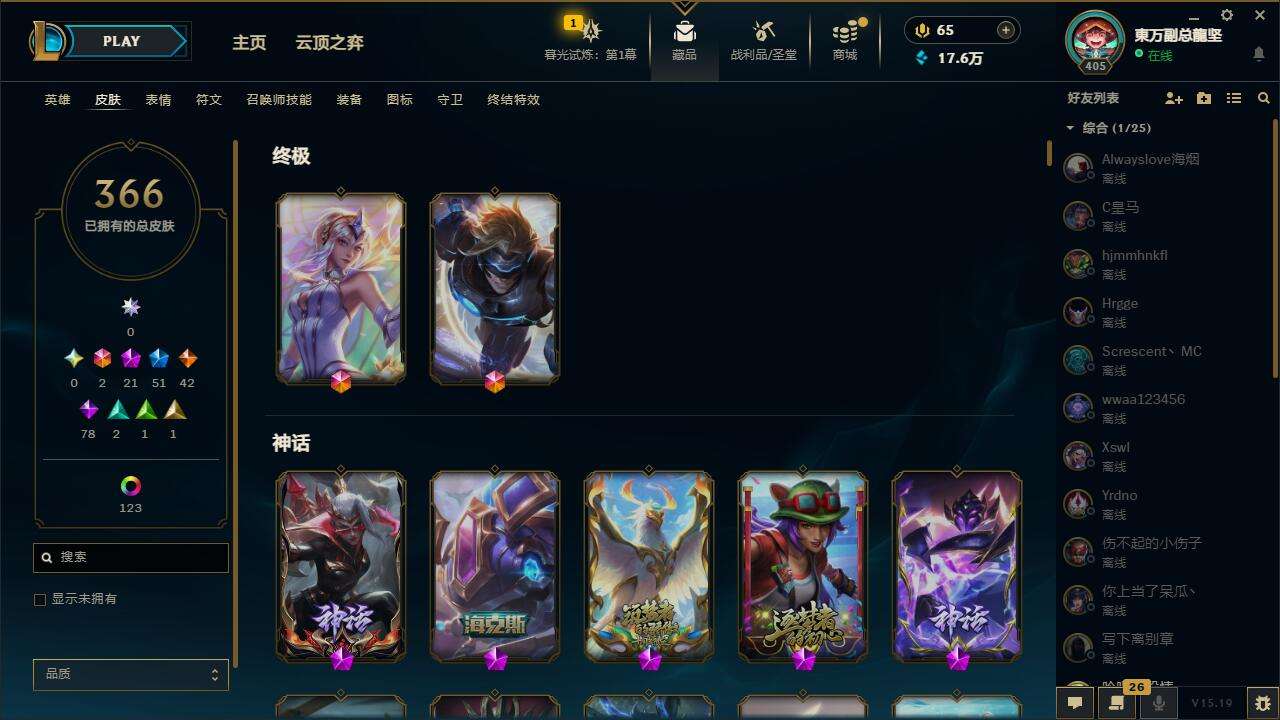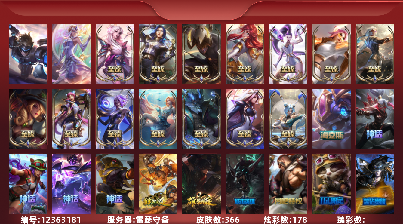 【10890039】[12363181]【gpz_961894】 t27691【雷瑟守备】366皮肤 178炫彩 13臻彩 21神话/51限定/42传说/171英雄 账号等级:405 云顶神话:3 单双排段位:铂金【重要头像】雪花 大家伙 我麦是开的么 星守金克丝炫彩 美猴王孙悟空 【重要皮肤】暗裔英雄嘉文四世至臻 灵魂莲华拉克丝至臻 双城之战2指挥官凯特琳至臻 玉剑传说琴仙子
