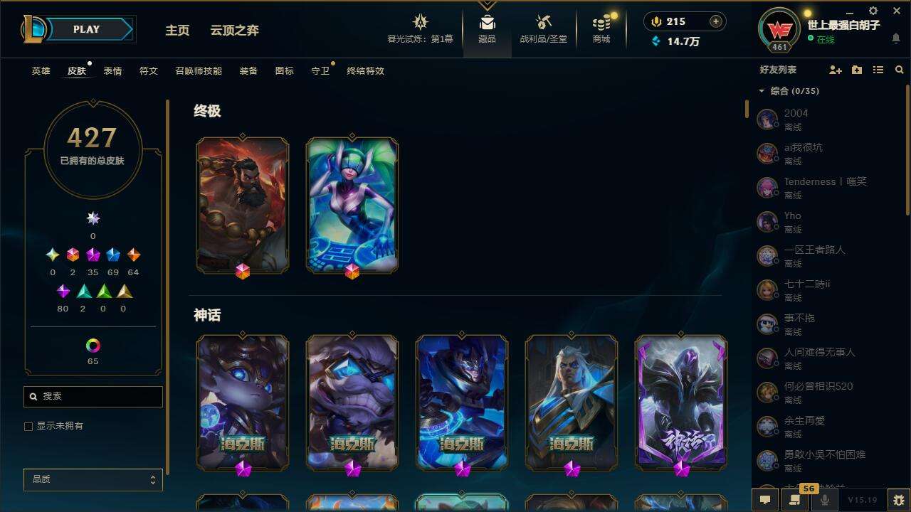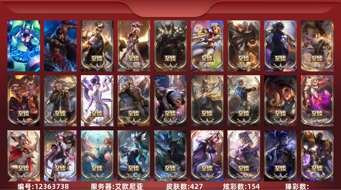 【10890173】[12363738]【gpz_961907】 t27698【艾欧尼亚】 427皮肤 154炫彩 3臻彩 35神话/69限定/64传说/170英雄 账号等级:461 云顶神话:5【重要头像】觅心之翼奎因 银河魔装机神安妮 EDG厄斐琉斯 EDG佛耶戈 EDG格雷福斯 EDG悠米 EDG佐伊 剪纸仙灵艾瑞莉娅 剪纸仙灵艾瑞莉娅炫彩 披萨鸡 至臻海之歌萨勒芬妮