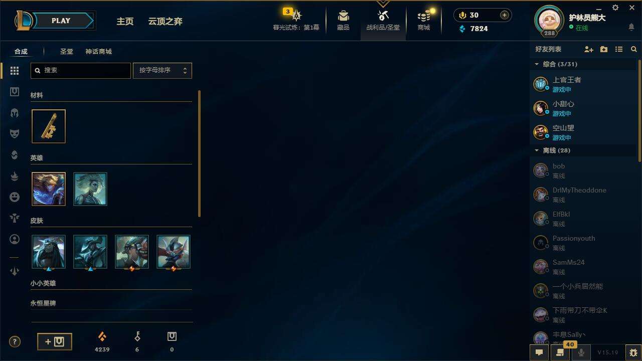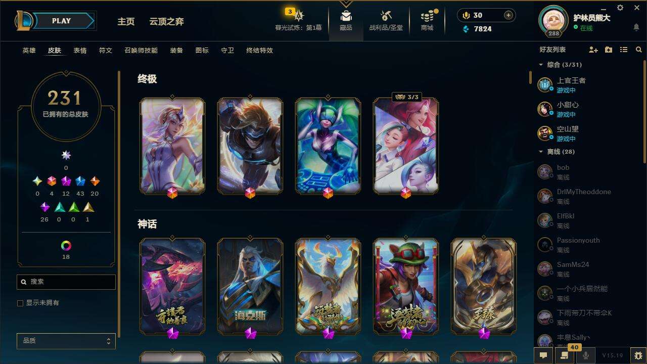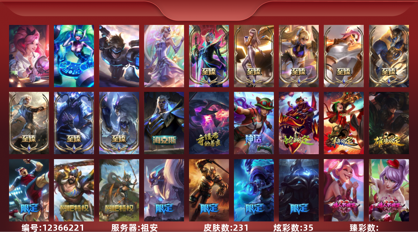 【10890675】[12366221]【gpz_961937】 t27700【祖安】231皮肤 35炫彩 5臻彩 12神话/43限定/20传说/168英雄 账号等级:288【重要头像】爱情之歌 心型钥匙 雪花 萨勒芬妮超级巨星 萨勒芬妮独立音乐人 战斗学院伊泽瑞尔神话炫彩 至臻战斗学院蕾欧娜 【重要皮肤】至高天凯尔至臻 青花瓷千珏至臻 DRX亚托克斯至臻 战斗学院蕾欧娜至