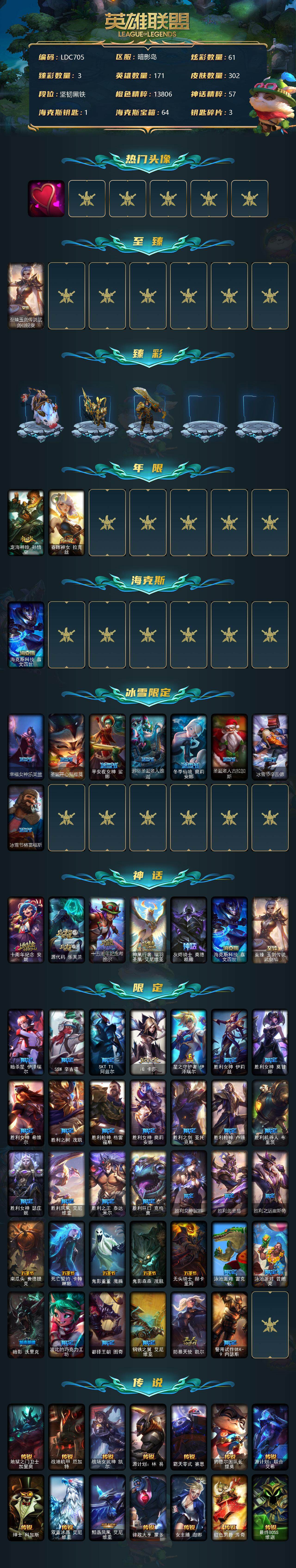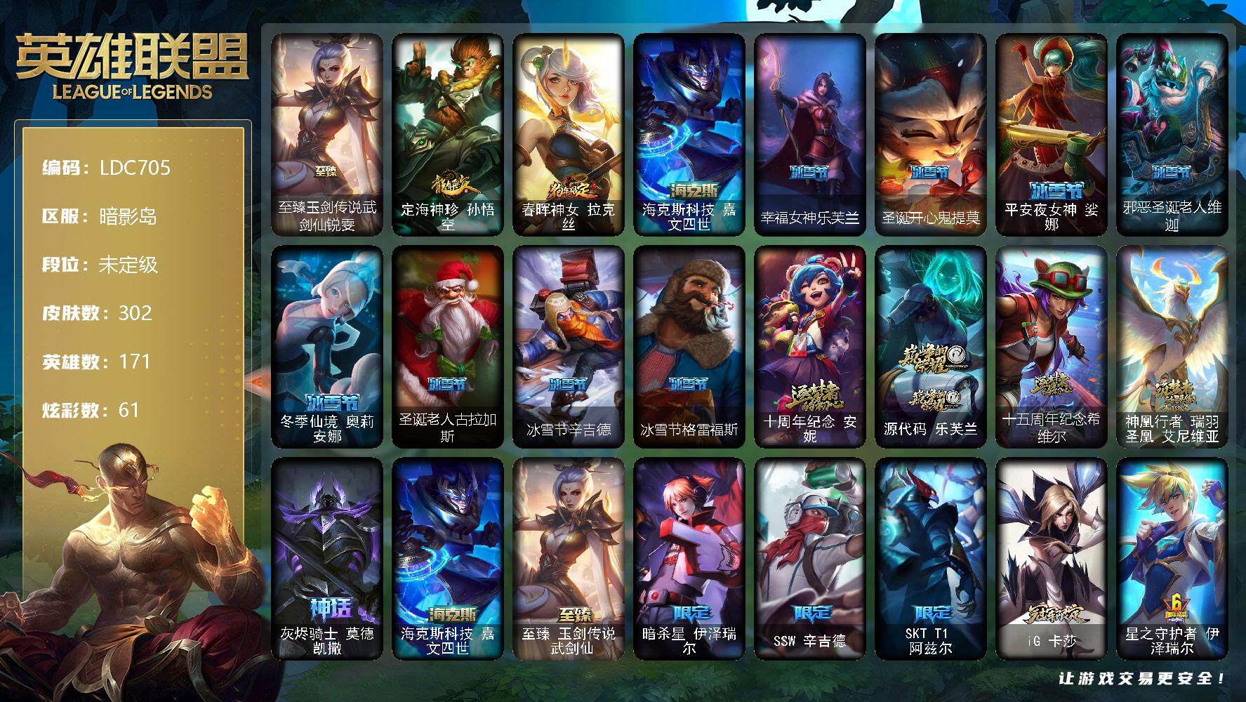 【10890679】【LDC705】171英雄/302皮肤/7神话/44限定/3臻彩/61炫彩/28传说/79史诗/未定级/爱意绵绵/至臻玉剑传说武剑仙/无畏骑士瑟庄妮赤子初心/吕布奉先炫金战神/张辽文远炫金将军/定海神针孙悟空/春晖神女拉克丝/海克斯科技嘉文四世/幸福女神乐芙兰/圣诞开心鬼提莫/平安夜女神娑娜/邪恶圣诞老人维迦/冬季仙境奥莉安娜/圣诞老人古拉加斯/冰雪节辛吉德/冰雪节格雷福斯/