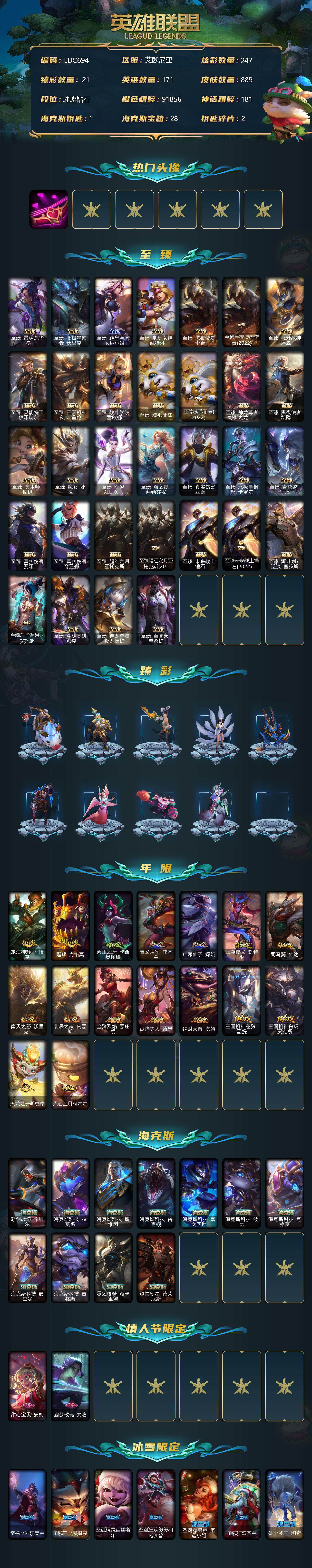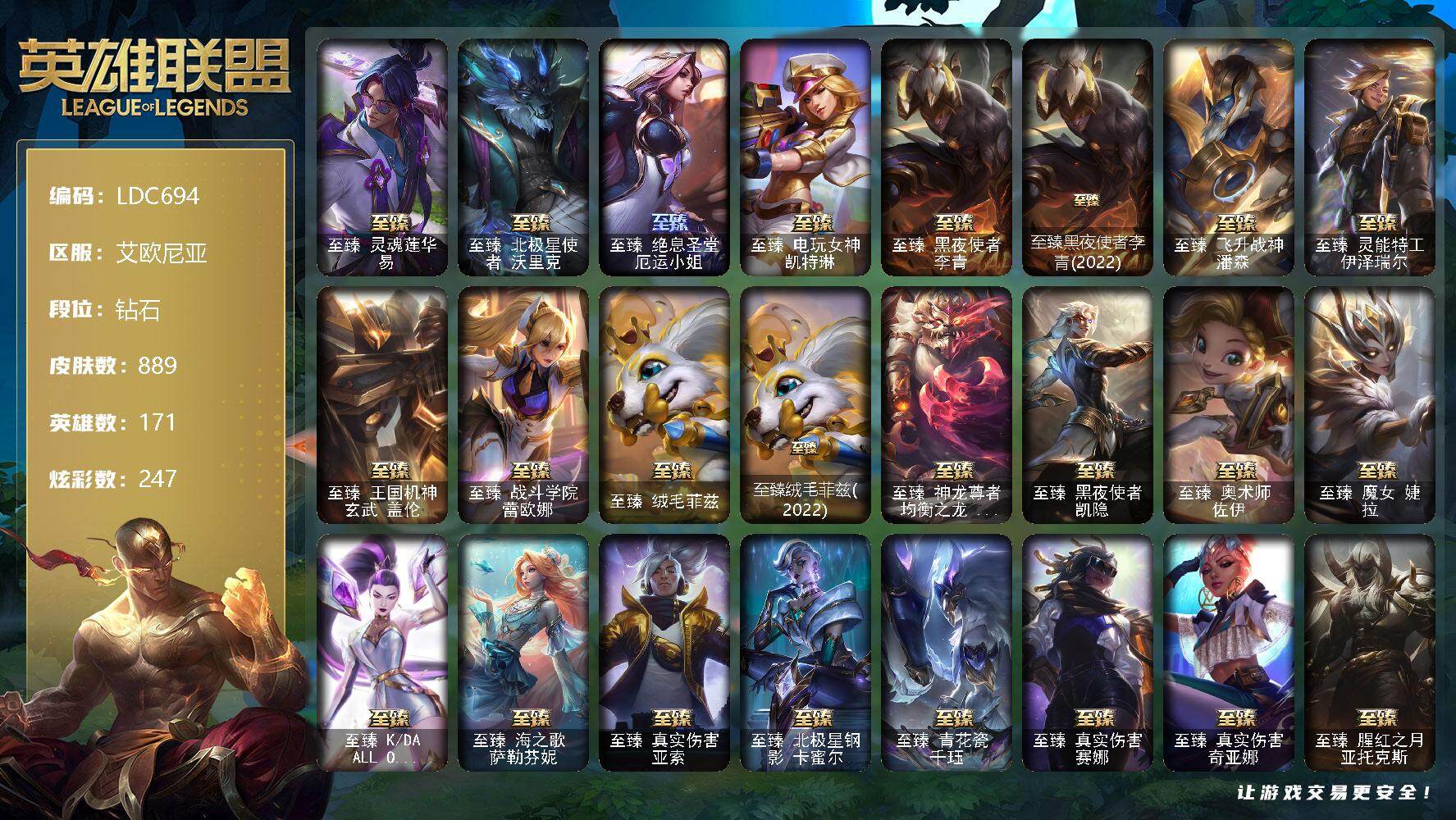 【10890851】【LDC694】171英雄/889皮肤/2终极/51神话/133限定/21臻彩/247炫彩/73传说/192史诗/钻石/爱情之歌/至臻灵魂莲华易/至臻北极星使者沃里克/至臻绝息圣堂厄运小姐/至臻电玩女神凯特琳/至臻黑夜使者李青/至臻黑夜使者李青(2022)/至臻飞升战神潘森/至臻灵能特工伊泽瑞尔/至臻王者机甲玄武盖伦/至臻战斗学院蕾欧娜/至臻绒毛菲兹/至臻绒毛菲兹(2022)