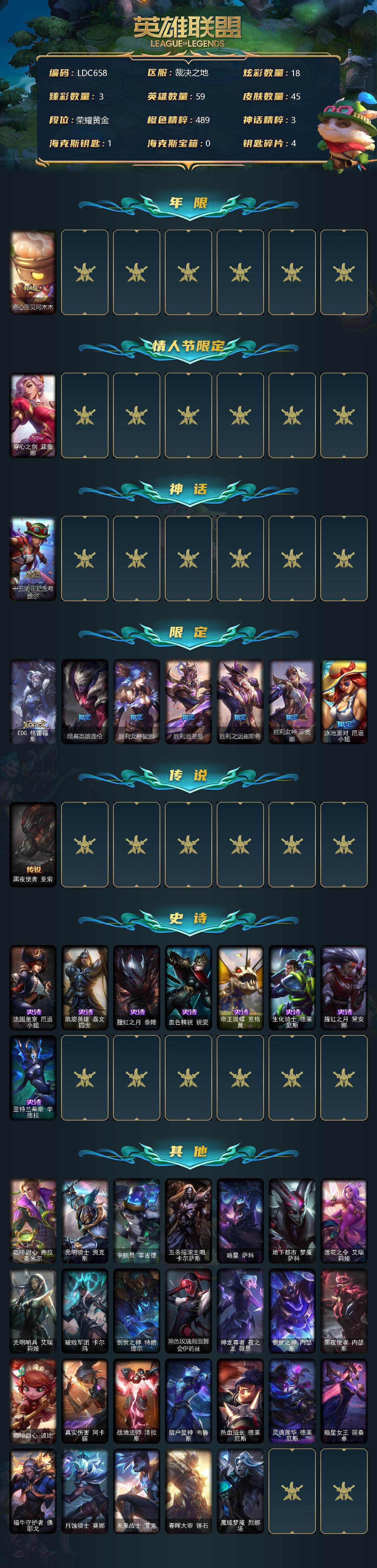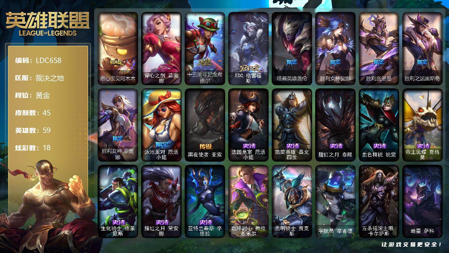 【10890914】【LDC658】59英雄/45皮肤/1神话/9限定/3臻彩/18炫彩/1传说/8史诗/黄金账号等级:104/战斗学院卡特琳娜盛典礼服/星之守护者阿卡丽热情之光/黑夜使者嘉文四世白夜/点心宝贝阿木木/穿心之剑菲奥娜/十五周年纪念希维尔/EDG格雷福斯/暗裔英雄盖伦/胜利女神娑娜/胜利剑圣易/胜利之运崔斯特/胜利女神菲奥娜/泳池派对厄运小姐/黑夜使者亚索/法国皇室厄运小姐/凯旋英