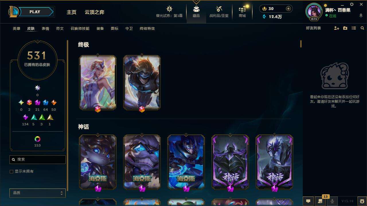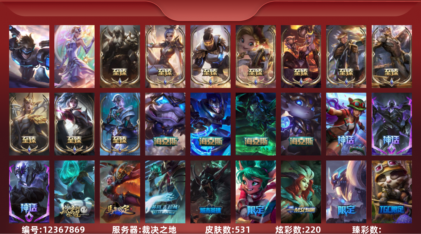 【10890984】[12367869]【gpz_961965】 t27717【裁决之地】531皮肤 220炫彩 10臻彩 21神话/64限定/50传说/171英雄 账号等级:875 单双排段位:翡翠【重要头像】爱情之歌 觅心游侠卢锡安 觅心之翼奎因 银河魔装机神安妮 大家伙 水晶圣骑蕾欧娜头 【重要皮肤】北极星钢影卡蜜尔至臻 魔女阿卡丽至臻 魔女乐芙兰至臻 奥术师佐伊至臻