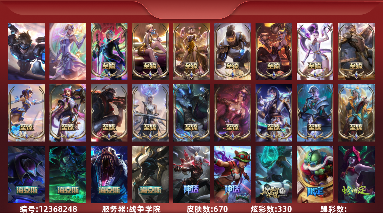 【10891055】[12368248]【gpz_961969】 t27721【战争学院】670皮肤 330炫彩 18臻彩 26神话/96限定/74传说/171英雄 账号等级:902 单双排段位:铂金【重要头像】觅心之翼奎因 春晖神女拉克丝 泳池派对凯特琳 星守金克丝炫彩 烈焰美人薇恩炫彩 【重要皮肤】至高天凯尔至臻 天龙之子伊泽瑞尔至臻 北极星钢影卡蜜尔至臻 心之钢永恩至臻