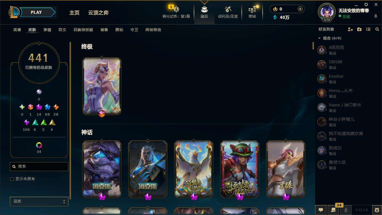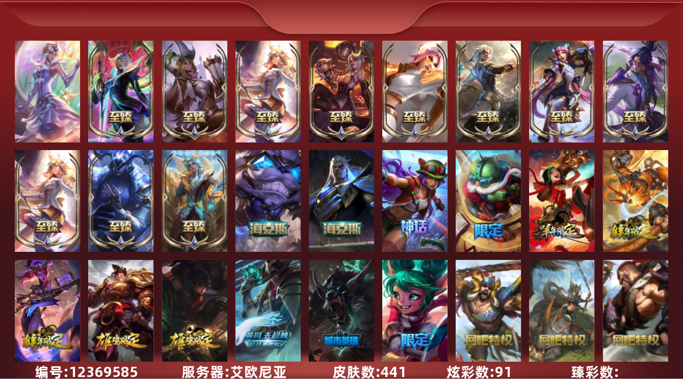【10891261】[12369585]【gpz_961982】 t27734【艾欧尼亚】441皮肤 91炫彩 8臻彩 14神话/68限定/28传说/171英雄 账号等级:570 云顶神话:1 单双排段位:铂金【重要头像】不错哦 【重要皮肤】至高天凯尔至臻 天龙之子伊泽瑞尔至臻 DRX亚托克斯至臻 灵魂莲华易至臻 幻灵战斗猫金克丝至臻 星之守护者索拉卡至臻 福牛守护者菲奥娜至臻