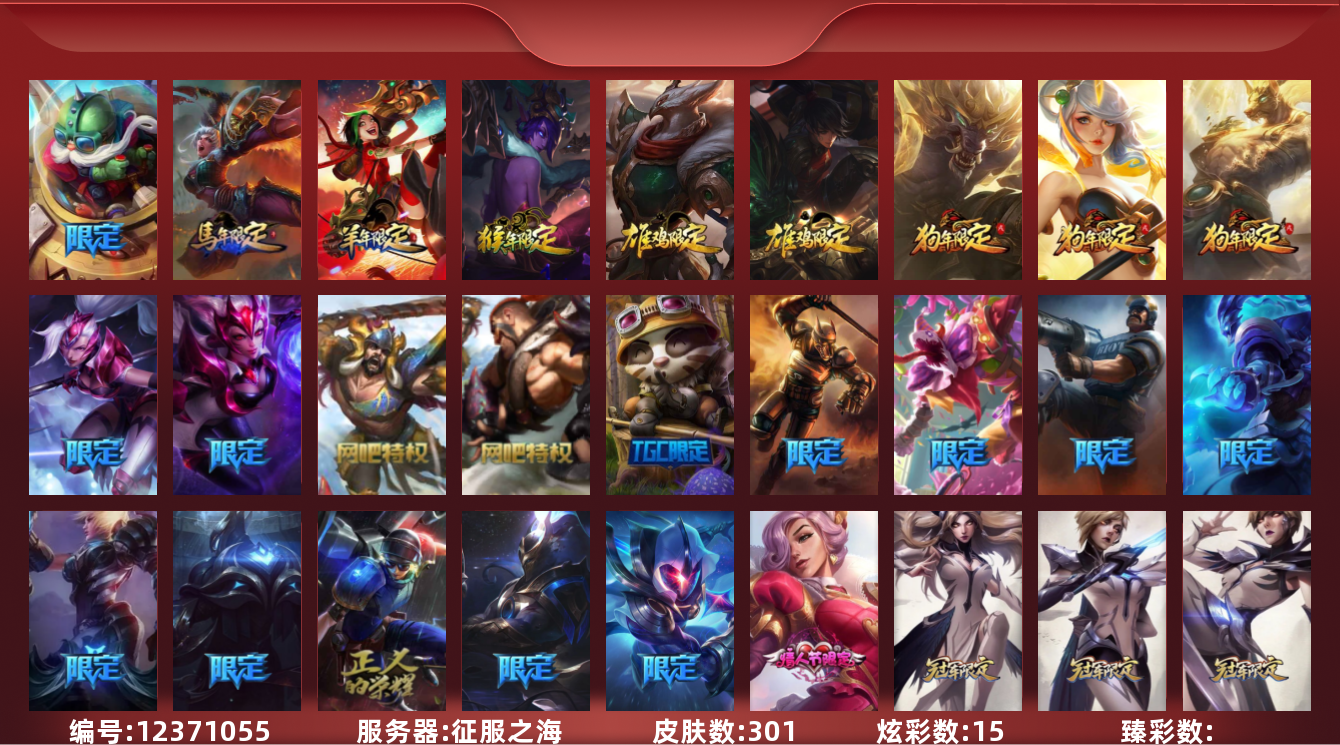 【10891479】[12371055]【gpz_961995】 t27743【征服之海】原皮龙瞎 301皮肤 15炫彩 2臻彩 1神话/61限定/26传说/119英雄 账号等级:135 单双排段位:白银【重要皮肤】胜利剑圣易 电玩勇者锐雯 龙的传人李青 替父从军花木兰 神龙烈焰金克丝 春晖神女拉克丝 北辰之威内瑟斯 南天之怒沃里克 紫金罗刹莫甘娜 虎痴之拳蔚 司马懿仲达