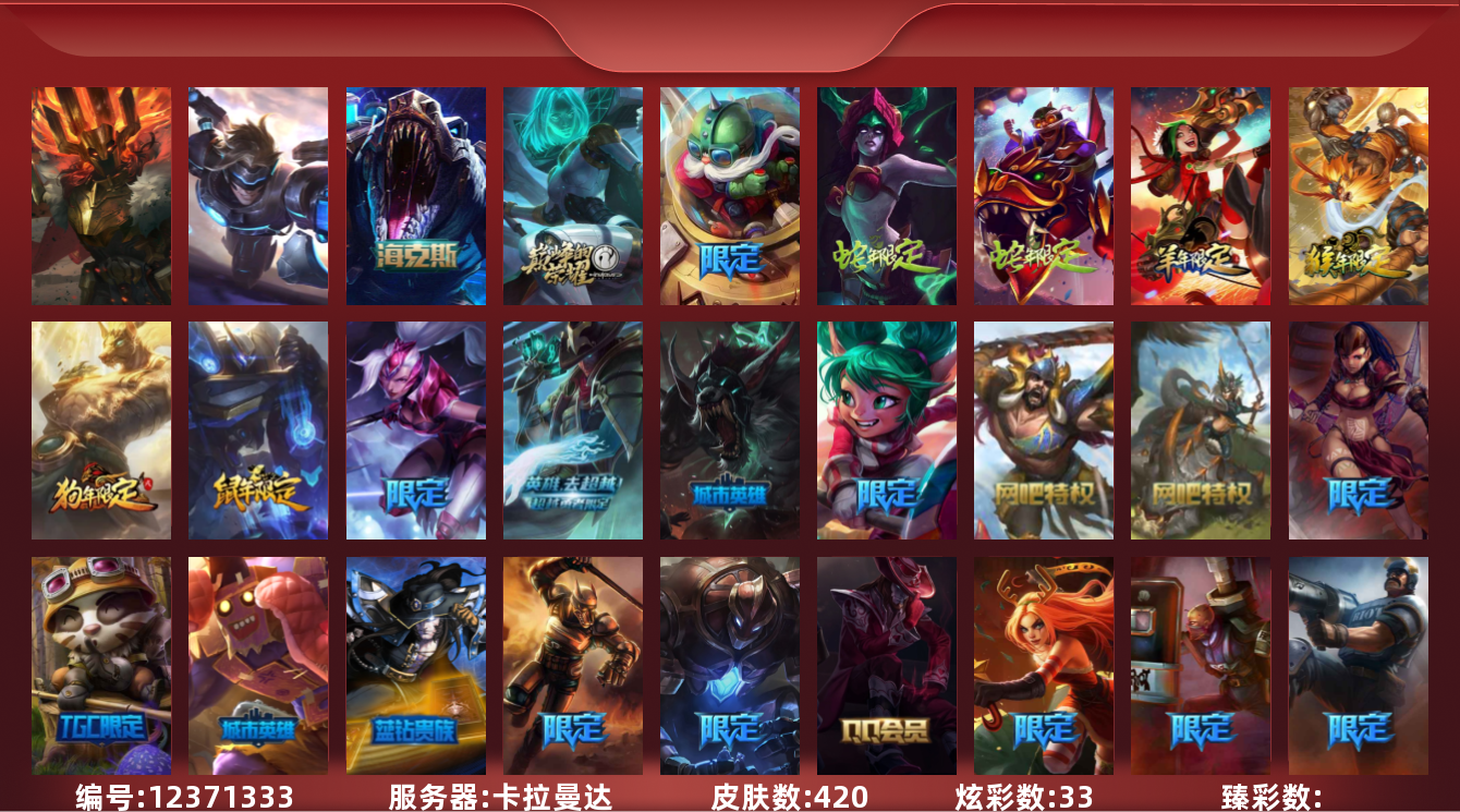 【10891547】[12371333]【gpz_960979】 t27406【卡拉曼达】420皮肤 33炫彩 1臻彩 3神话/80限定/42传说/148英雄 账号等级:238【重要头像】爱意绵绵 心型钥匙 觅心之翼奎因 救生圈 SSG伊泽瑞尔 【重要皮肤】海克斯科技雷克顿 胜利女神希维尔 舞会公主安妮 安妮梦游仙境 勇敢的心德莱厄斯 电玩女神厄运小姐 电玩勇者锐雯 神