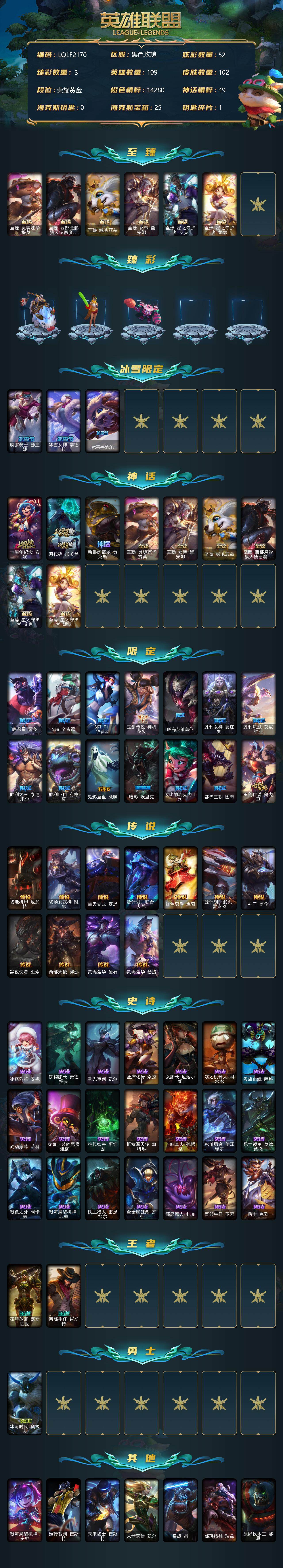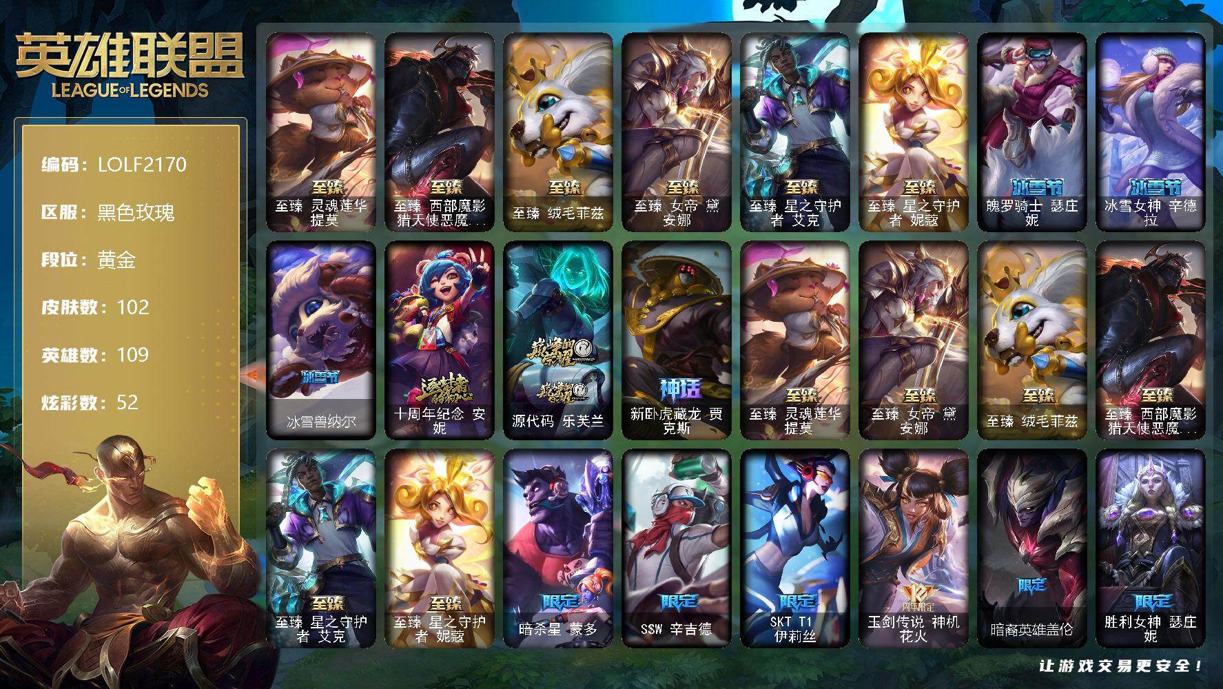 【10891832】【LOLF2170】109英雄/102皮肤/9神话/17限定/3臻彩/52炫彩/11传说/21史诗/黄金/至臻灵魂莲华提莫/至臻西部魔影猎天使恶魔泰隆/至臻绒毛菲兹/至臻女帝黛安娜/至臻星之守护者艾克/至臻星之守护者妮蔻/无畏骑士瑟庄妮赤子初心/泳池派对菲奥娜清凉苹果冰/可爱可爱粉红红布里茨/魄罗骑士瑟庄妮/冰雪女神辛德拉/冰雪兽纳尔/十周年纪念安妮/源代码乐芙兰/新卧虎藏龙