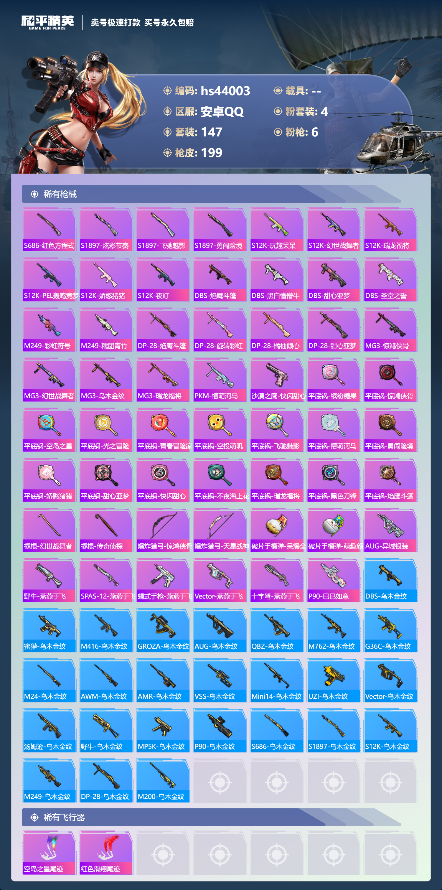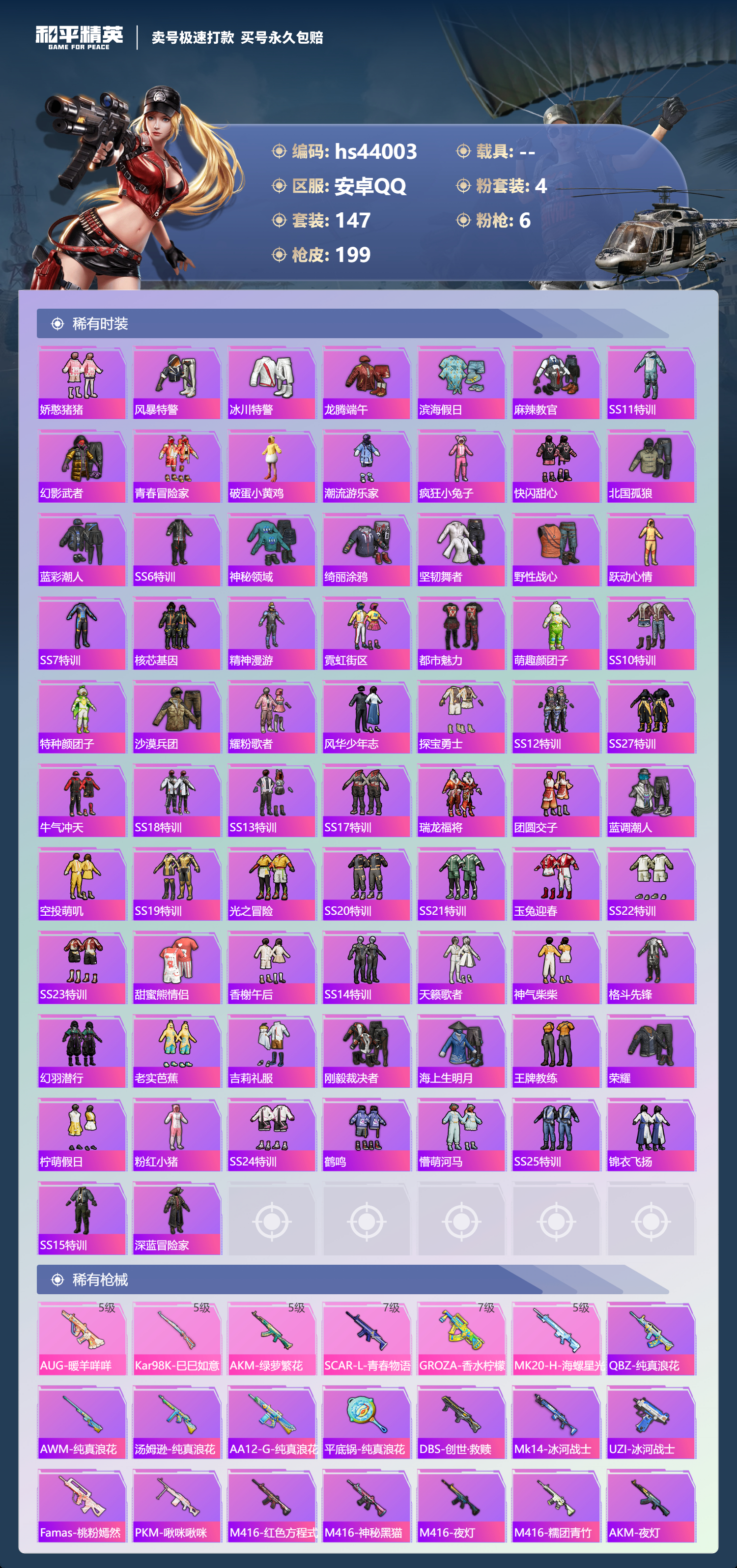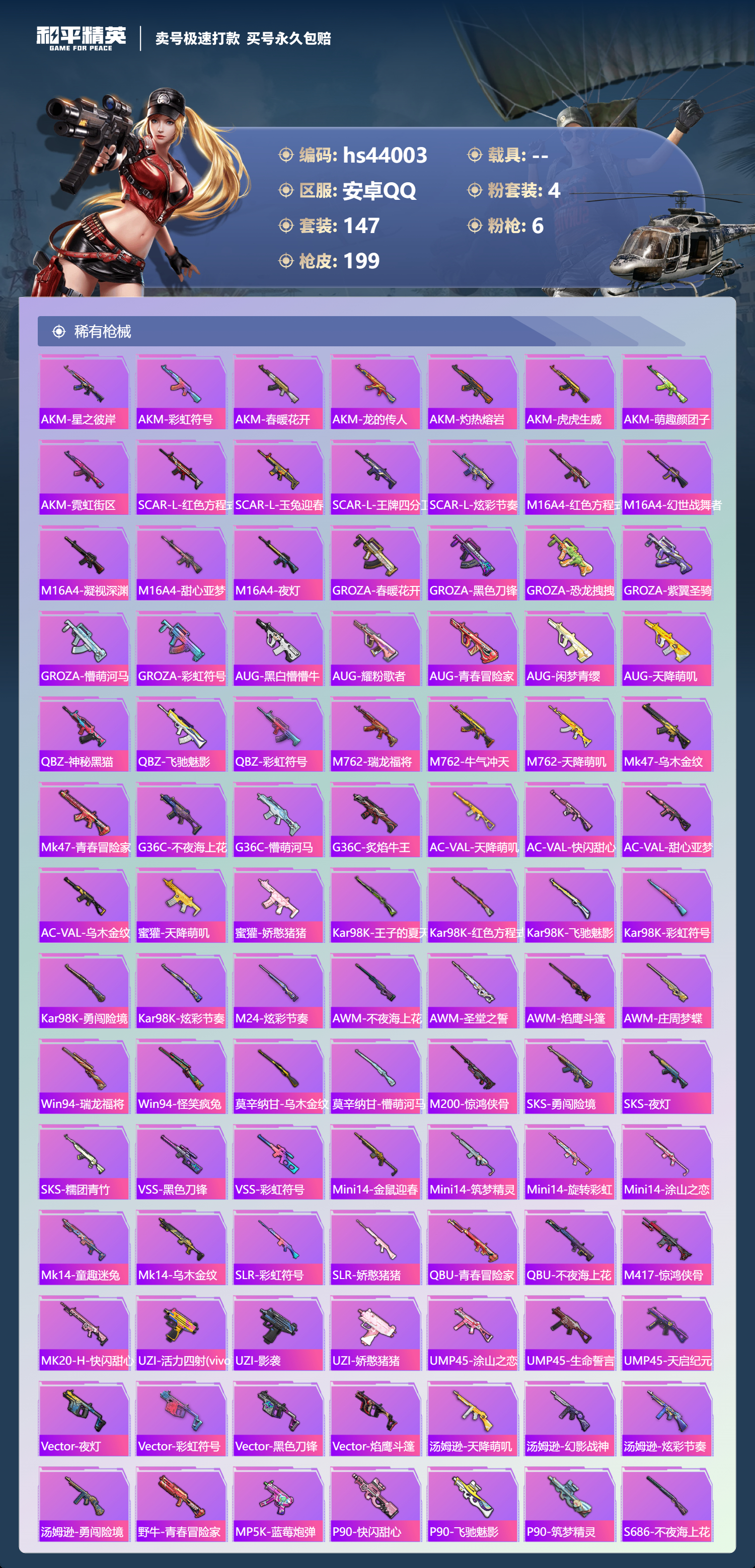 【10893049】【不可二次】【安卓QQ】紫电风暴 龟仙人 AKM-绿萝繁花 沙场疾风 MK20-H-海螺星光 M762-瑞龙福将 黑色刀锋 金羽特工 罗小黑 巡查衣 白月香洋装 粉红小猪 瑞龙福将 GROZA-香水柠檬 风华少年志 SCAR-L-青春物语 雪山精英 团圆交子