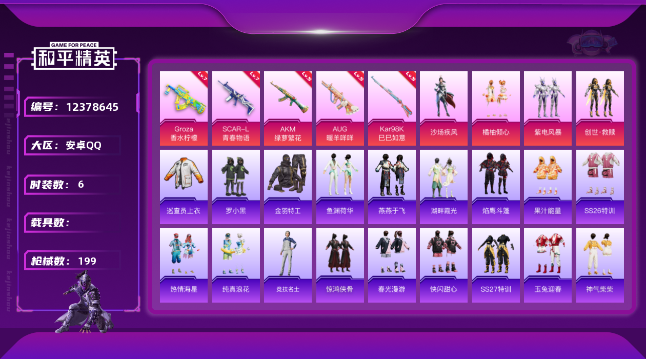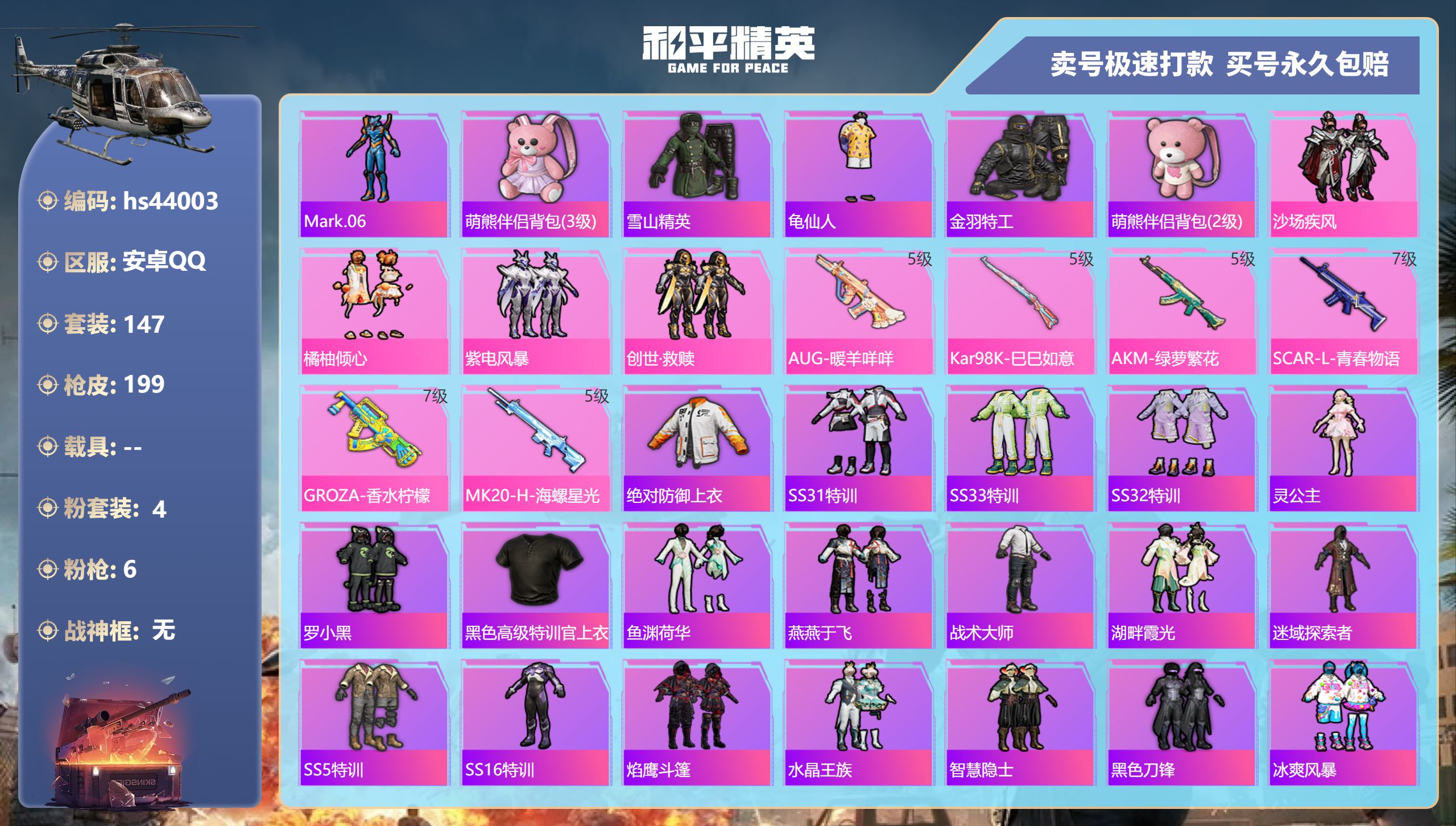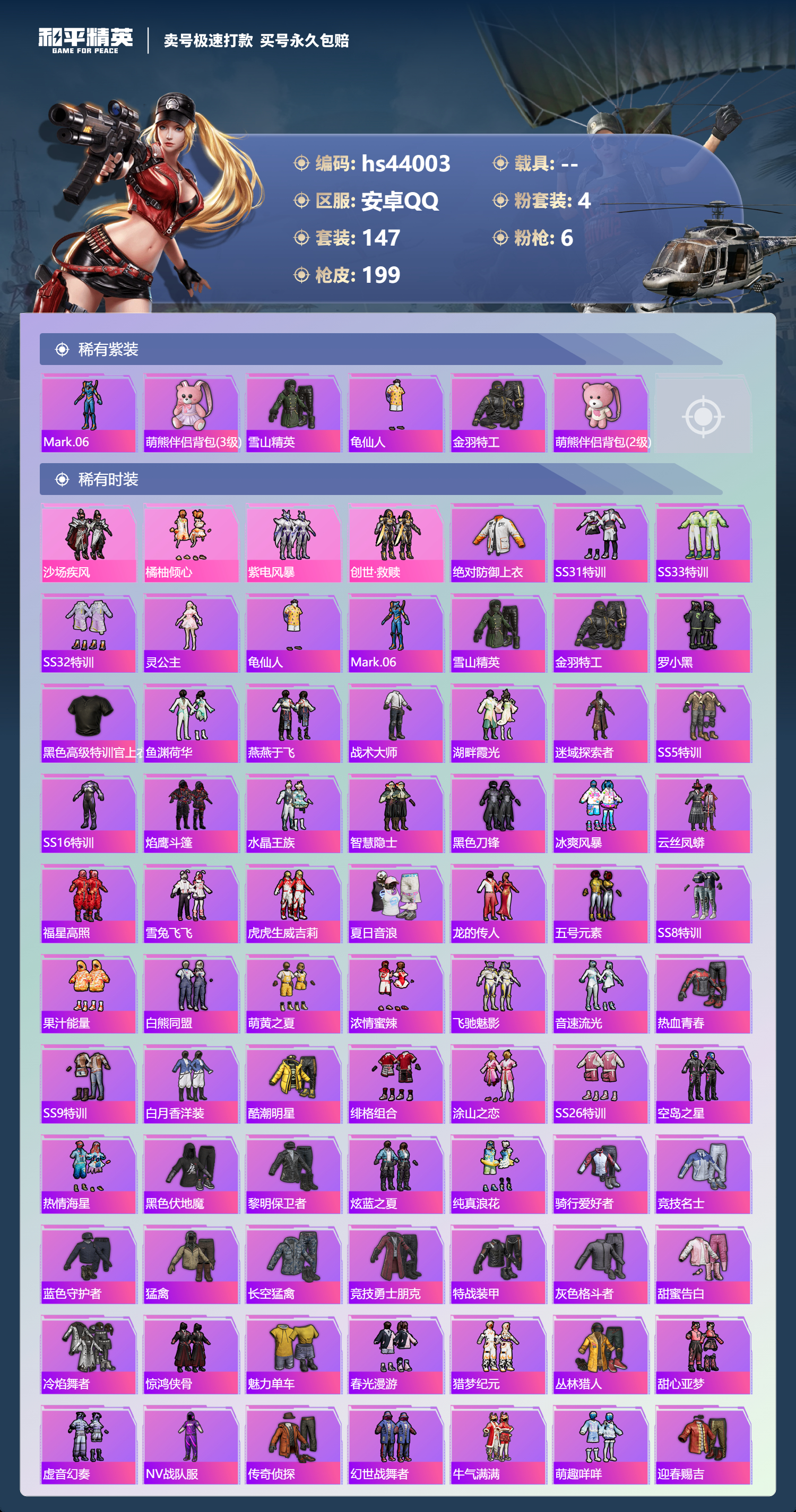 【10893049】【不可二次】【安卓QQ】紫电风暴 龟仙人 AKM-绿萝繁花 沙场疾风 MK20-H-海螺星光 M762-瑞龙福将 黑色刀锋 金羽特工 罗小黑 巡查衣 白月香洋装 粉红小猪 瑞龙福将 GROZA-香水柠檬 风华少年志 SCAR-L-青春物语 雪山精英 团圆交子