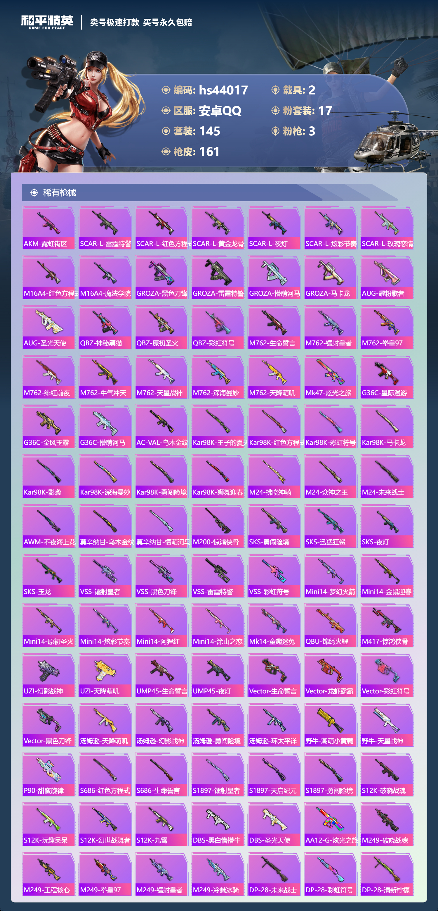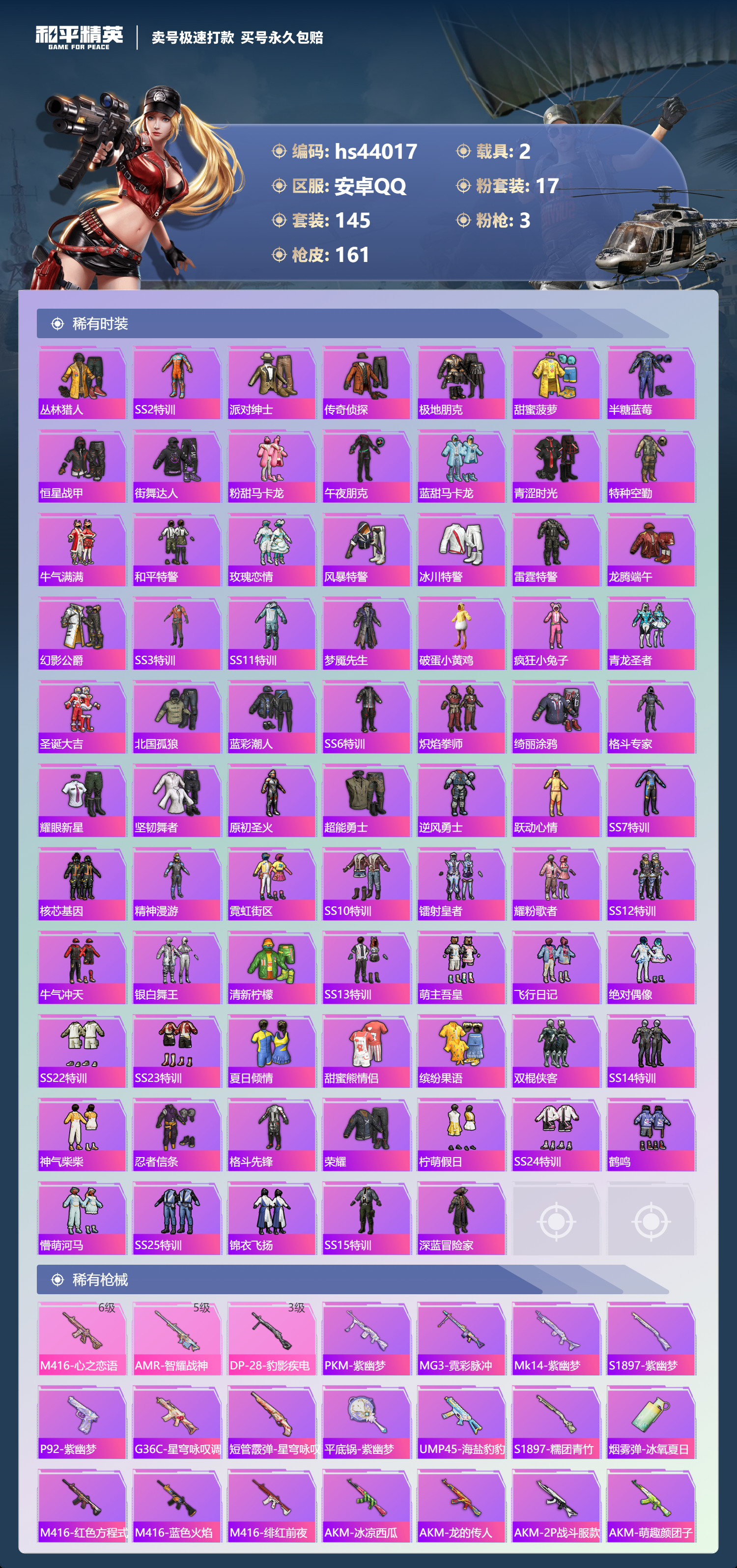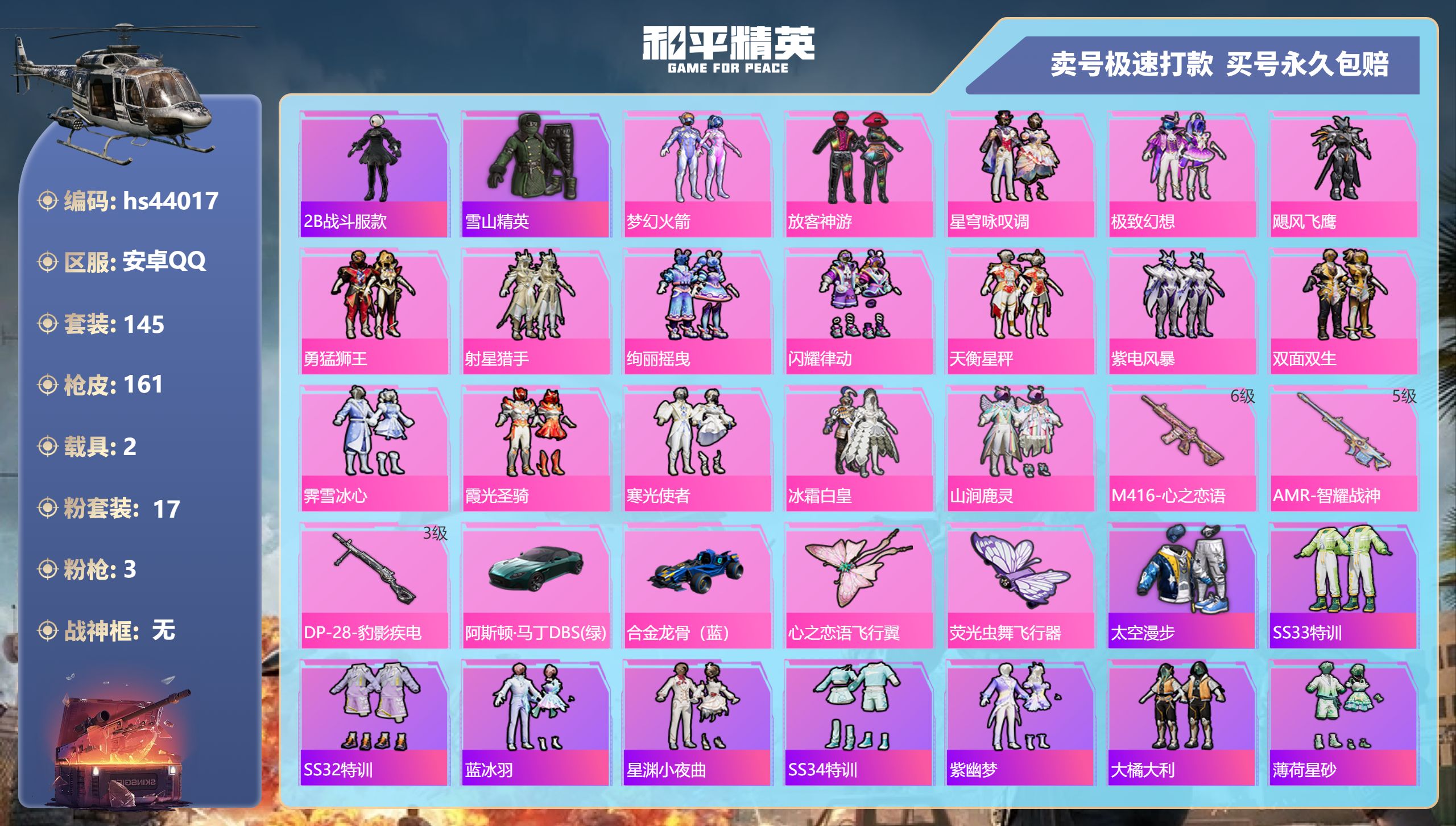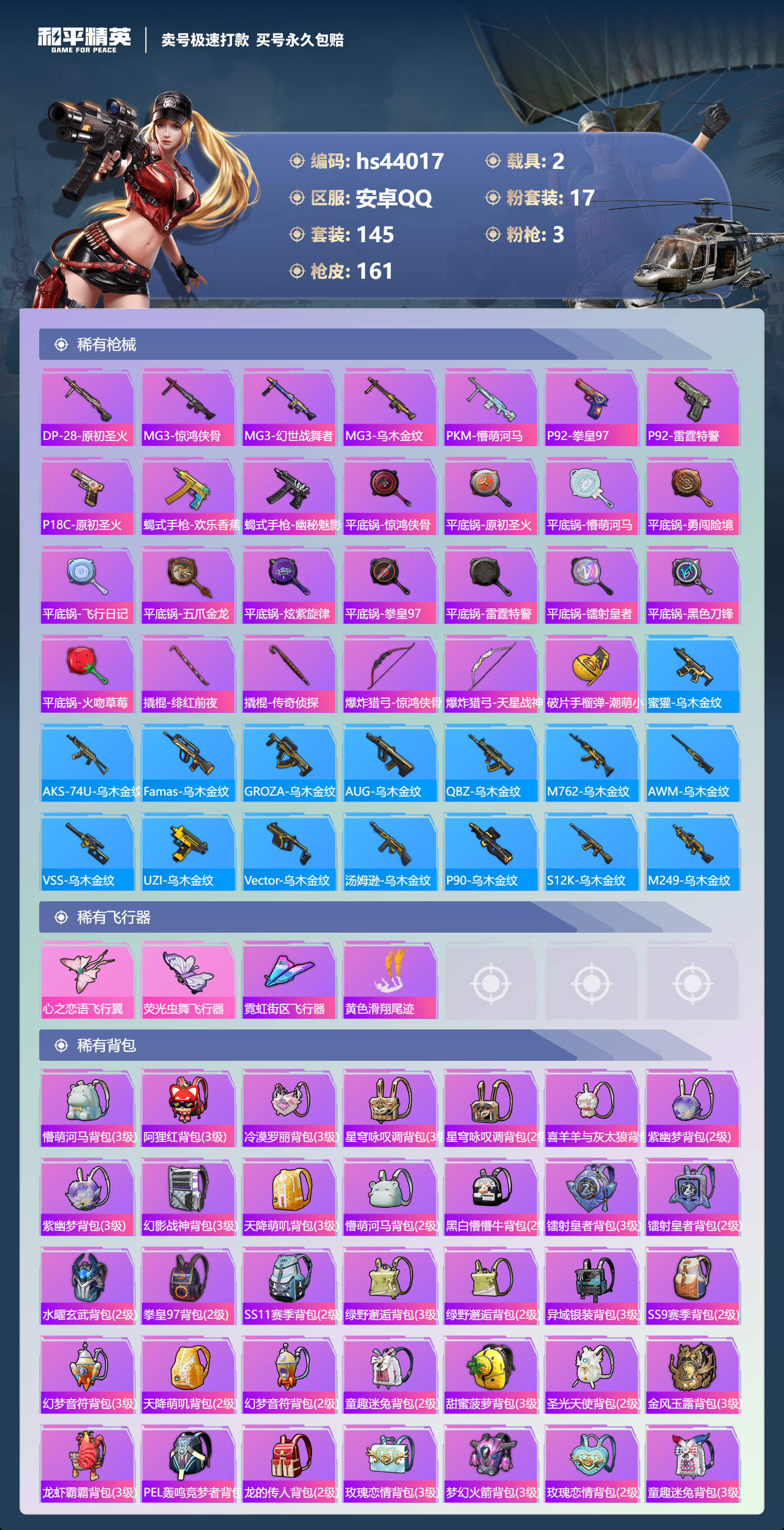 【10893080】【不可二次】【安卓QQ】合金龙骨蓝色 紫电风暴 飓风飞鹰 粉甜马卡龙 阿斯顿马丁S绿色 极致幻想 忍者信条 放客神游 荧光虫舞飞行器 梦幻火箭 软嫩糖心蛋 M416-心之恋语 心之恋语飞行翼 山涧鹿灵 冰霜白皇 雪山精英