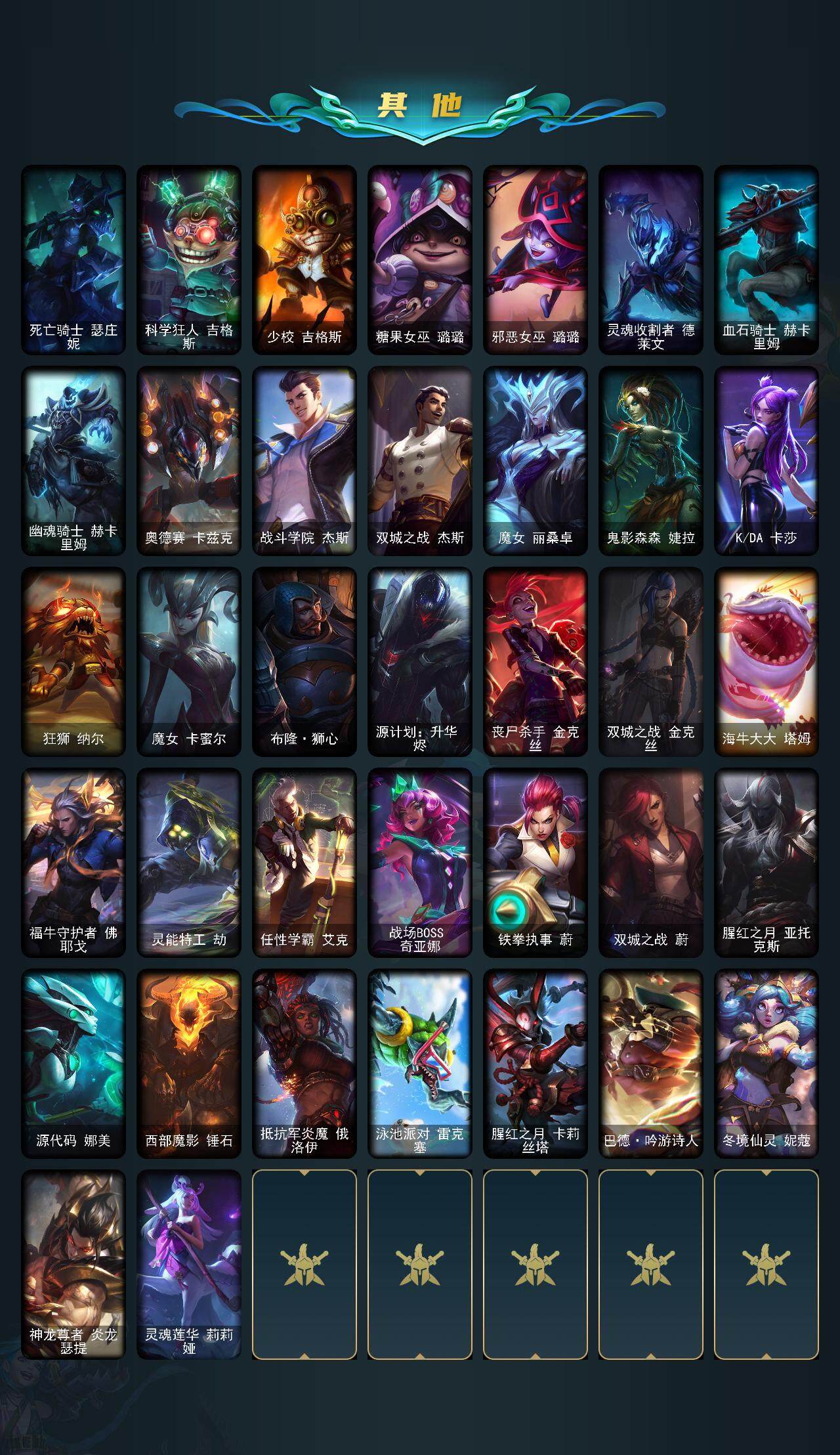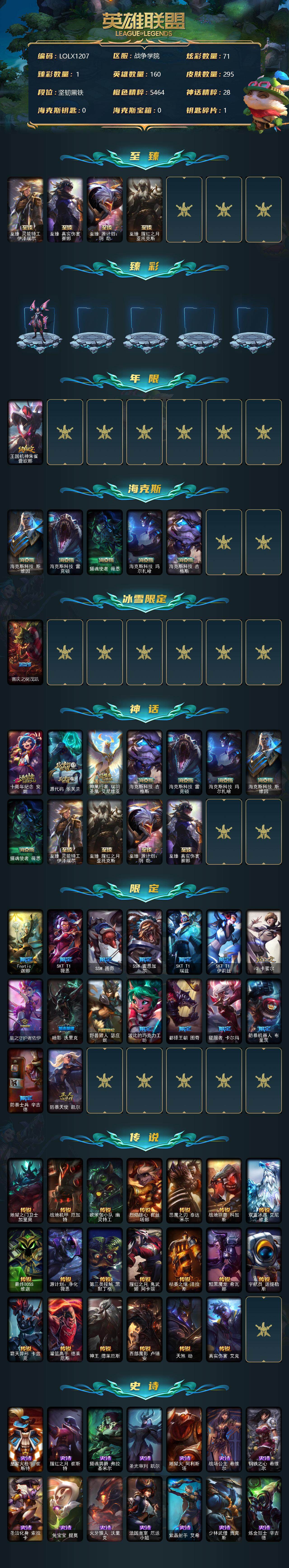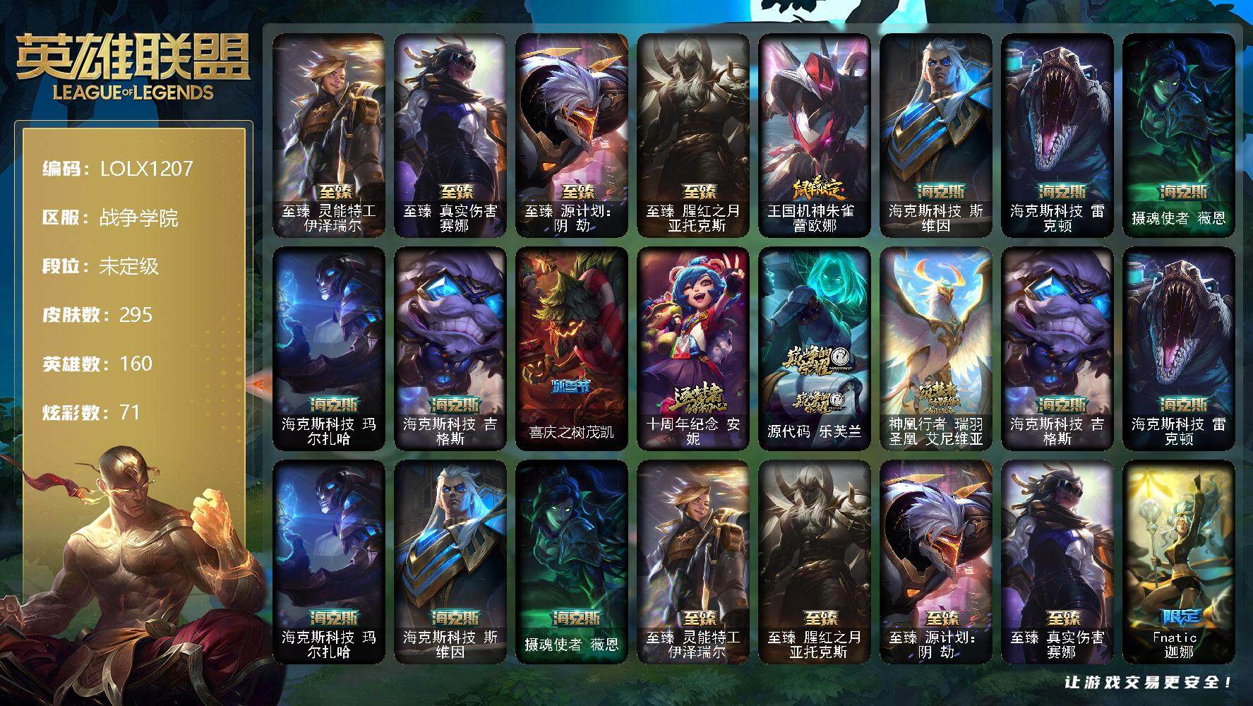 【10893462】【LOLX1207】160英雄/295皮肤/12神话/18限定/1臻彩/71炫彩/20传说/82史诗/未定级/至臻灵能特工伊泽瑞尔/至臻真实伤害赛娜/至臻源计划:阴劫/至臻腥红之月亚托克斯/弹幕天使卡莎炽天使勇敢/王国机神朱雀蕾欧娜/海克斯科技斯维因/海克斯科技雷克顿/摄魂使者薇恩/海克斯科技玛尔扎哈/海克斯科技吉格斯/喜庆之树茂凯/十周年纪念安妮/源代码乐芙兰/神凰行者瑞羽