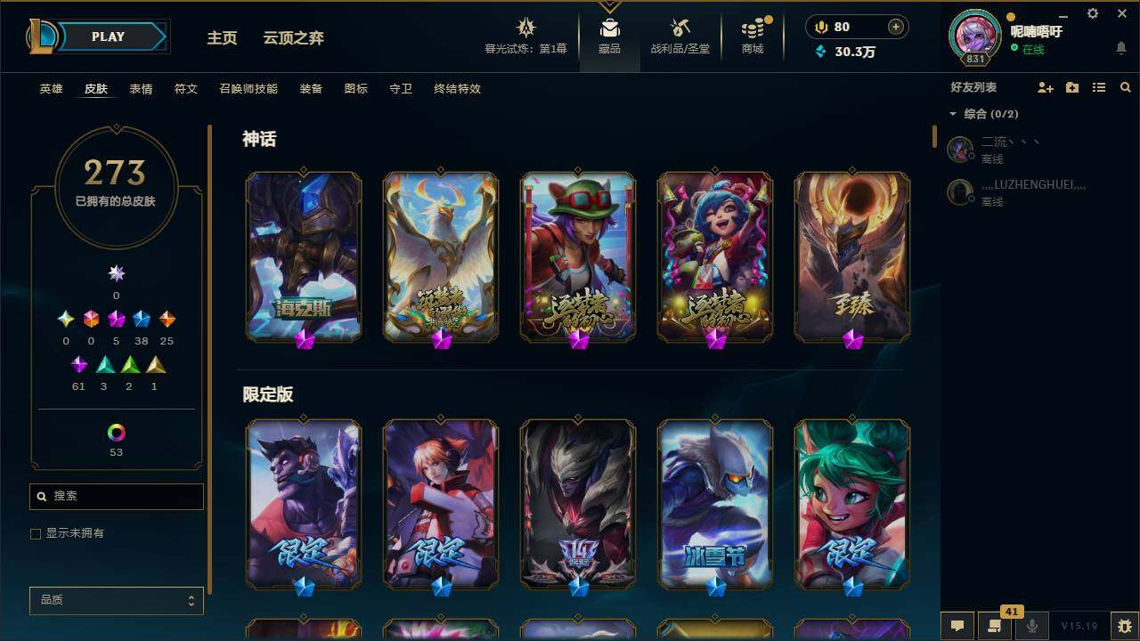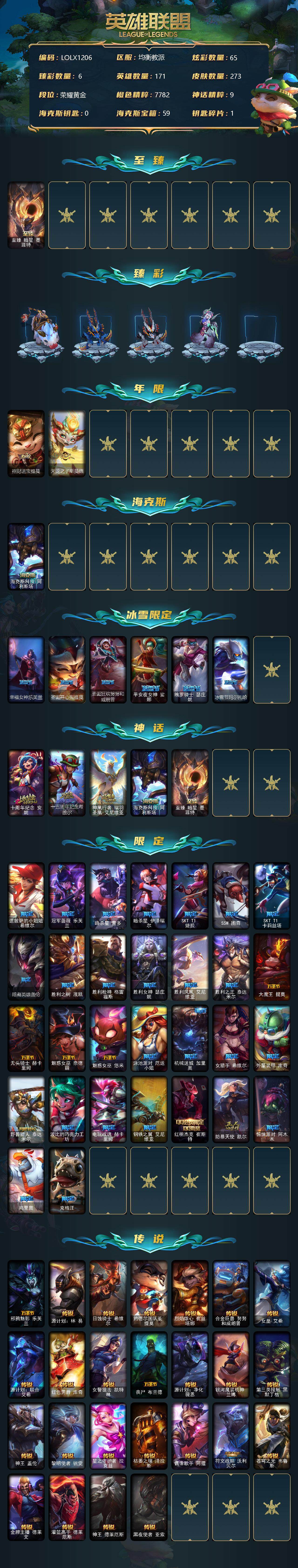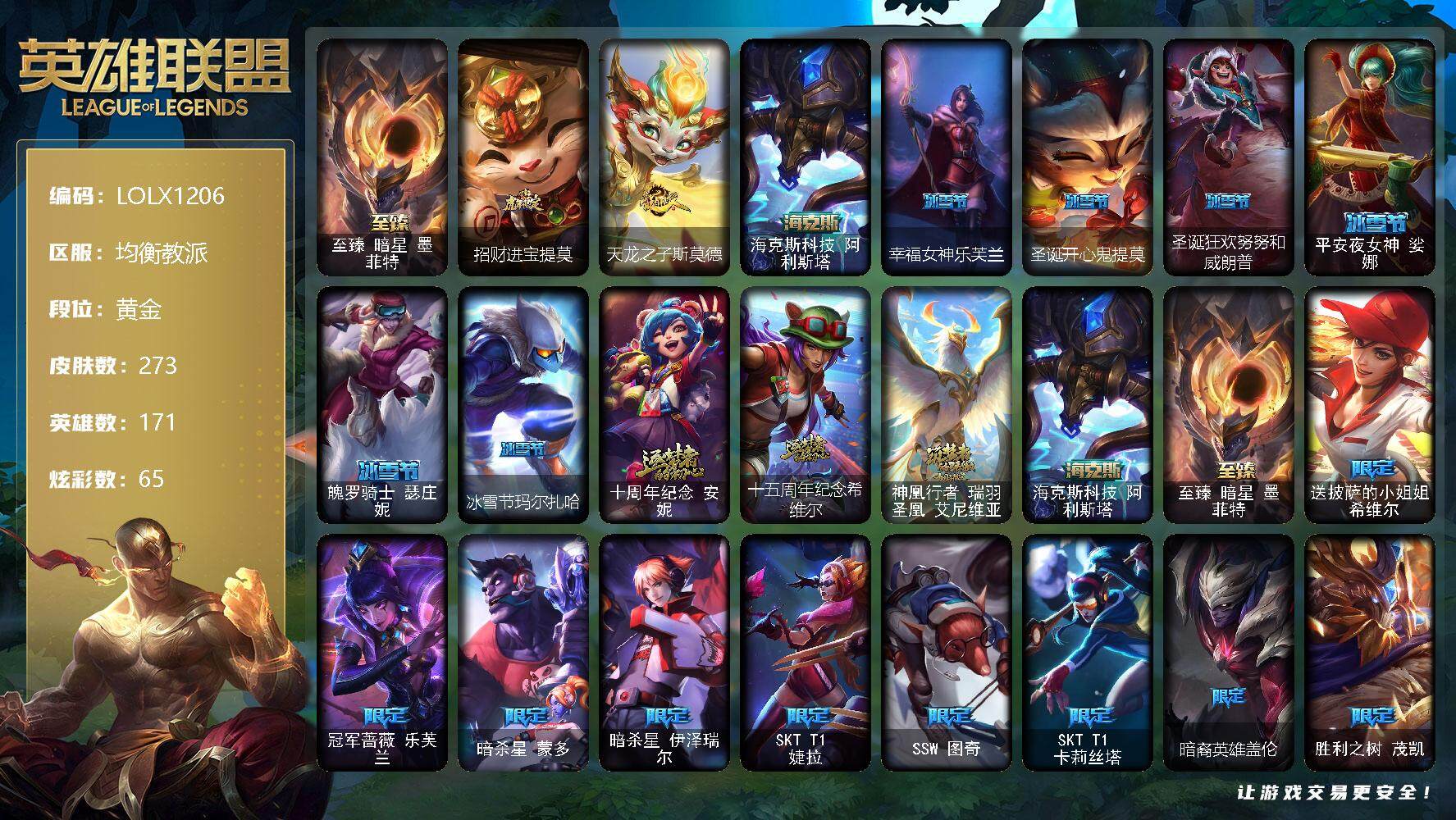 【10893468】【LOLX1206】171英雄/273皮肤/5神话/38限定/6臻彩/65炫彩/25传说/61史诗/黄金账号等级:831/至臻暗星墨菲特/无畏骑士瑟庄妮赤子初心/霸天异形卡兹克掠空魅影/霸天异形卡兹克刹那银光/战斗学院盖伦不死鸟/魔女阿卡丽虚荣/净雪之月莫甘娜冬虹/招财进宝提莫/天龙之子斯莫德/海克斯科技阿利斯塔/幸福女神乐芙兰/圣诞开心鬼提莫/圣诞狂欢努努和威朗普/平安夜女