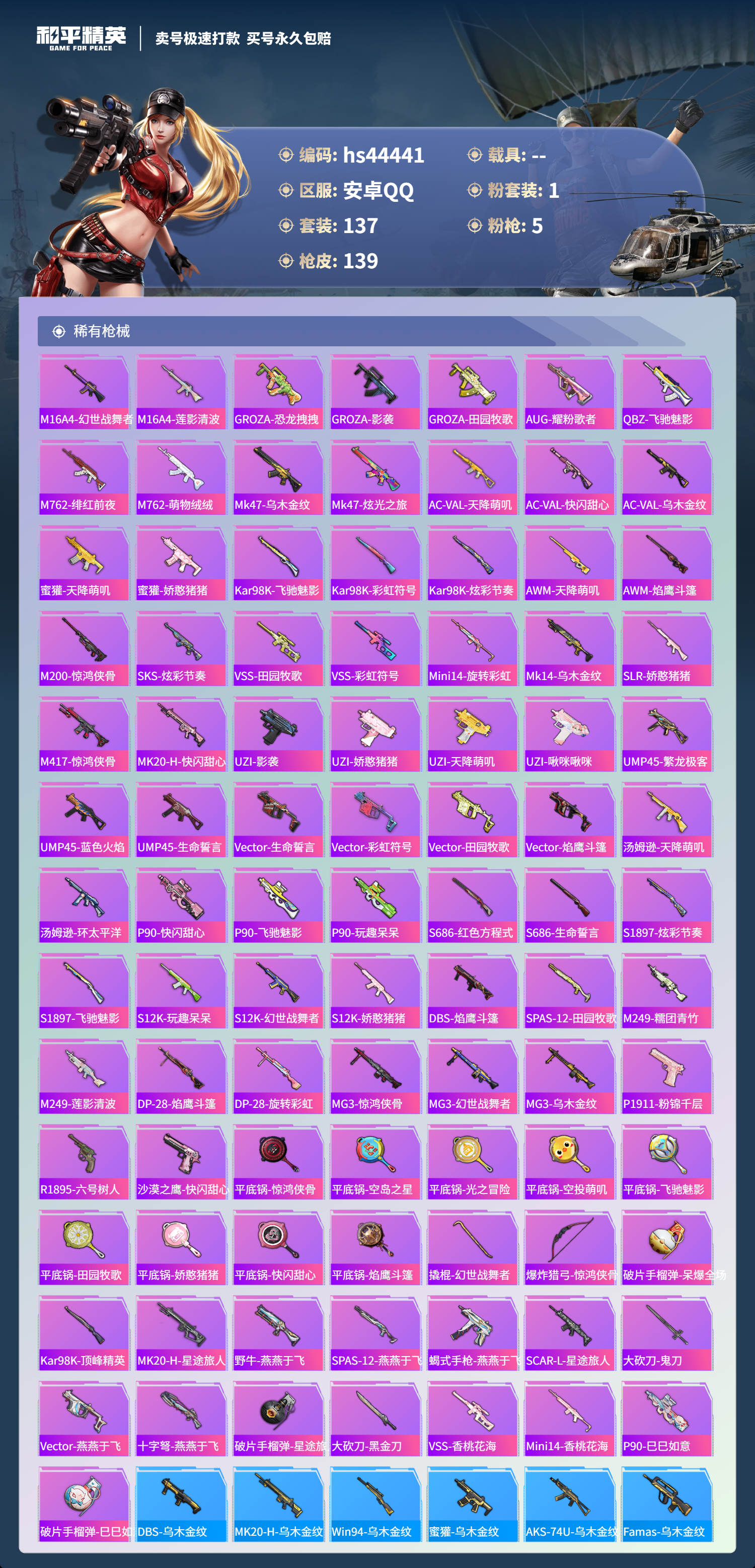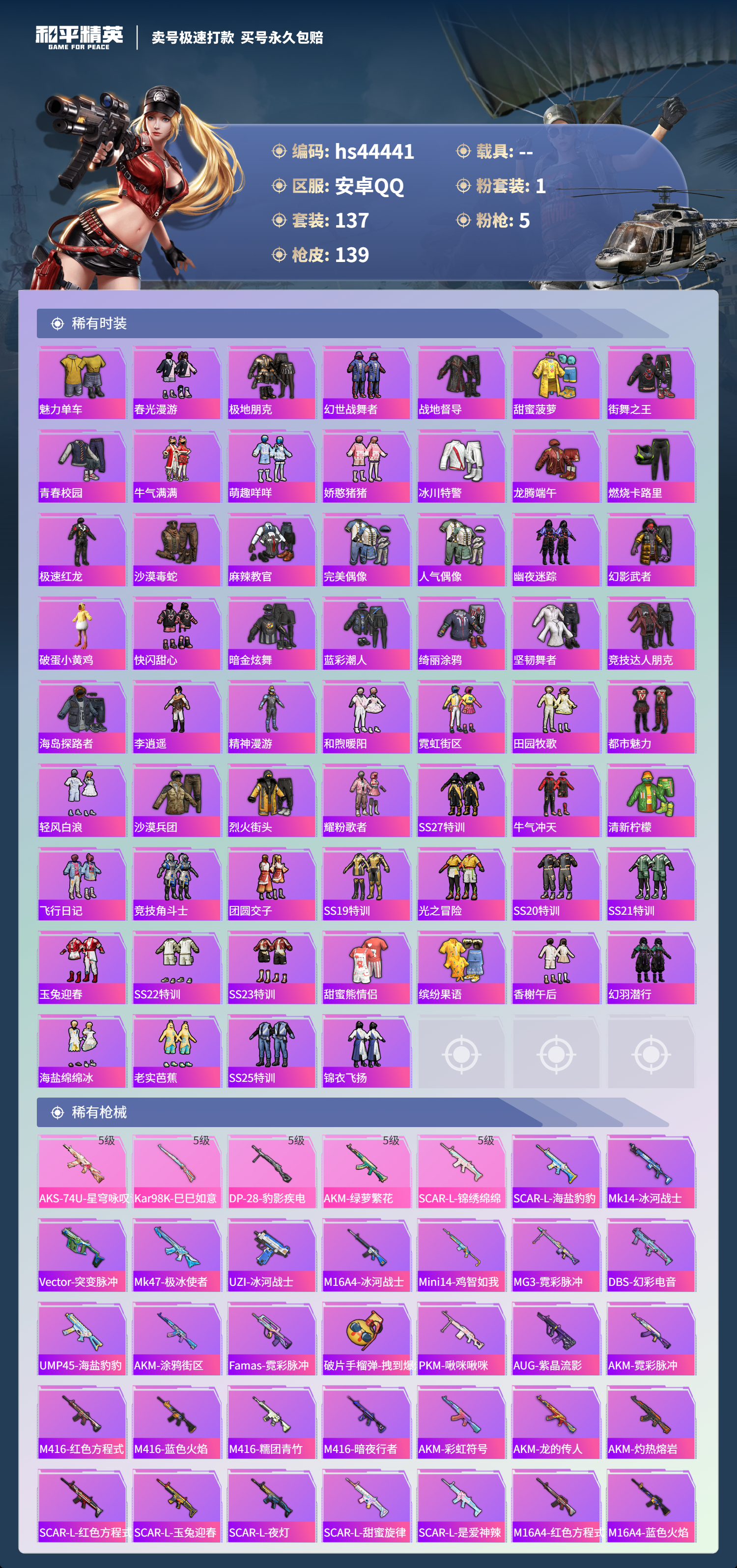 【10893753】【可二次】【安卓QQ】SCAR-L-锦绣绵绵 龟仙人 AKM-绿萝繁花 狂沙舞者 极速红龙 浪漫天命 暗影哥特 雪山精英 团圆交子
