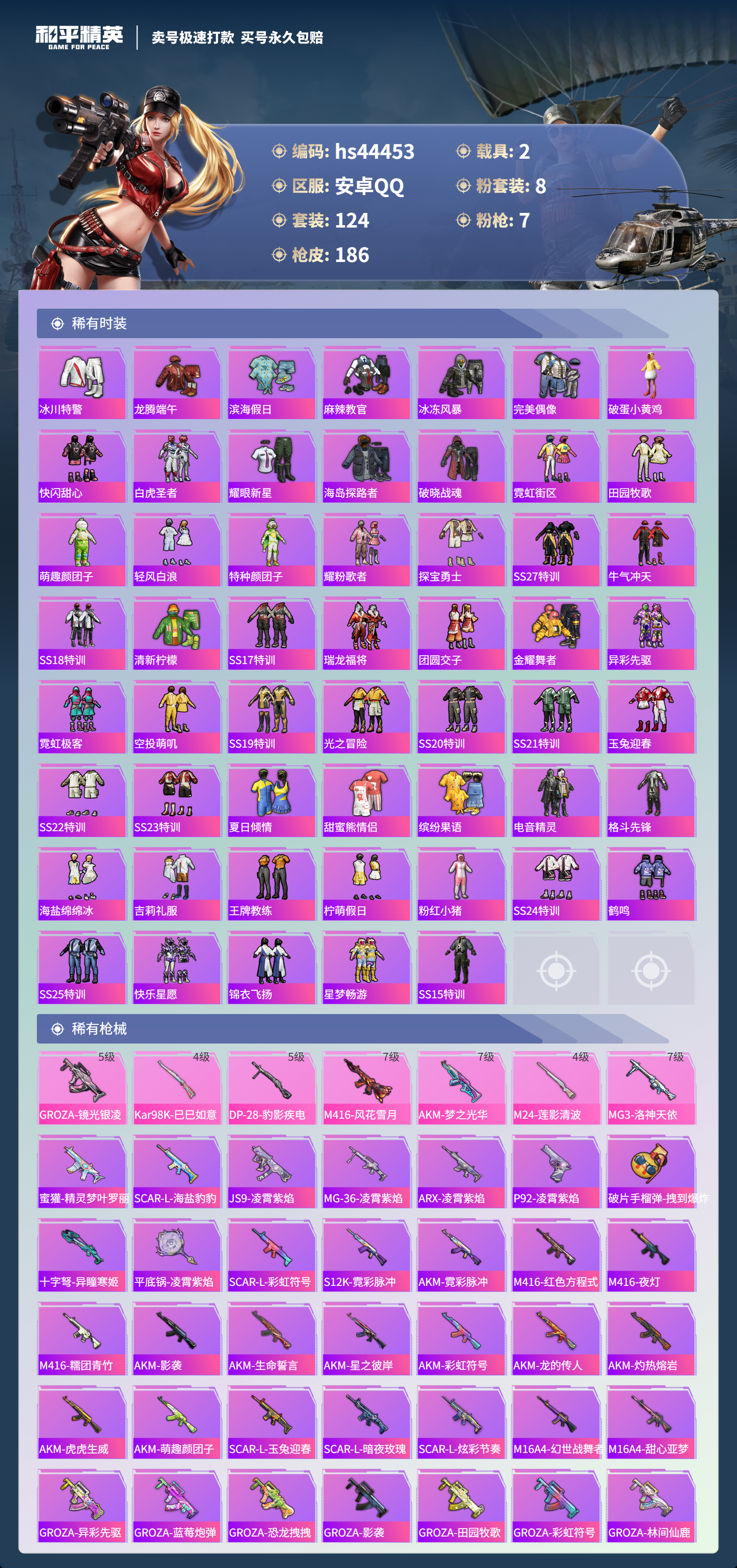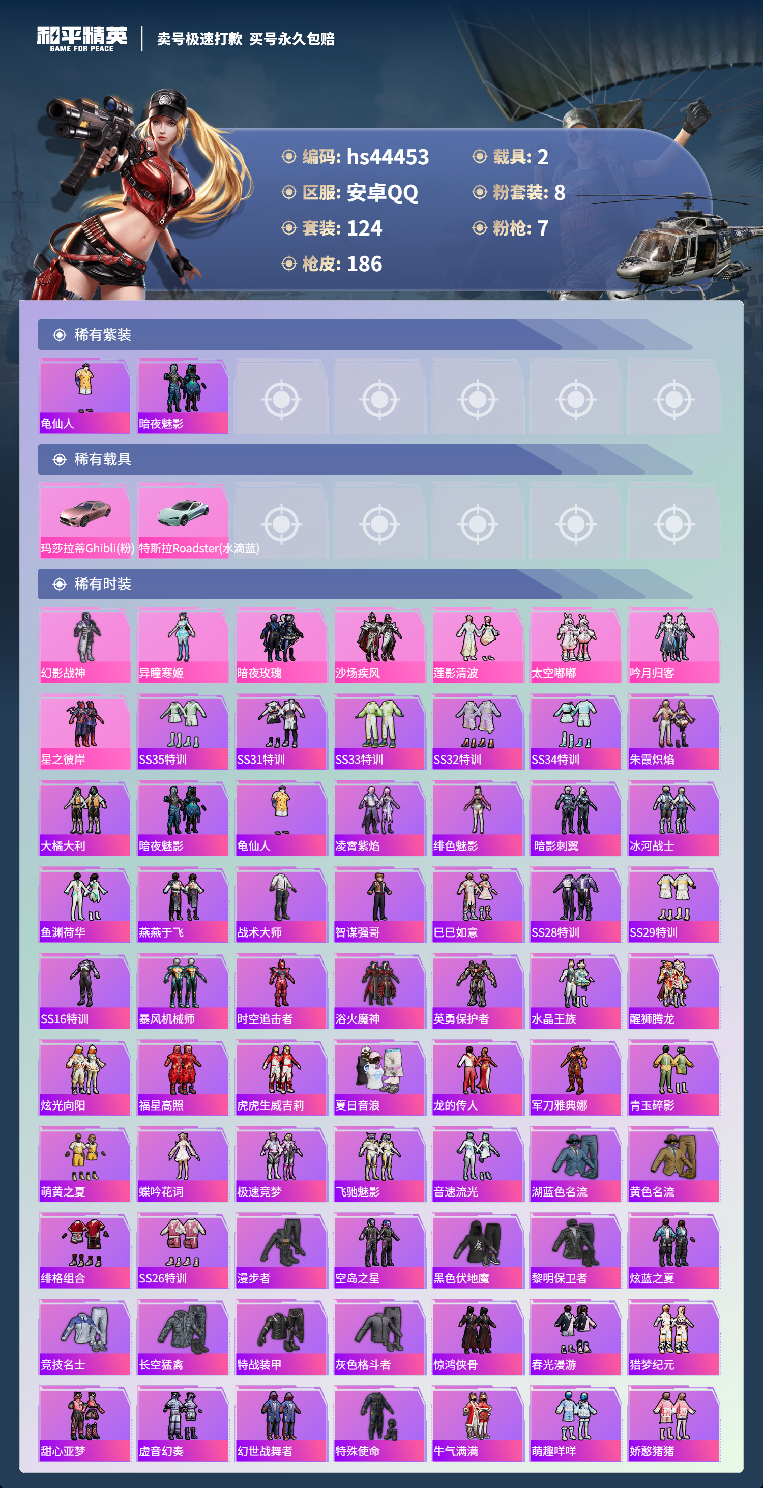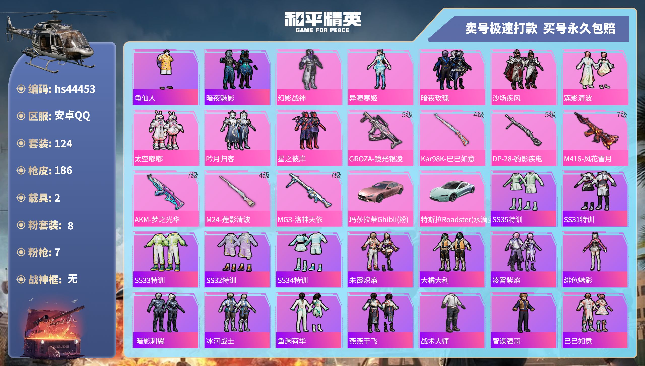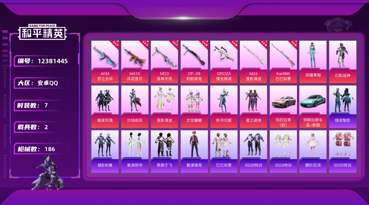 【10893769】【可二次】【安卓QQ】龟仙人 沙场疾风 M24-莲影清波 漫步者 M762-瑞龙福将 MG3-洛神天依 M762-风花雪月 吟月归客 M416-风花雪月 暗夜玫瑰 AKM-梦之光华 星之彼岸 GROZA-林间仙鹿 粉红小猪 幻影战神 瑞龙福将 玛莎拉蒂粉色 特斯拉R水滴蓝 醒狮腾龙 团圆交子