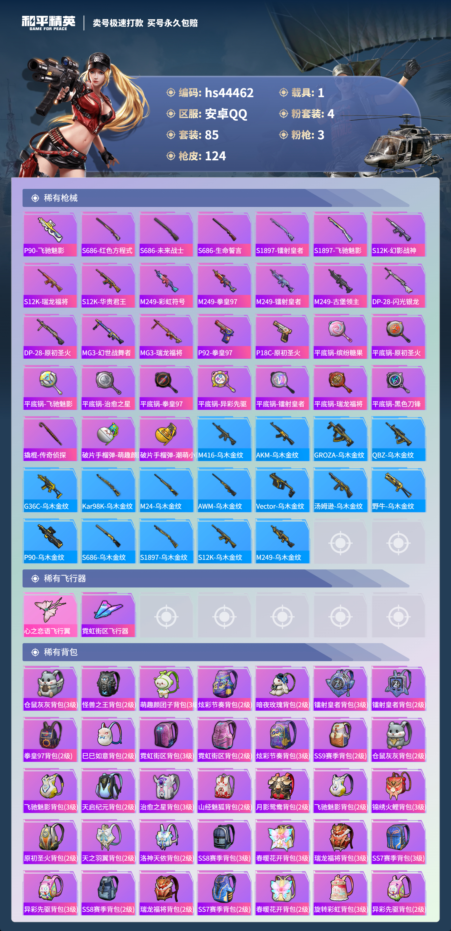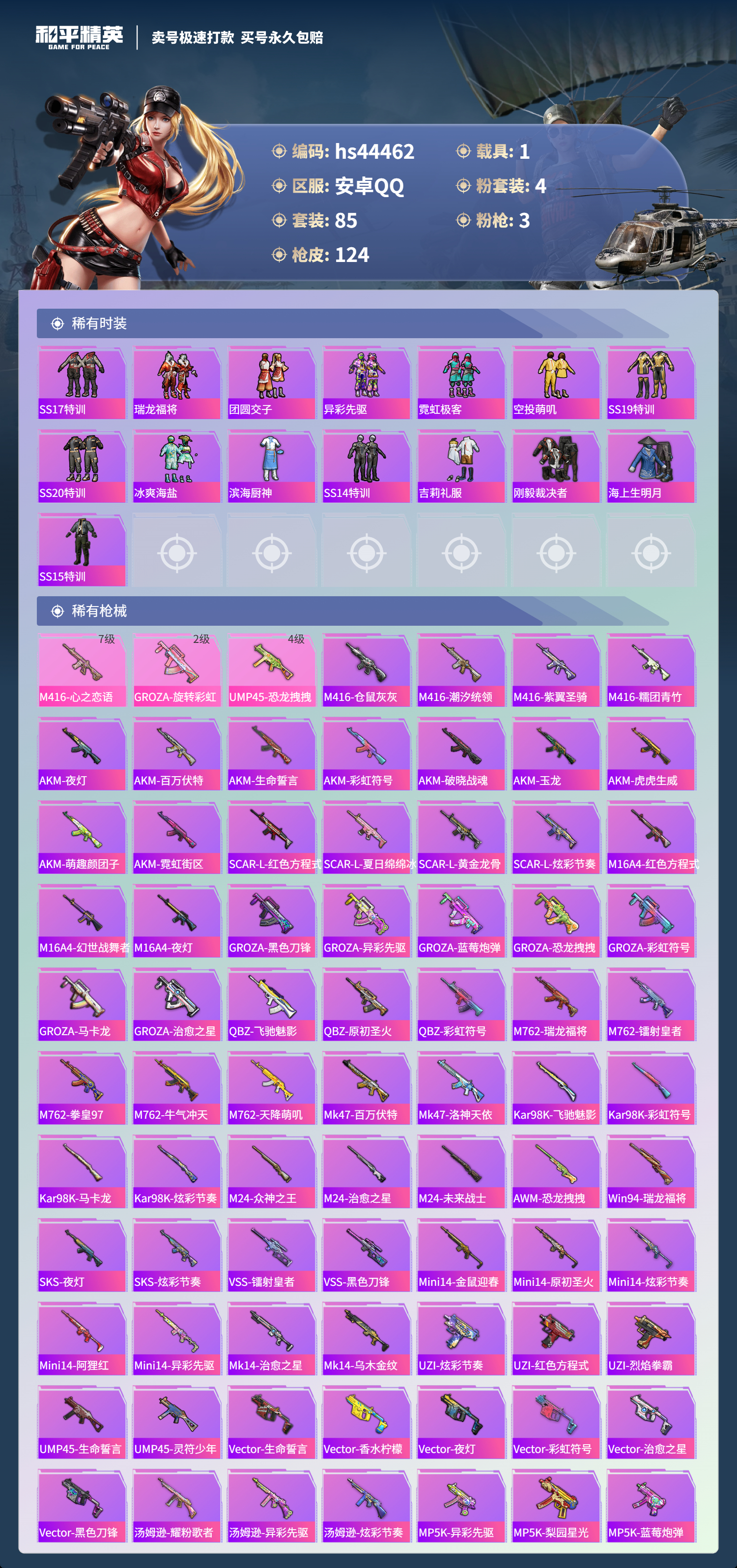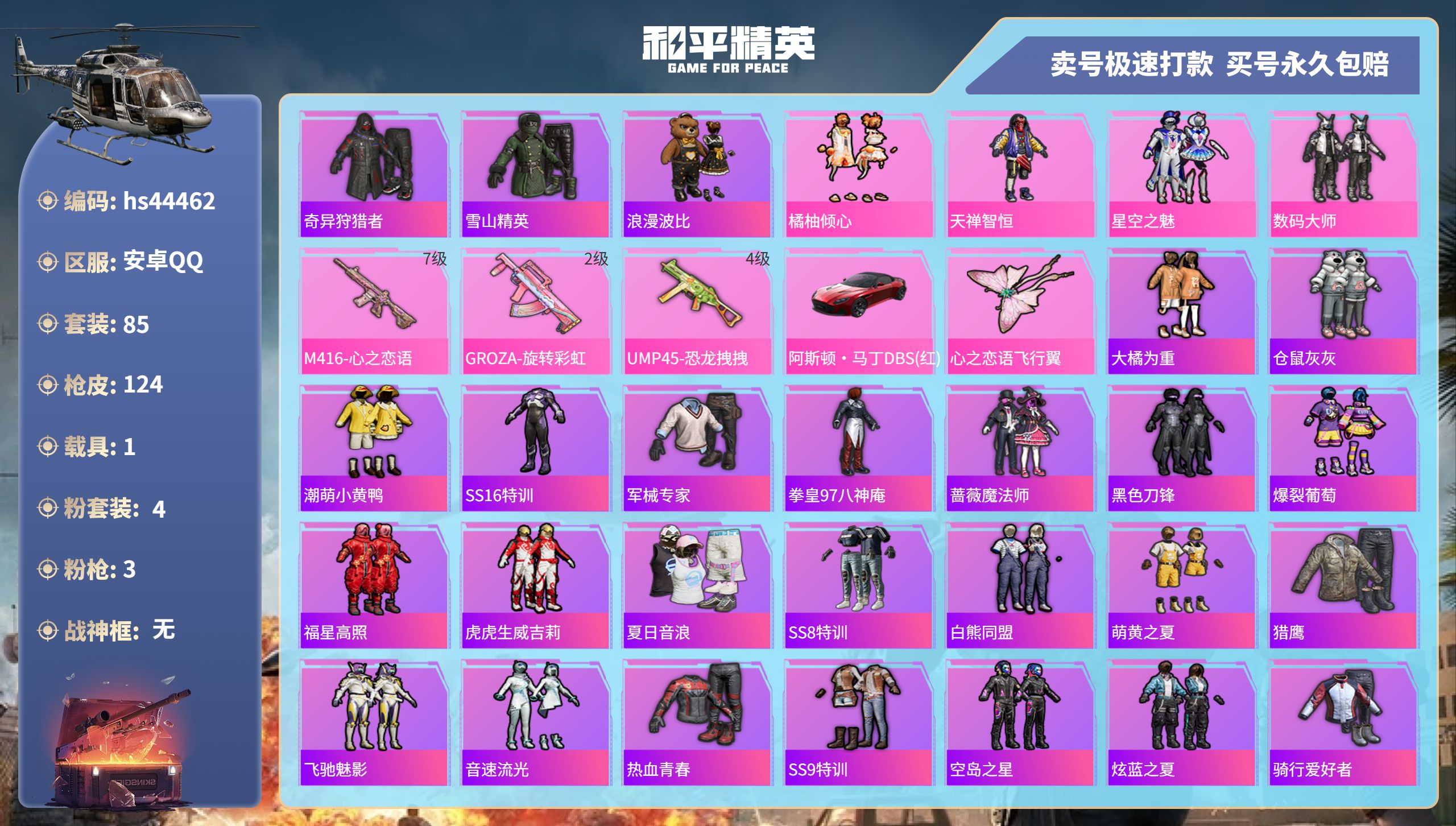 【10893777】【可二次】【安卓QQ】大橘为重 粉甜马卡龙 奇异狩猎者 M249-古堡领主 M762-瑞龙福将 天禅智恒 潮萌小黄鸭 黑色刀锋 极速红龙 UMP45-恐龙拽拽 星空之魅 仓鼠灰灰 M416-仓鼠灰灰 M416-心之恋语 阿斯顿马丁S红色 AKM-百万伏特 心之恋语飞行翼 数码大师 浪漫波比 瑞龙福将 激萌小黄鸭 GROZA-旋转彩虹 雪山精英 团圆交子