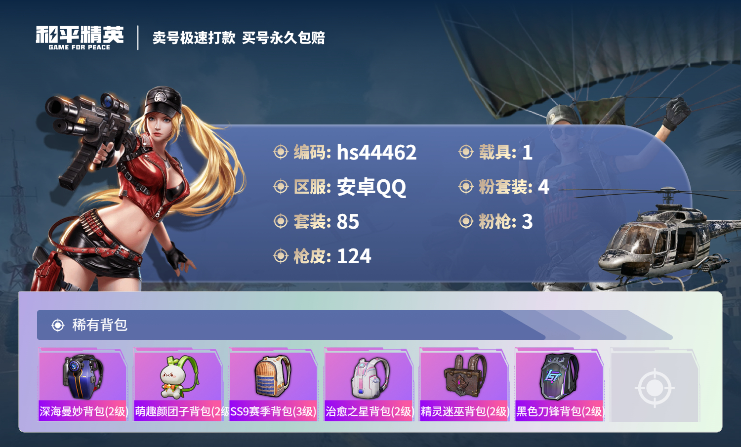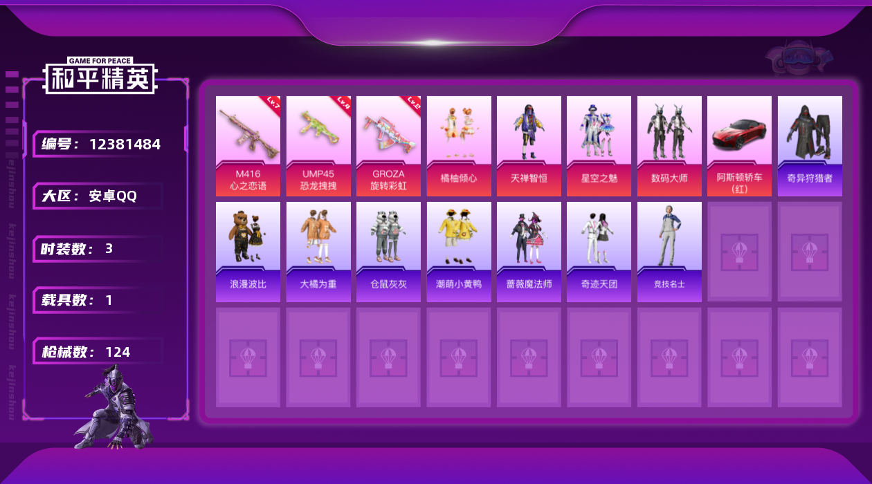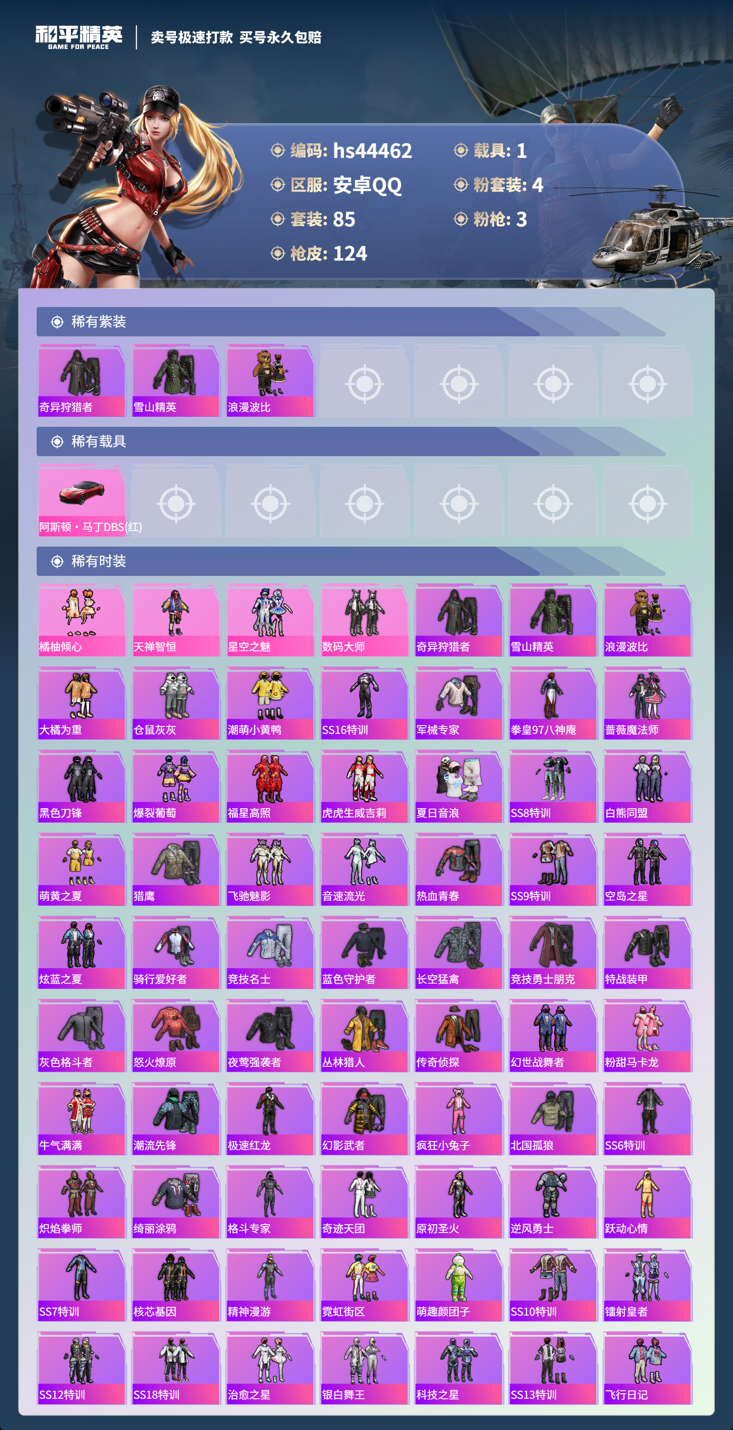 【10893777】【可二次】【安卓QQ】大橘为重 粉甜马卡龙 奇异狩猎者 M249-古堡领主 M762-瑞龙福将 天禅智恒 潮萌小黄鸭 黑色刀锋 极速红龙 UMP45-恐龙拽拽 星空之魅 仓鼠灰灰 M416-仓鼠灰灰 M416-心之恋语 阿斯顿马丁S红色 AKM-百万伏特 心之恋语飞行翼 数码大师 浪漫波比 瑞龙福将 激萌小黄鸭 GROZA-旋转彩虹 雪山精英 团圆交子