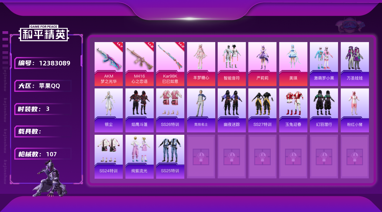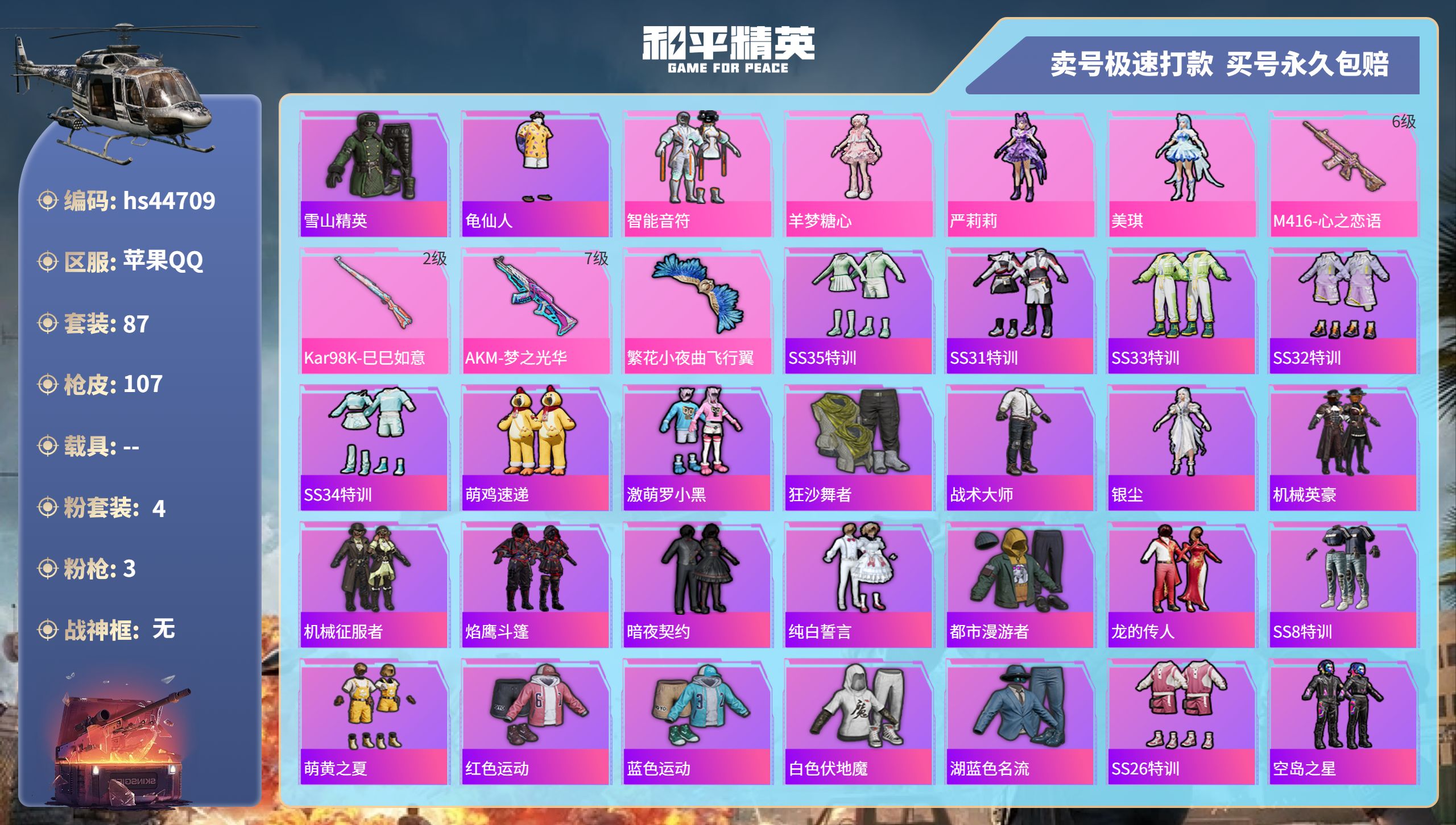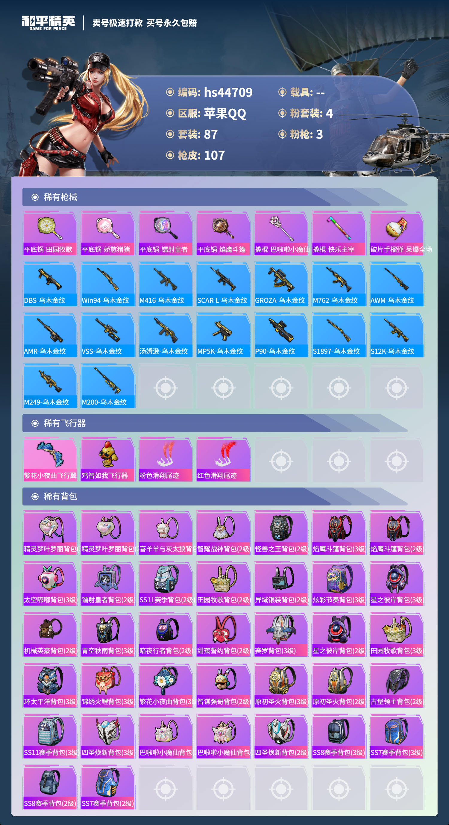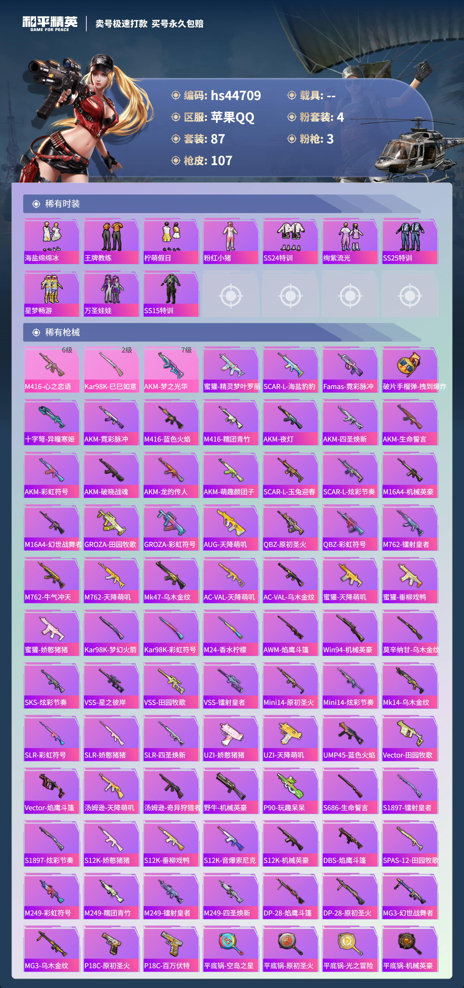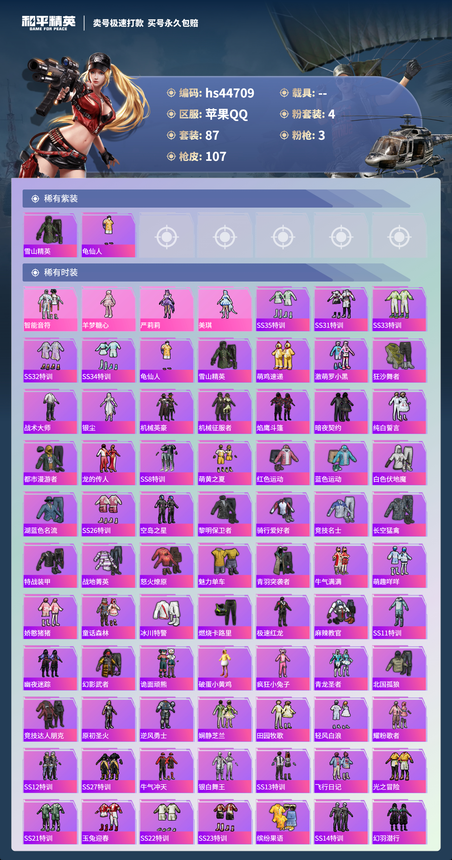 【10894177】【不可二次】【苹果QQ】龟仙人 暗夜契约 机械英豪 狂沙舞者 极速红龙 诡面顽熊 娴静芝兰 繁花小夜曲飞行翼 AKM-梦之光华 M416-心之恋语 童话森林 粉红小猪 M24-香水柠檬 智能音符 雪山精英 激萌罗小黑 纯白誓言