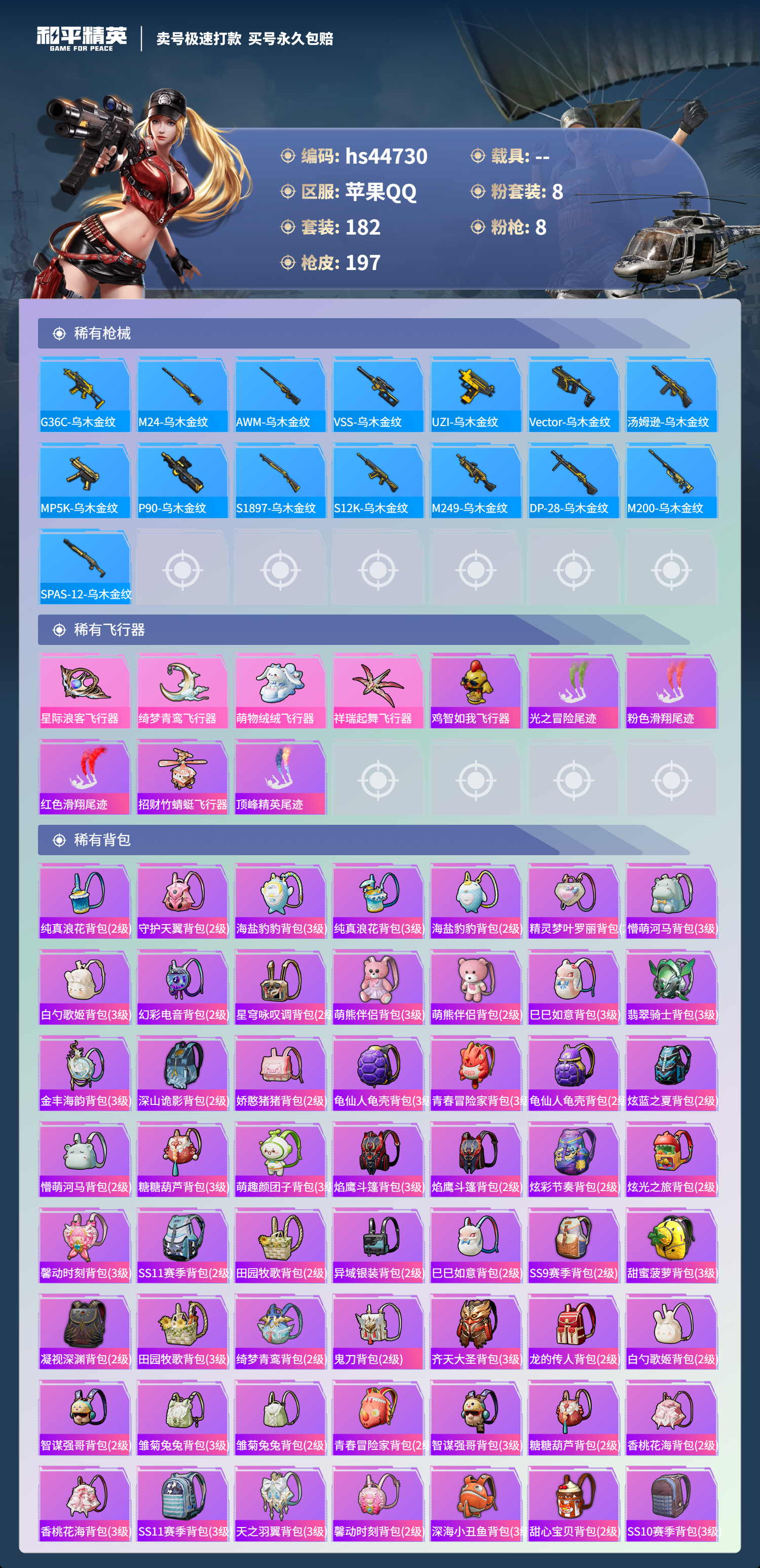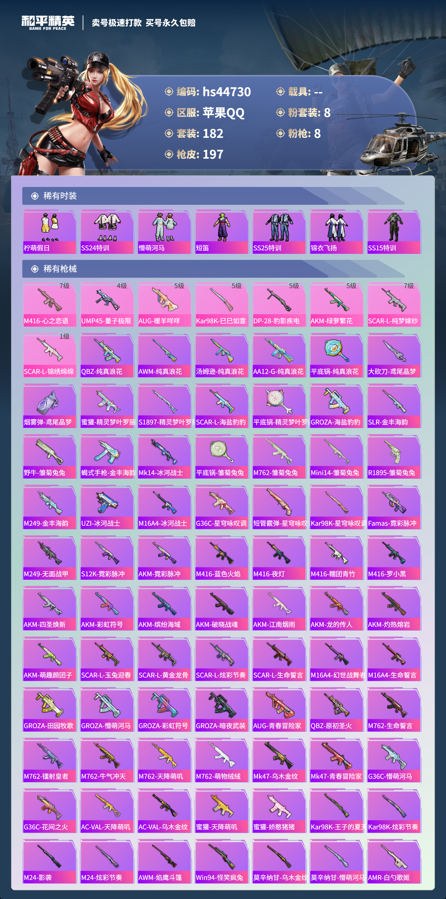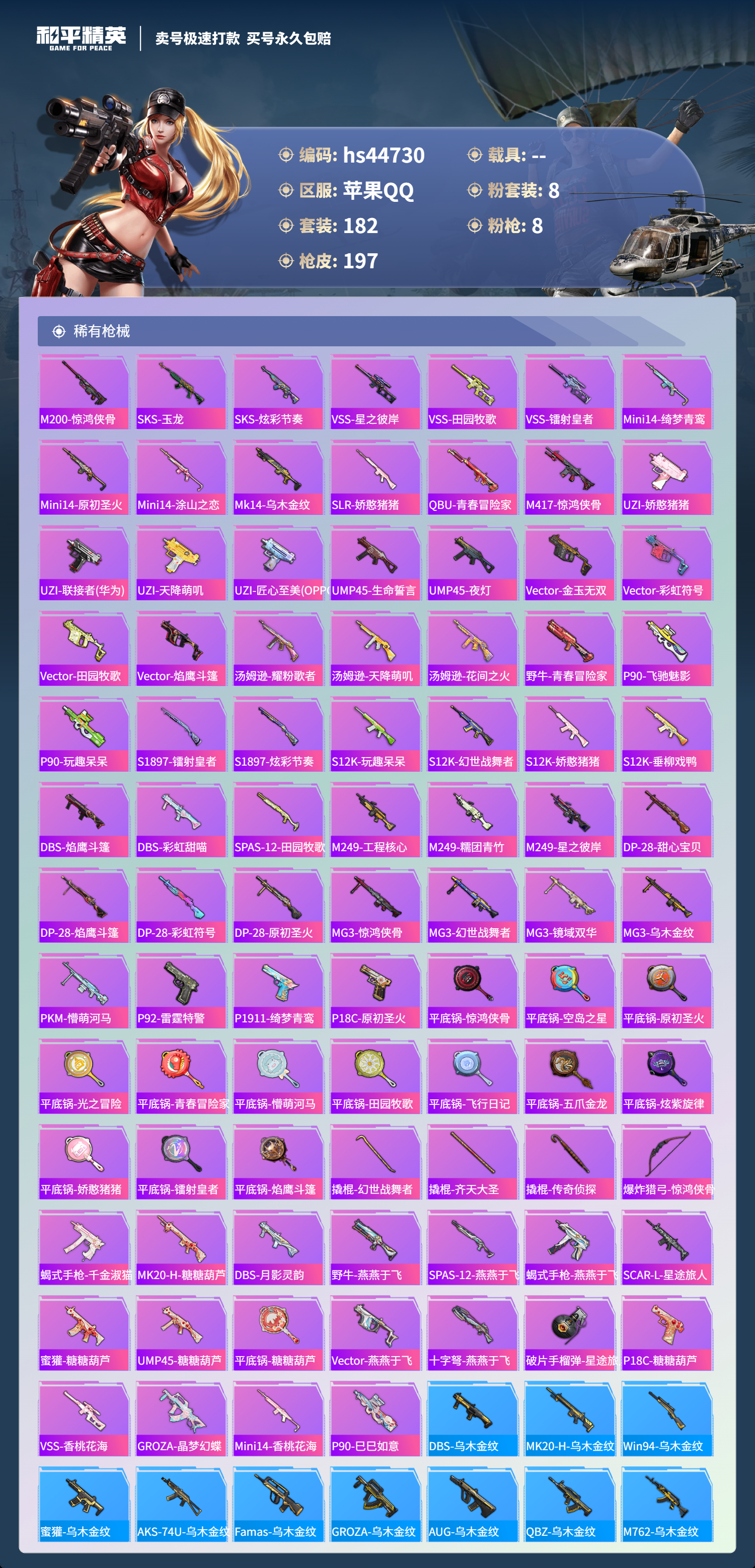 【10894203】【可二次】【苹果QQ】龟仙人 AKM-绿萝繁花 漫步者 花间之火 新侠客行 星际浪客飞行器 萌物绒绒飞行器 绮梦青鸾飞行器 SCAR-L-锦绣绵绵 UMP45-量子极限 M416-心之恋语 AKM-缤纷海域 SCAR-L-纯梦嫁纱 雪山精英 纯白誓言