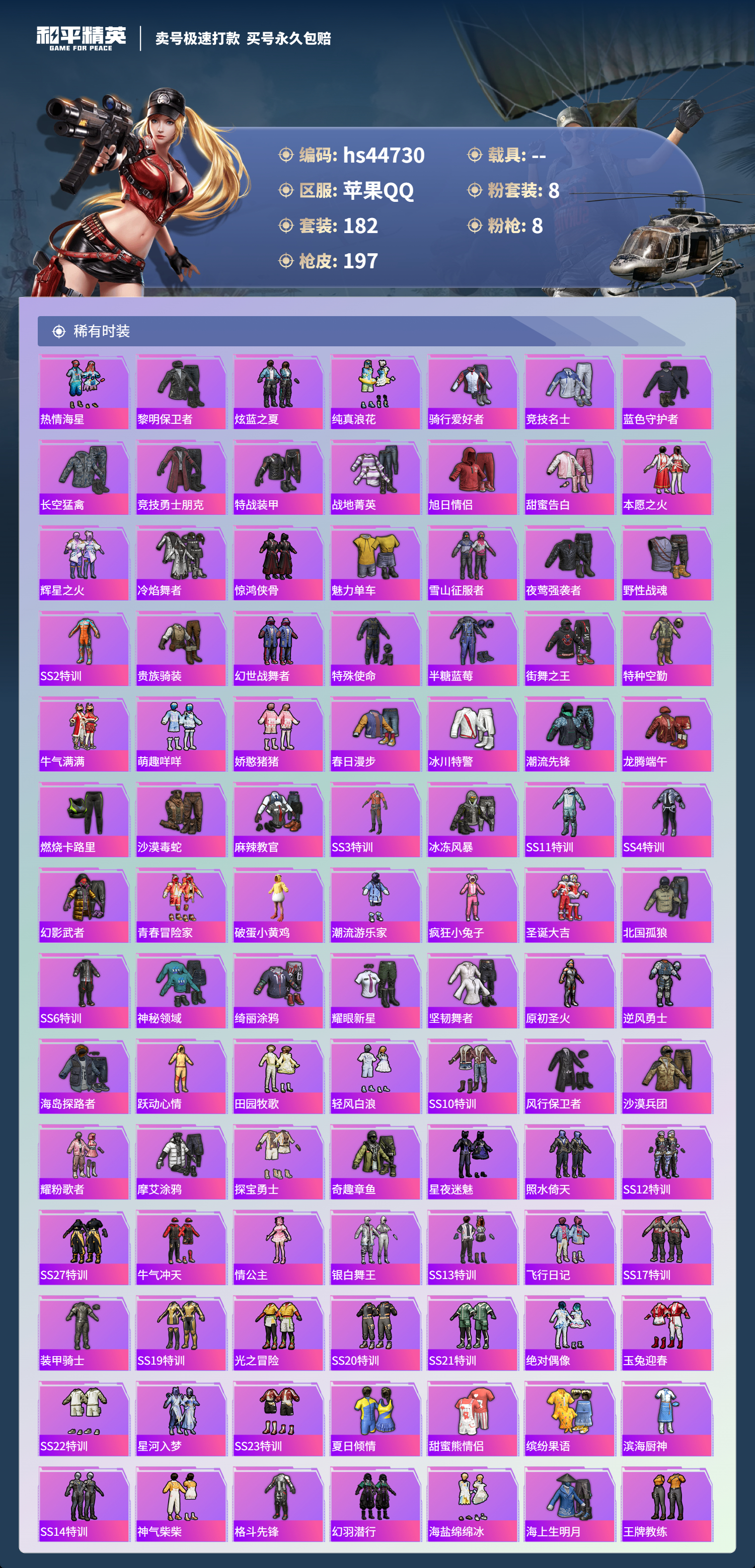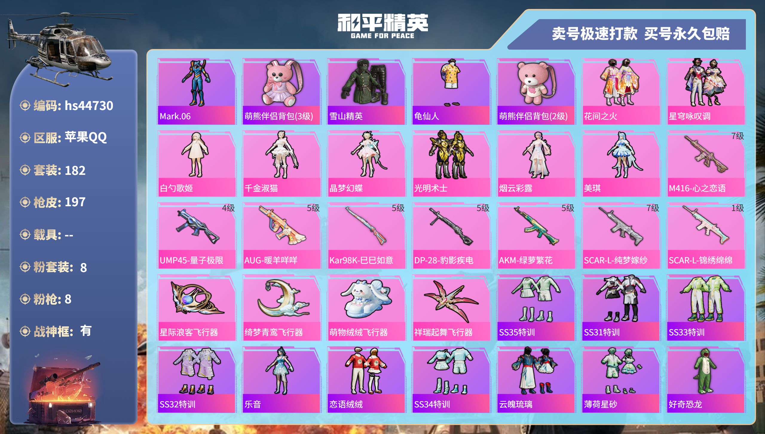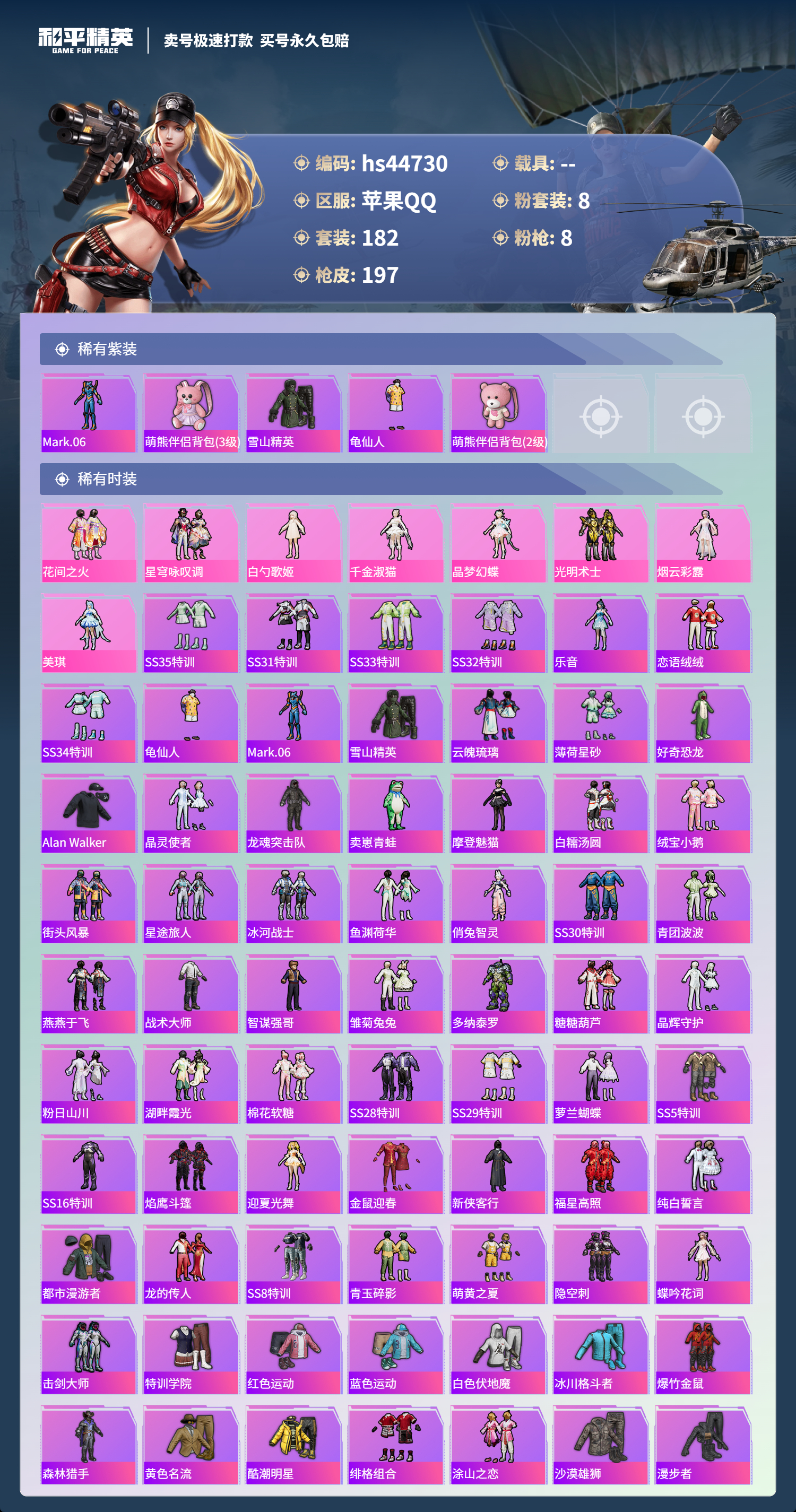 【10894203】【可二次】【苹果QQ】龟仙人 AKM-绿萝繁花 漫步者 花间之火 新侠客行 星际浪客飞行器 萌物绒绒飞行器 绮梦青鸾飞行器 SCAR-L-锦绣绵绵 UMP45-量子极限 M416-心之恋语 AKM-缤纷海域 SCAR-L-纯梦嫁纱 雪山精英 纯白誓言