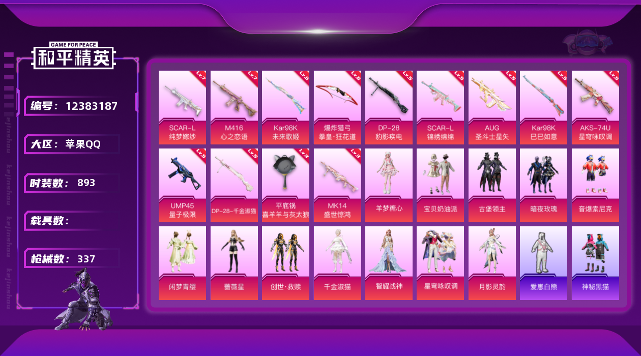 【10894204】【可二次】【苹果QQ】龟仙人 齐天大圣飞行器 SCAR-L-锦绣绵绵 古堡领主 暗夜玫瑰 M416-心之恋语 宝贝奶油派 瑞龙福将 神秘黑猫 醒狮腾龙 雪山精英 迅捷之星 团圆交子