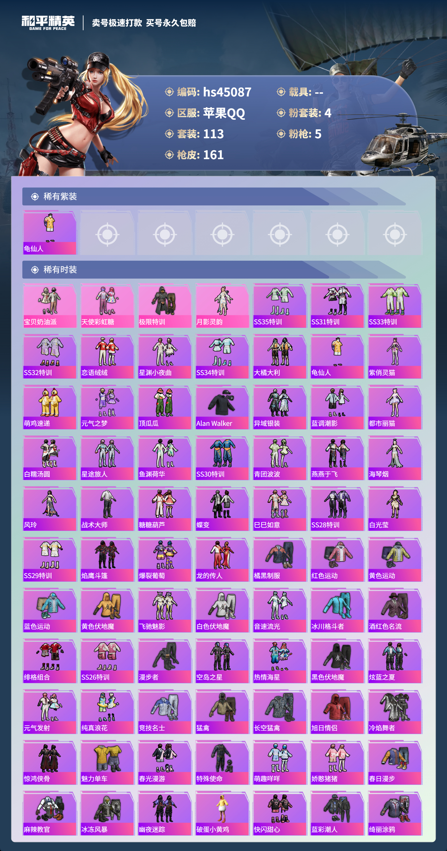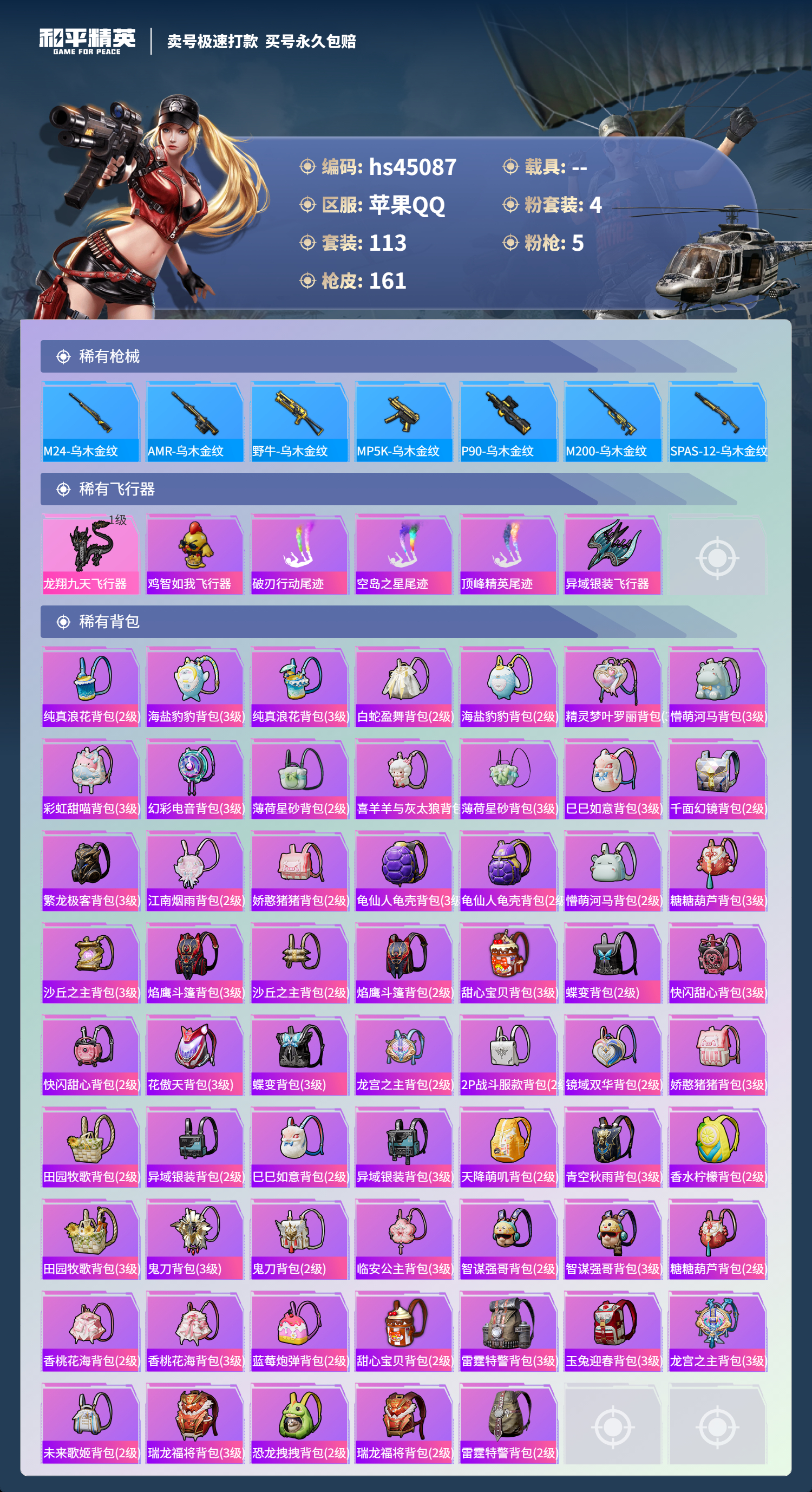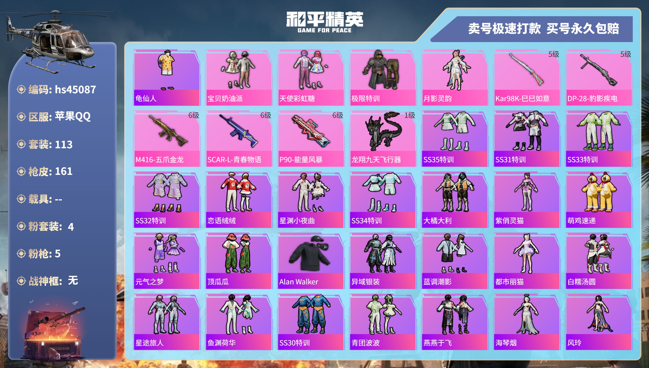 【10894666】【可二次】【苹果QQ】龟仙人 P90-能量风暴 M416-五爪金龙 漫步者 M762-瑞龙福将 极限特训 龙翔九天飞行器 天使彩虹糖 粉红小猪 宝贝奶油派 瑞龙福将 SCAR-L-青春物语 团圆交子