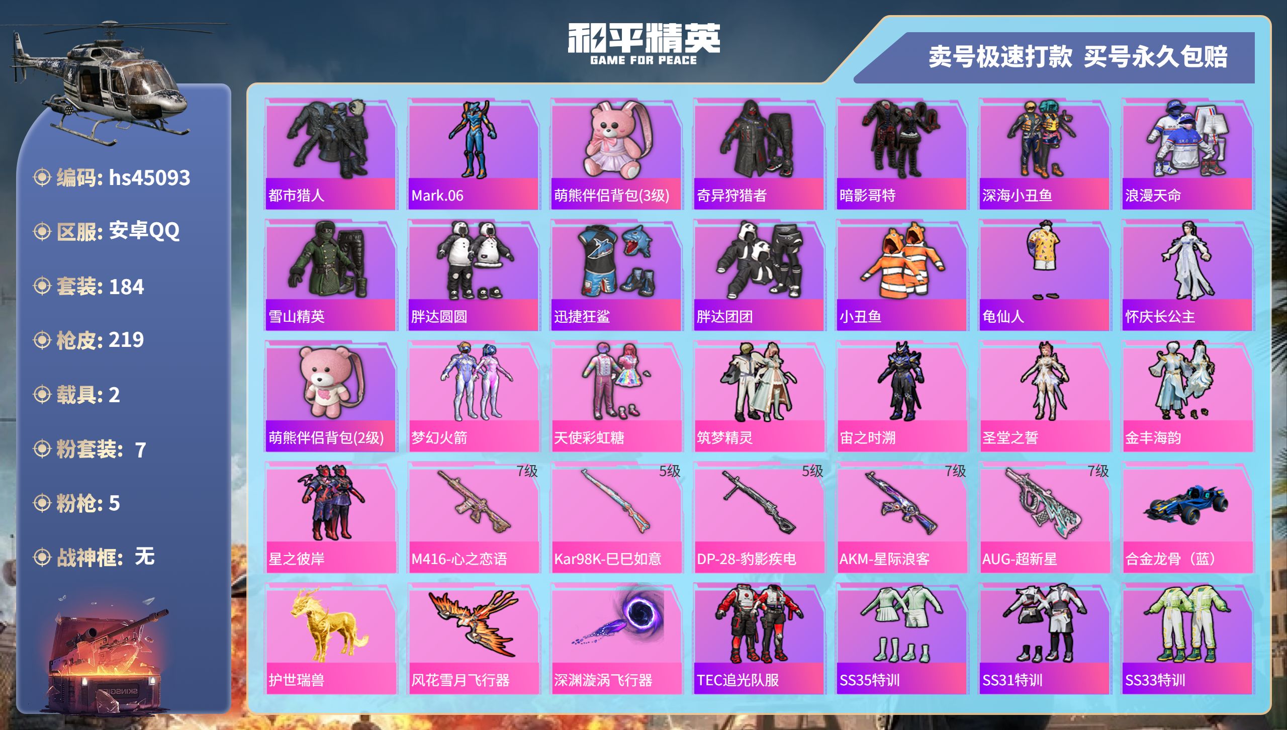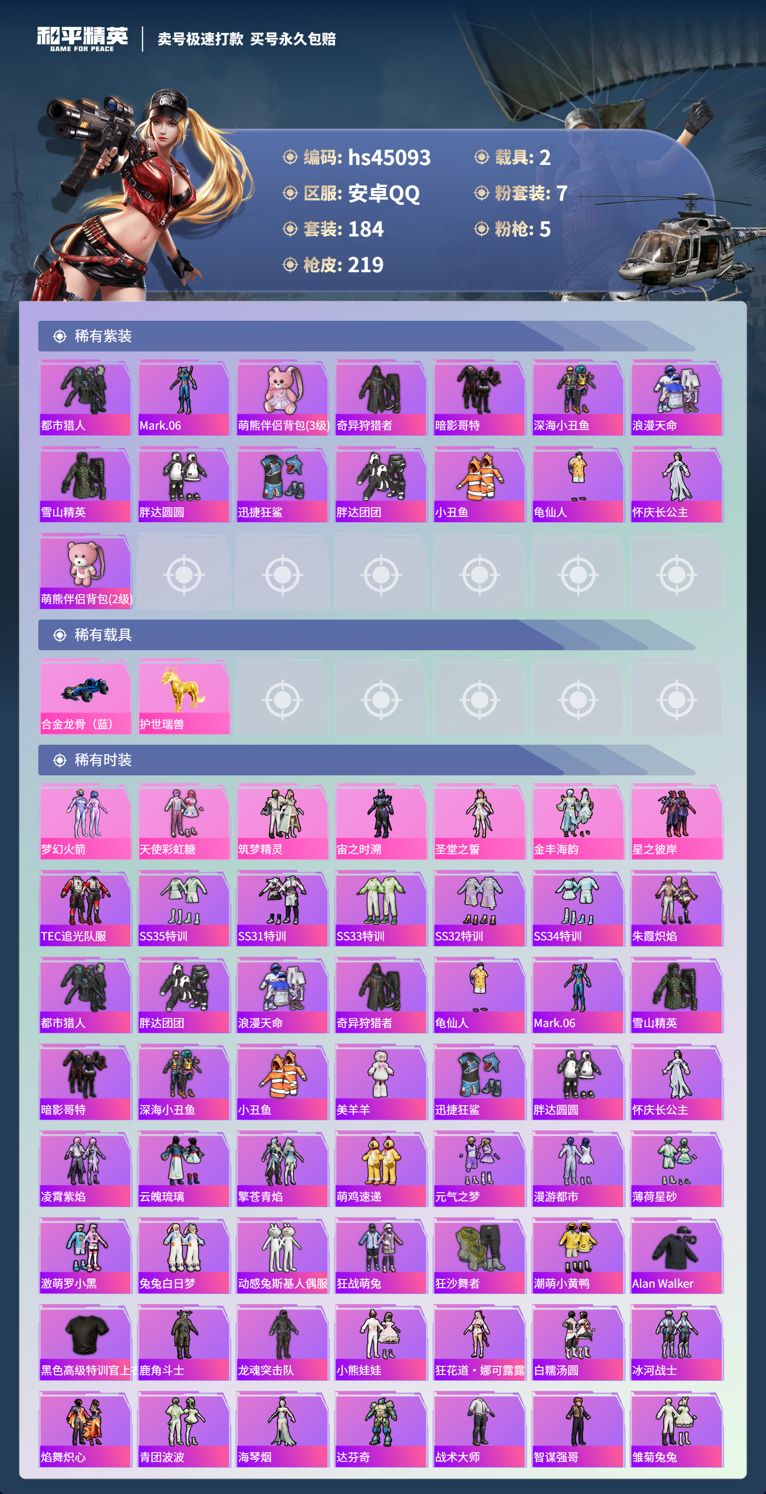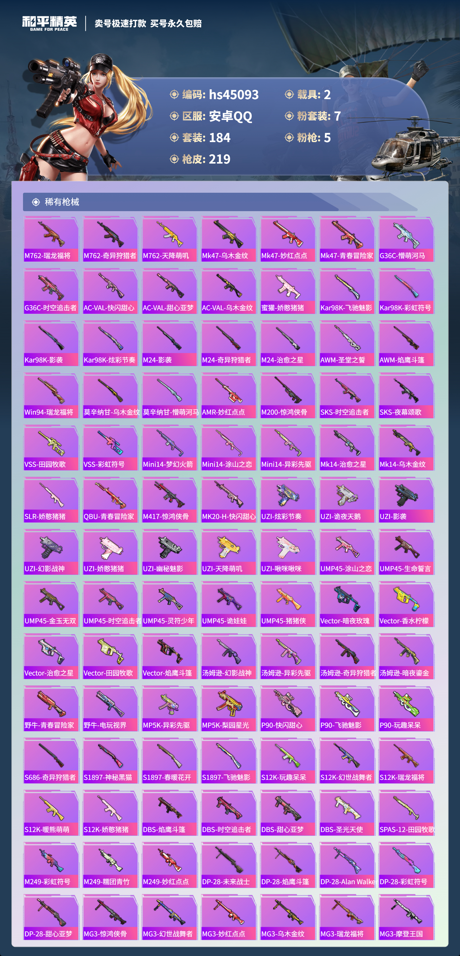 【10894671】【不可二次】【安卓QQ】合金龙骨蓝色 龟仙人 S686-奇异狩猎者 AKM-星际浪客 漫步者 都市猎人 M24-奇异狩猎者 极速红龙 忍者信条 M762-奇异狩猎者 风花雪月飞行器 星之彼岸 M416-心之恋语 深海小丑鱼 瑞龙福将 激萌小黄鸭 浪漫天命 激萌罗小黑 胖达团团 胖达圆圆 团圆交子 红熊茄茄 迅捷狂鲨 暗夜契约 奇异狩猎者 M762-瑞龙福将 AUG-超新星 潮