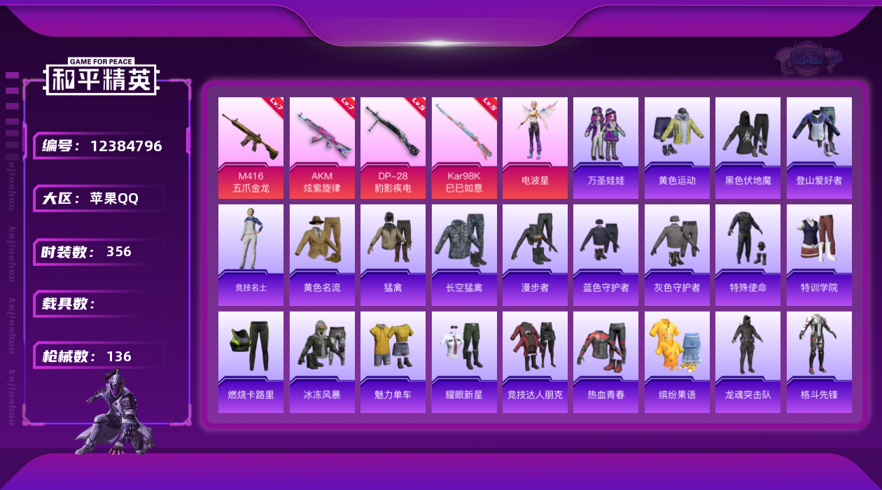 【10894698】【可二次】【苹果QQ】王牌四分卫降落伞 龟仙人 太空嘟嘟降落伞 未来领航者降落伞 AKM-炫紫旋律 M416-五爪金龙 漫步者 粉红小猪 瑞龙福将 团圆交子