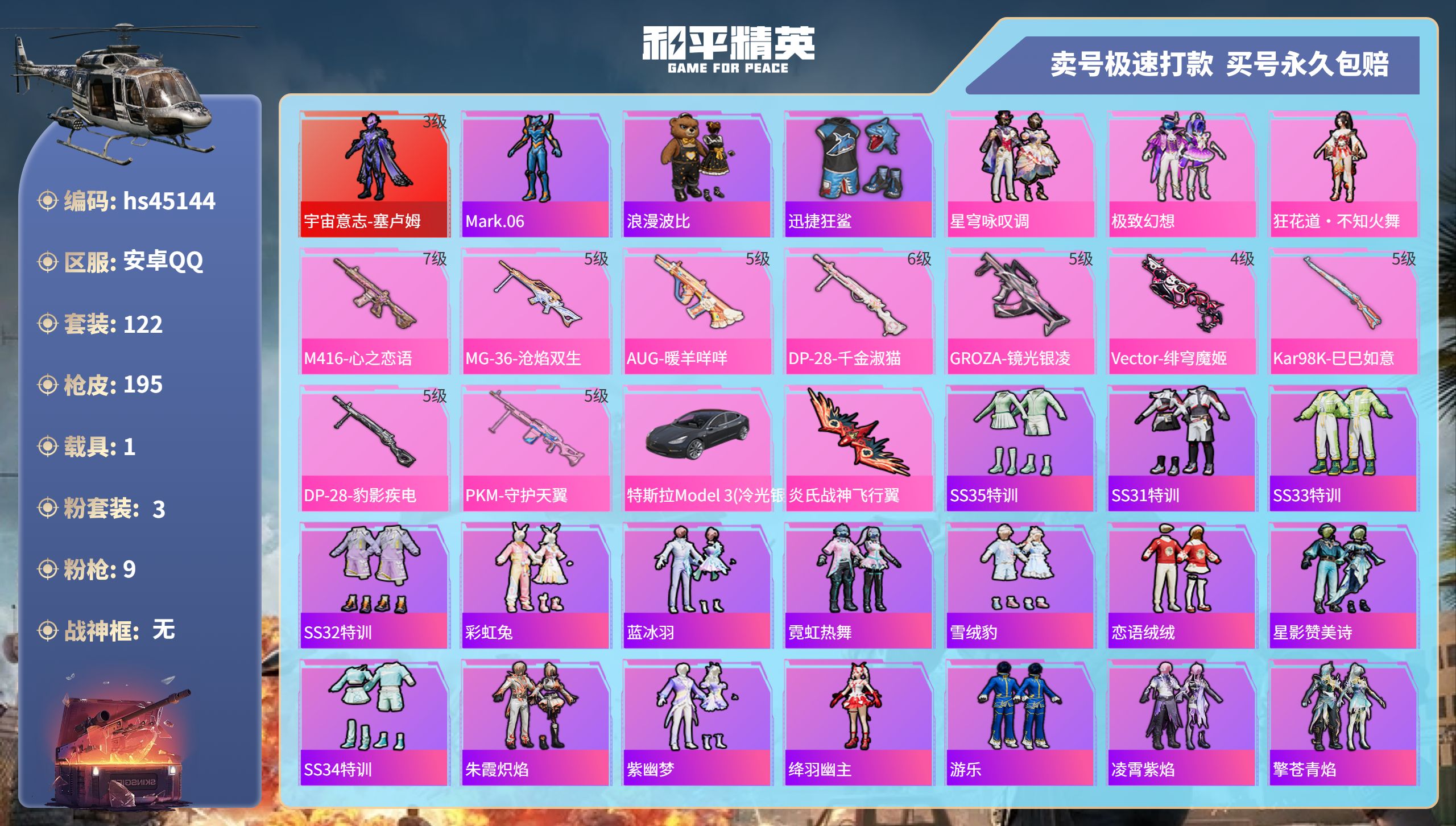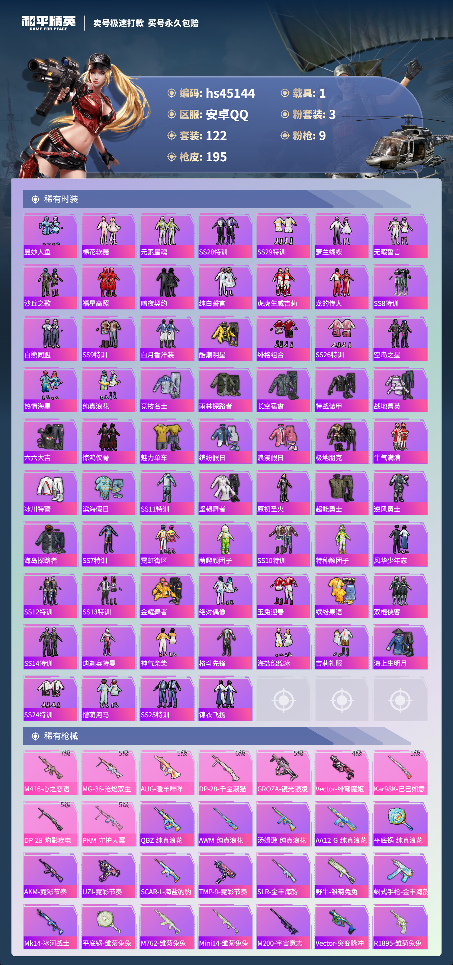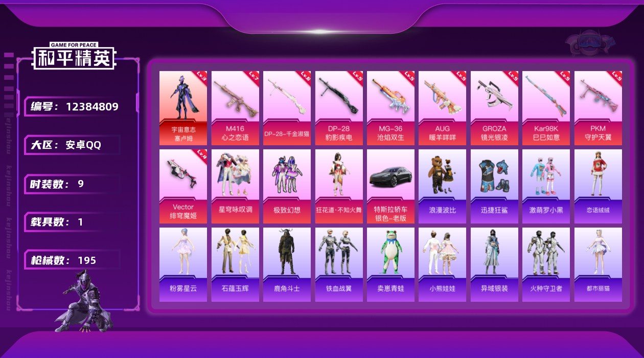 【10894701】【不可二次】【安卓QQ】PKM-守护天翼 迪迦奥特曼 迅捷狂鲨 暗夜契约 特斯拉3银色 极致幻想 宇宙意志-塞卢姆 炎氏战神飞行翼 白月香洋装 M416-心之恋语 浪漫假日 浪漫波比 风华少年志 激萌罗小黑 纯白誓言 AKM-奇异狩猎者