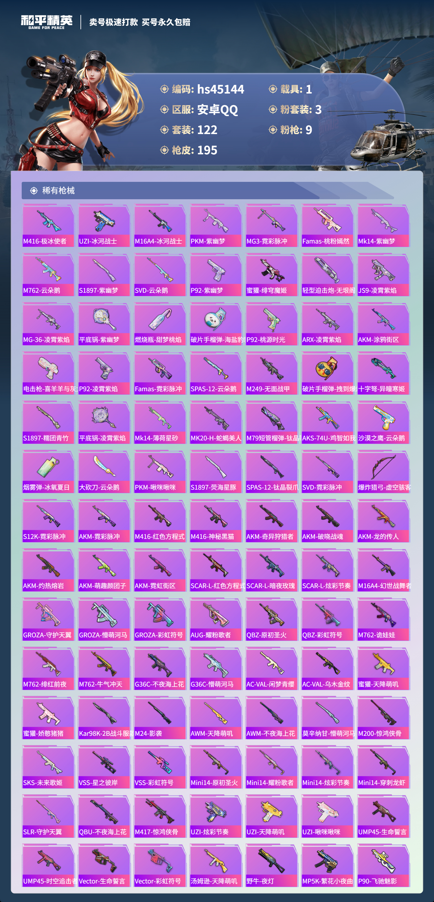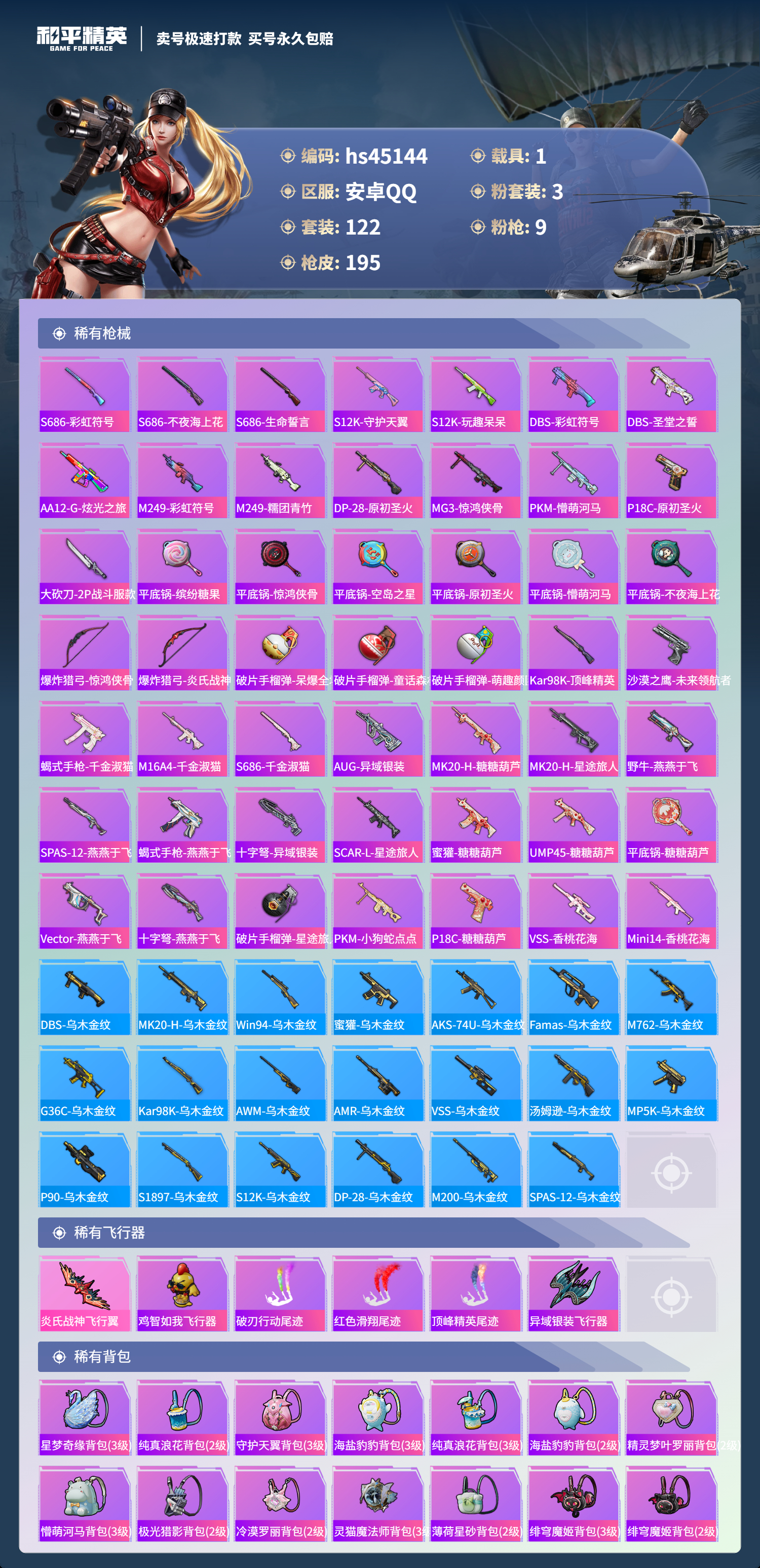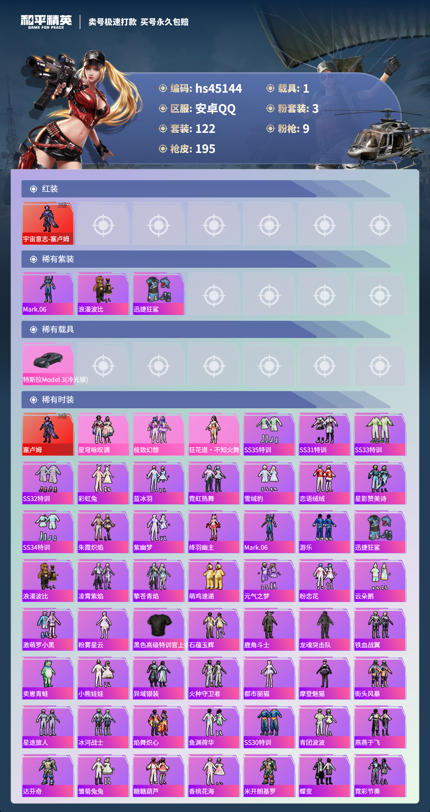 【10894701】【不可二次】【安卓QQ】PKM-守护天翼 迪迦奥特曼 迅捷狂鲨 暗夜契约 特斯拉3银色 极致幻想 宇宙意志-塞卢姆 炎氏战神飞行翼 白月香洋装 M416-心之恋语 浪漫假日 浪漫波比 风华少年志 激萌罗小黑 纯白誓言 AKM-奇异狩猎者