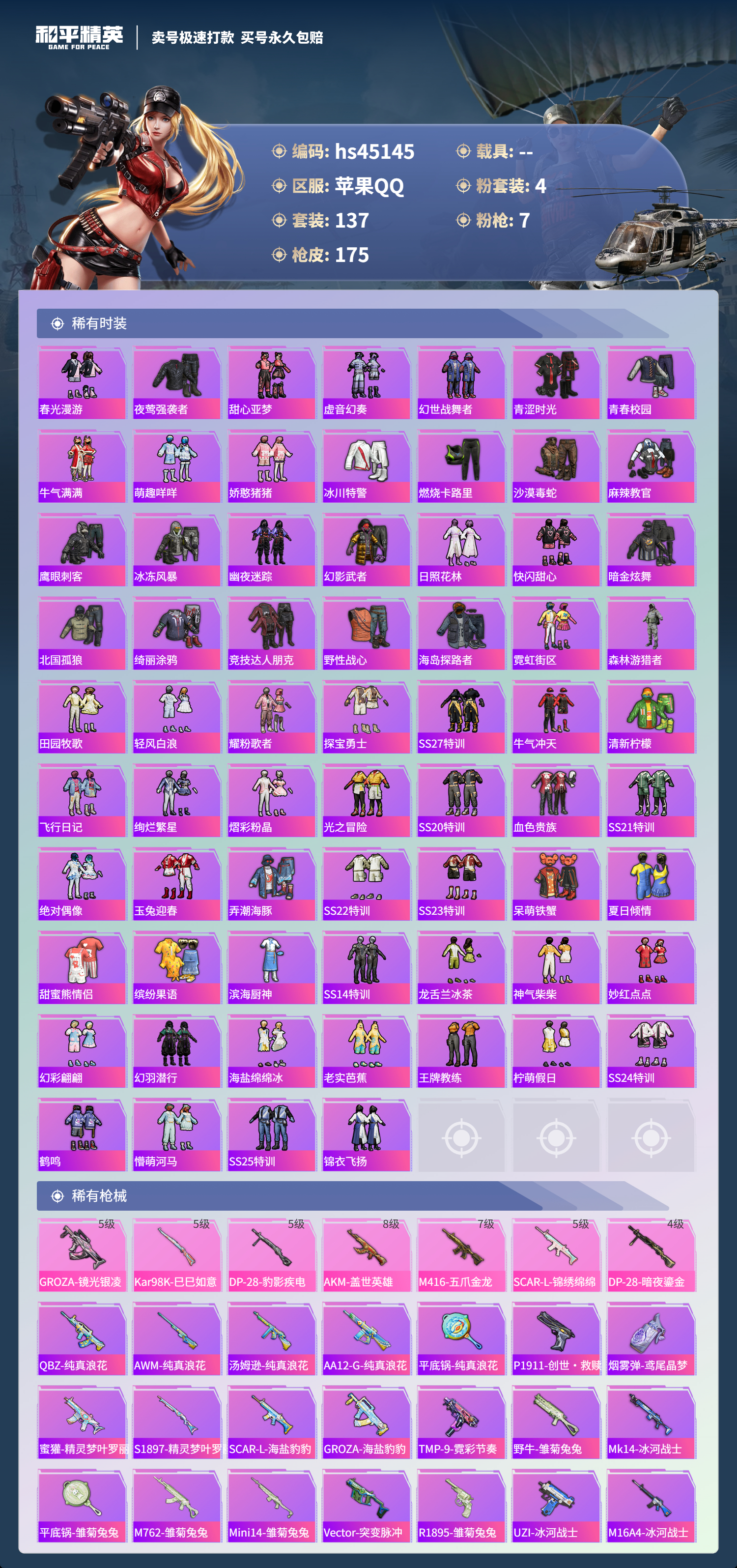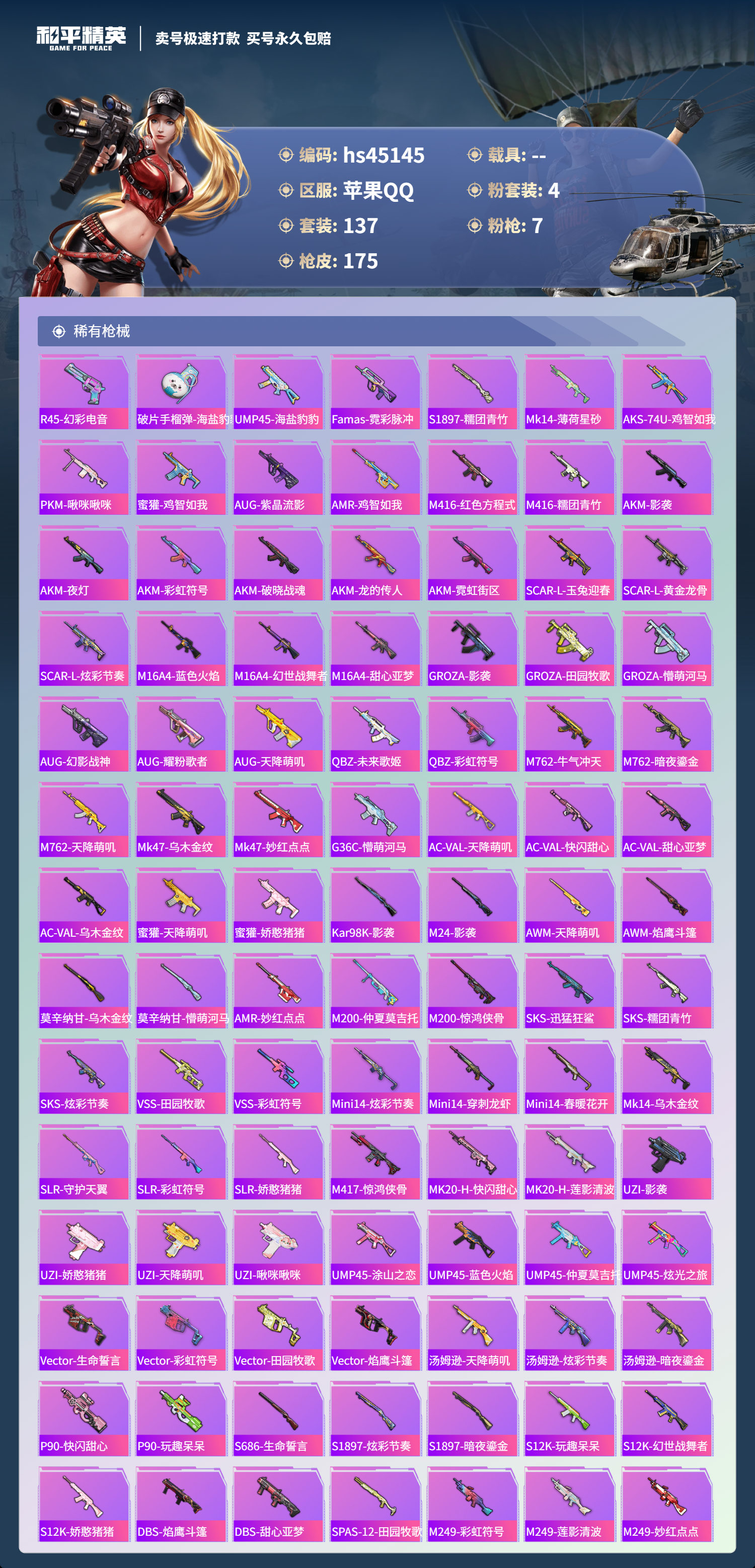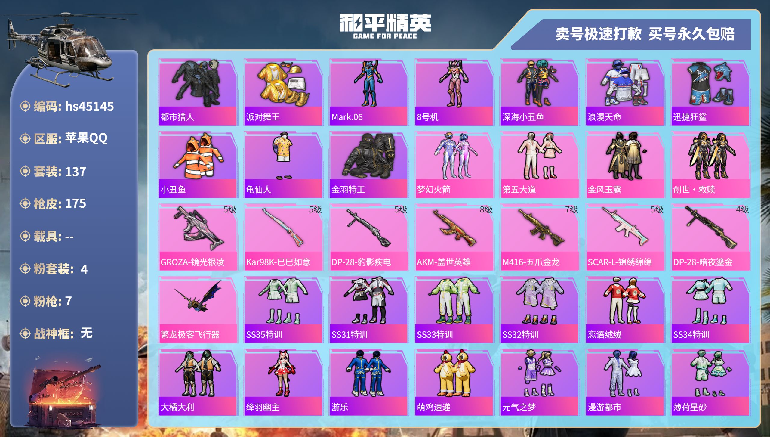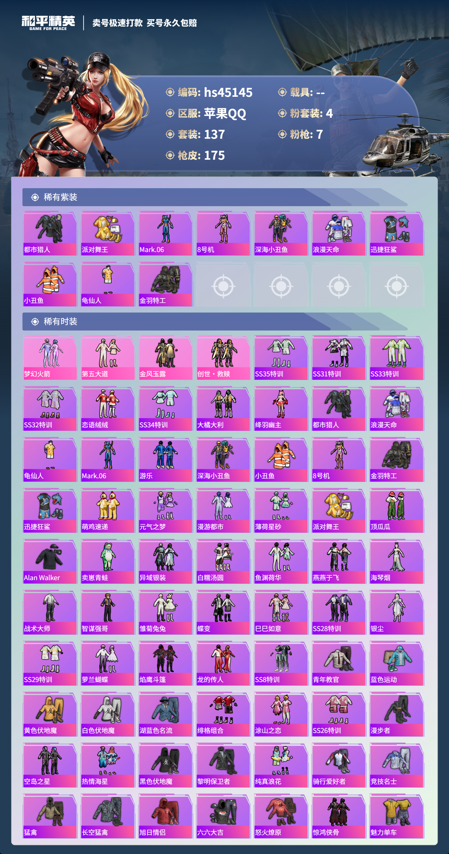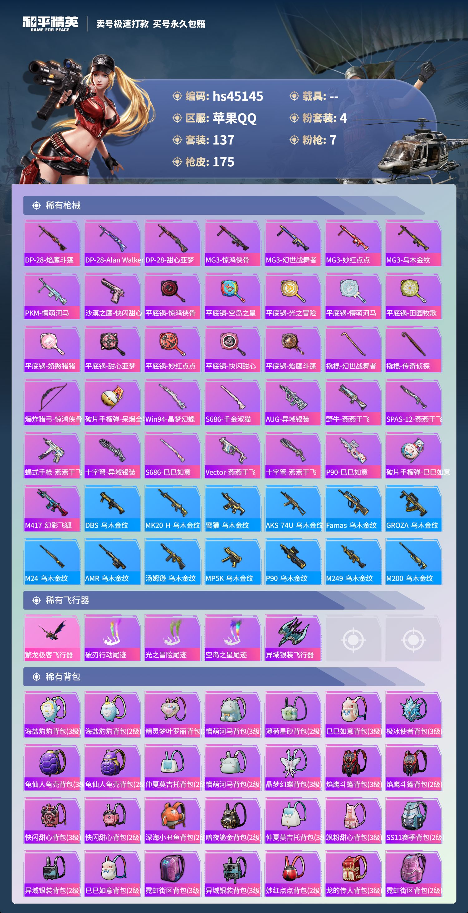 【10894707】【可二次】【苹果QQ】龟仙人 AKM-盖世英雄 M416-五爪金龙 漫步者 繁龙极客飞行器 都市猎人 迅捷狂鲨 金羽特工 SCAR-L-锦绣绵绵 金风玉露 DP-28-暗夜鎏金 梦幻火箭 深海小丑鱼 派对舞王 浪漫天命
