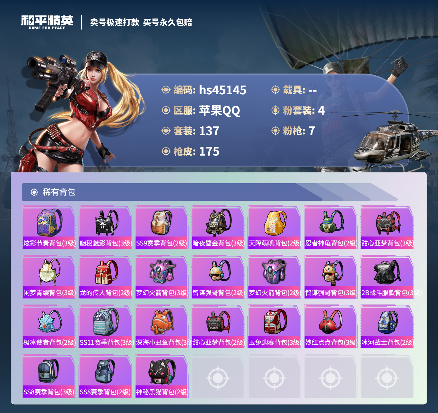 服务保障: 签约卖家 签约卖家安全可靠,90天内找回全额包赔。 快速交易 根据游戏种类不同,完成换绑后延时放款