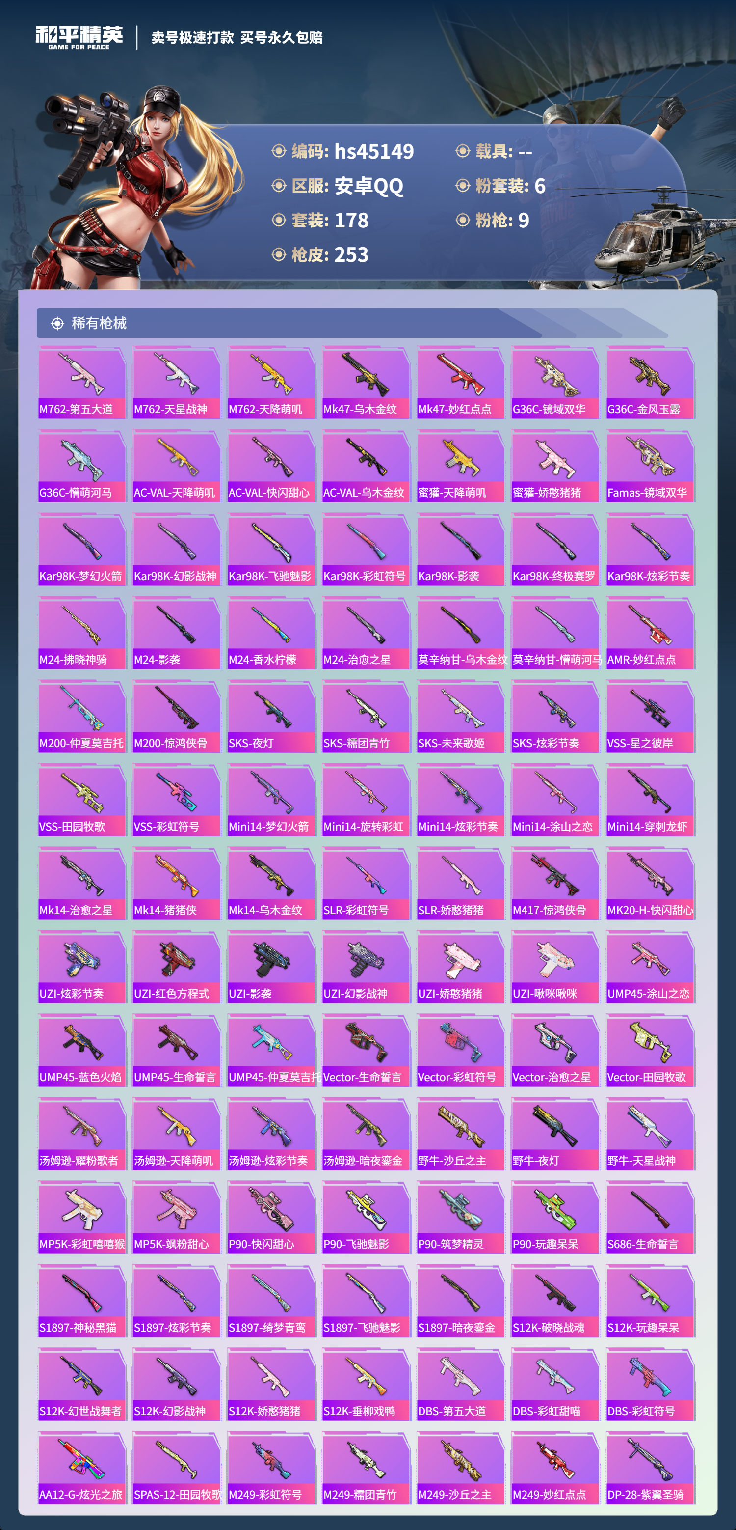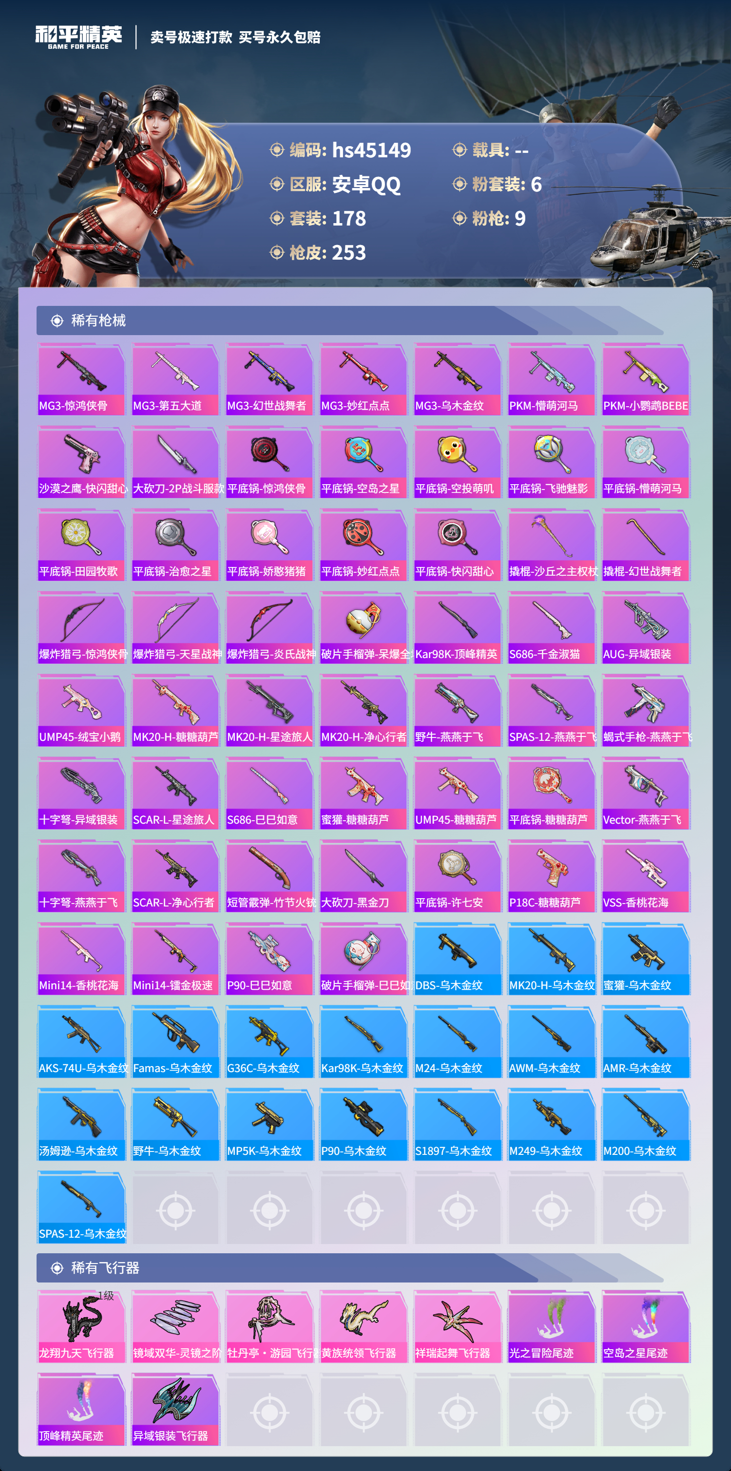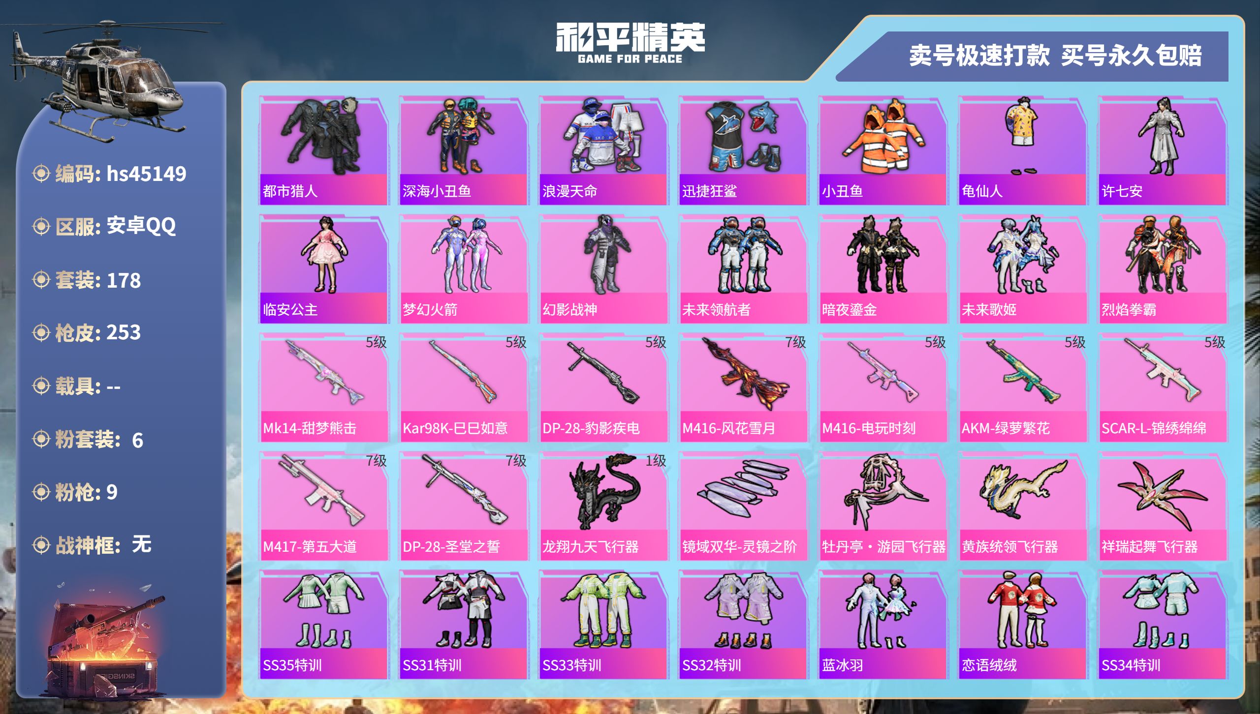 【10894708】【不可二次】【安卓QQ】龟仙人 AKM-绿萝繁花 VSS-烈焰拳霸 漫步者 都市猎人 迅捷狂鲨 暗夜契约 DP-28-圣堂之誓 M417射手步枪 龙翔九天飞行器 黄族统领飞行器 忍者信条 M416-电玩时刻 SCAR-L-锦绣绵绵 M416-风花雪月 烈焰拳霸 梦幻火箭 浪漫假日 深海小丑鱼 M24-香水柠檬 幻影战神 M417-第五大道 浪漫天命 纯白誓言
