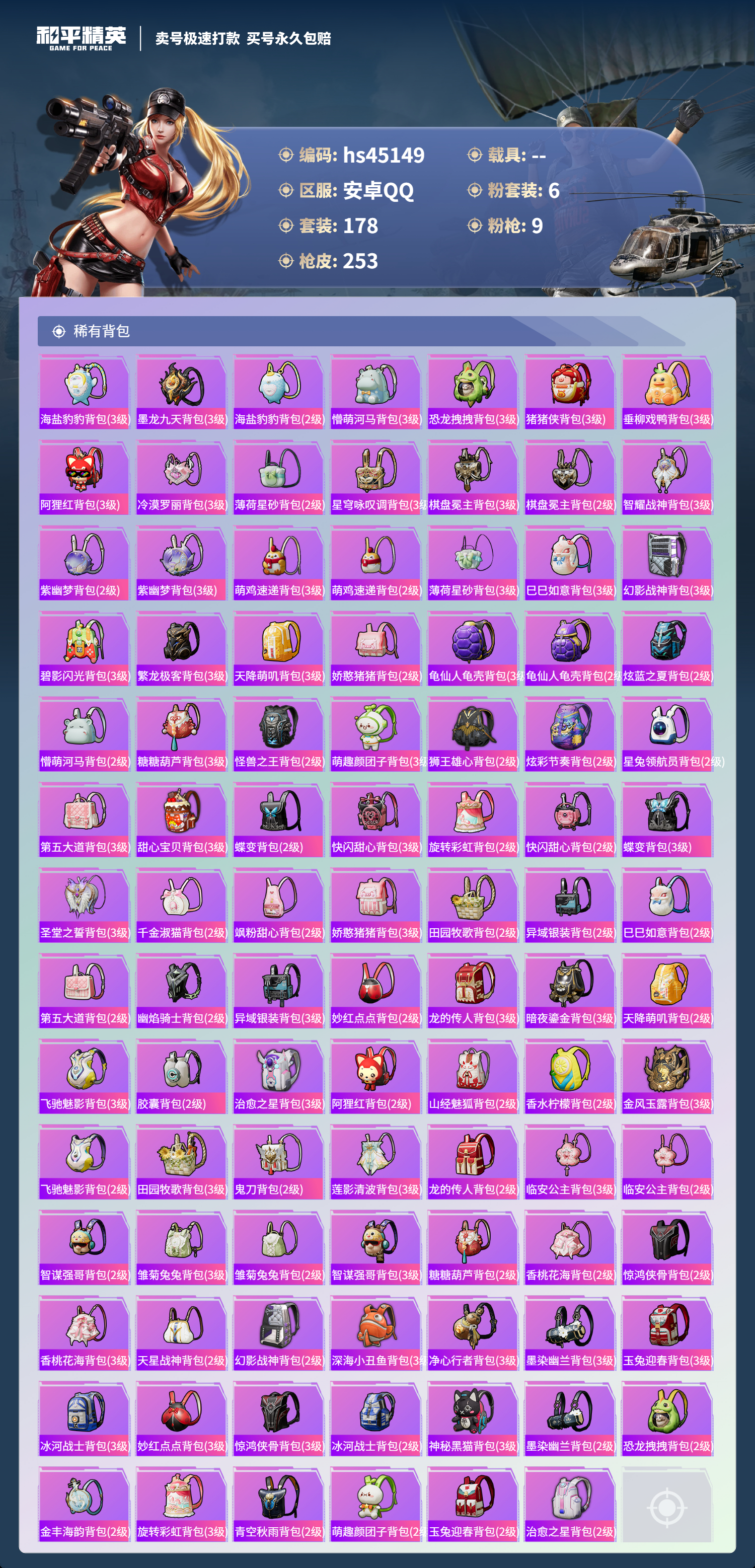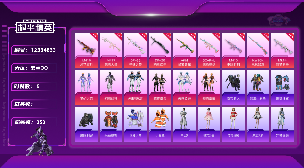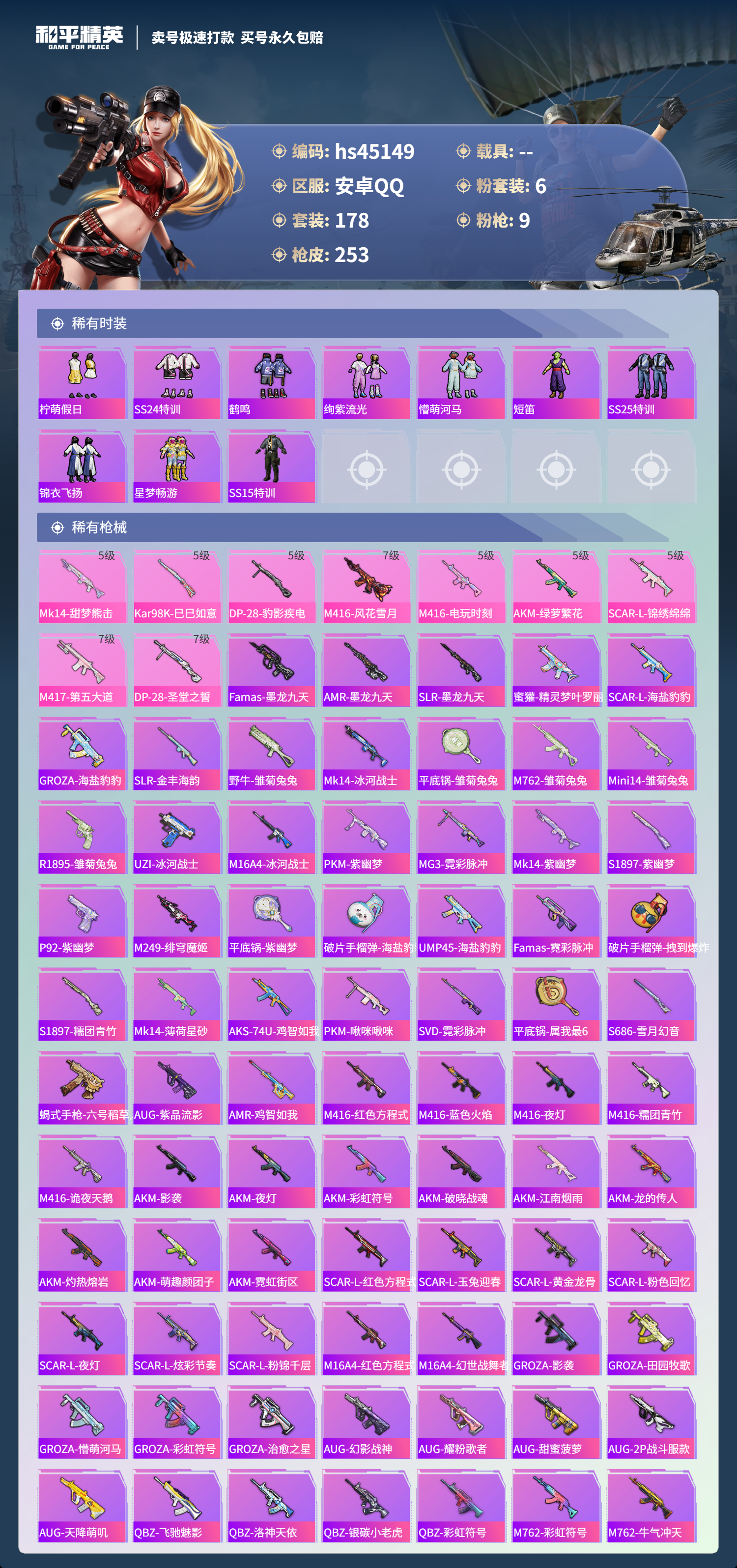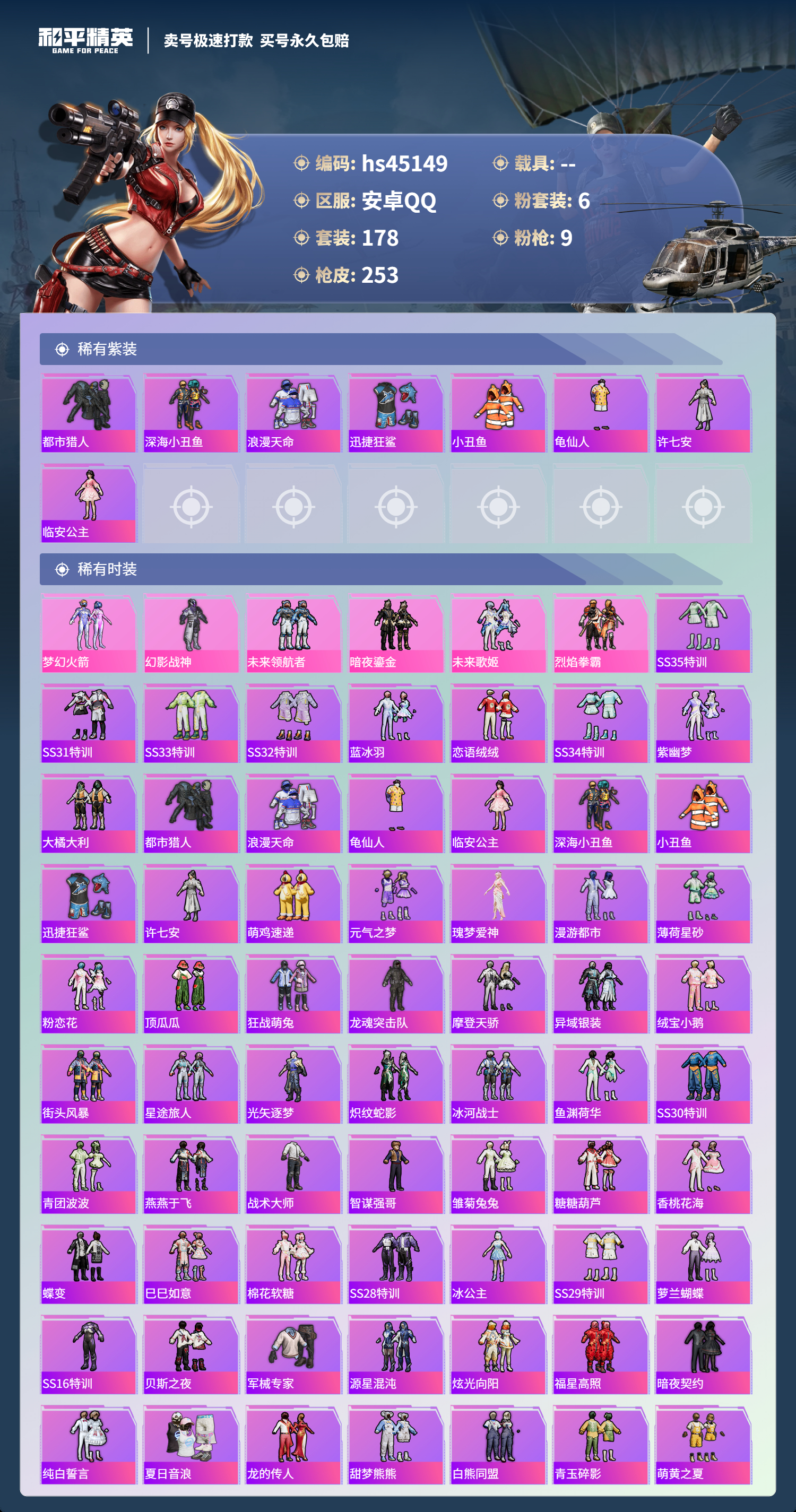 【10894708】【不可二次】【安卓QQ】龟仙人 AKM-绿萝繁花 VSS-烈焰拳霸 漫步者 都市猎人 迅捷狂鲨 暗夜契约 DP-28-圣堂之誓 M417射手步枪 龙翔九天飞行器 黄族统领飞行器 忍者信条 M416-电玩时刻 SCAR-L-锦绣绵绵 M416-风花雪月 烈焰拳霸 梦幻火箭 浪漫假日 深海小丑鱼 M24-香水柠檬 幻影战神 M417-第五大道 浪漫天命 纯白誓言