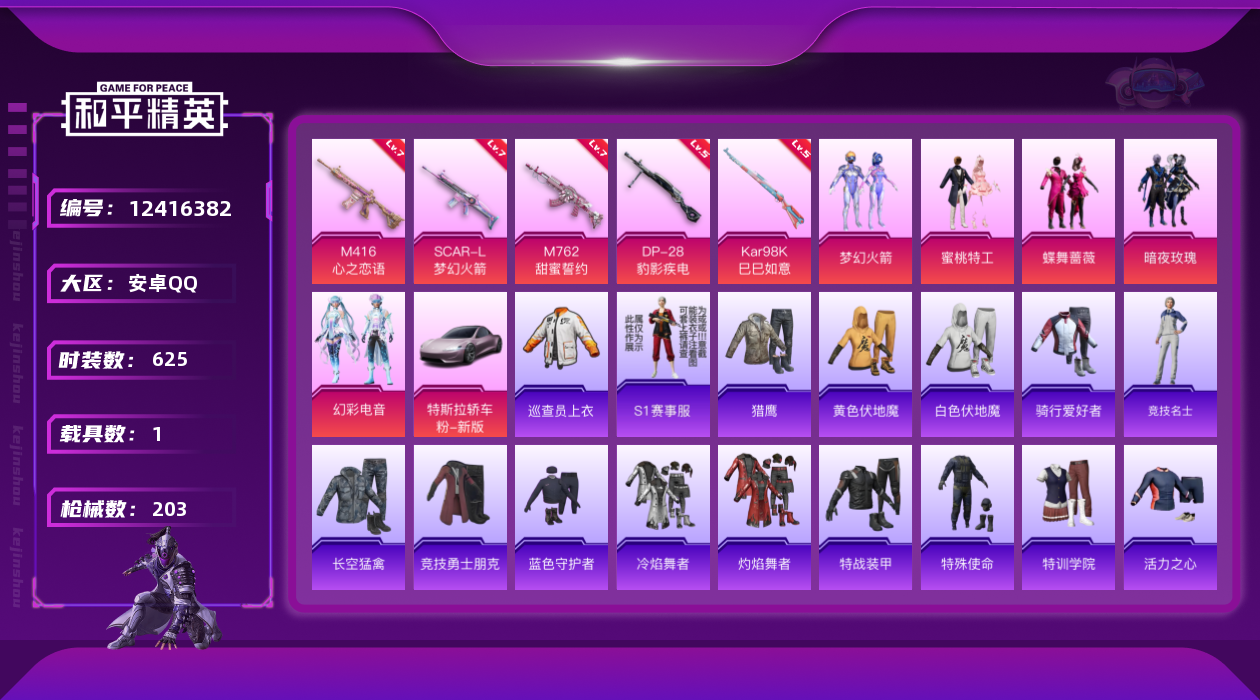 【10901610】【可二次】【安卓QQ】龟仙人 SCAR-L梦幻火箭 浪漫樱花 特斯拉R沁心粉 极速红龙 鹤发童颜 梦起落英 巡查衣 M762甜蜜誓言 蜜桃特工 蝶舞蔷薇 梦幻火箭 暗夜玫瑰 M416-心之恋语 粉红小猪 瑞龙福将 雪山精英 迅捷之星 团圆交子