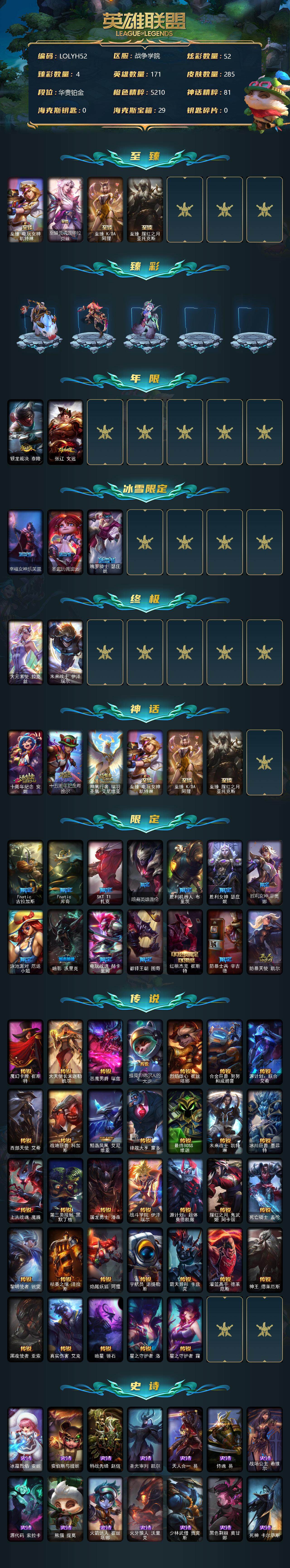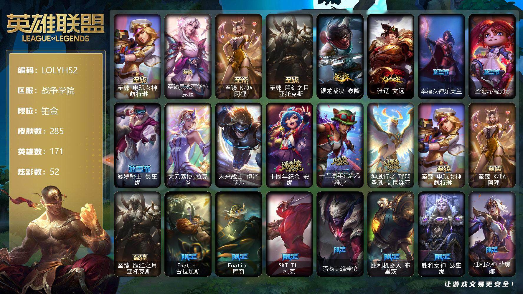 【10903121】【LOLYH52】171英雄/285皮肤/2终极/7神话/19限定/4臻彩/52炫彩/33传说/71史诗/铂金账号等级:769/至臻电玩女神凯特琳/至臻灵魂莲华拉克丝/至臻K/DA阿狸/至臻腥红之月亚托克斯/无畏骑士瑟庄妮赤子初心/女帝卡特琳娜纹章之刻印英勇/魔女阿卡丽虚荣/净雪之月莫甘娜冬虹/银龙裁决泰隆/张辽文远/幸福女神乐芙兰/圣诞玩偶波比/魄罗骑士瑟庄妮/大元素使拉克