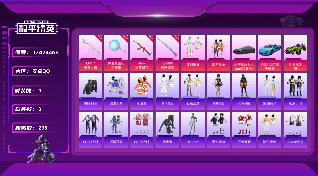 【10903353】【不可二次】【安卓QQ】龟仙人 AKM-绿萝繁花 水银刺客 漫步者 极速红龙 葫芦兄弟 太空嘟嘟飞行器 软嫩糖心蛋 瑞龙福将 醒狮腾龙 浪漫天命 纯梦嫁纱飞行翼 纯白誓言 团圆交子 SS1特训 合金龙骨绿色 暗夜契约 M762-瑞龙福将 海洋之心 兰博轿车灰色 M417射手步枪 迈凯伦570S 天际蓝 狂沙舞者 平底锅-仲夏莫吉托 AKM-缤纷海域 M417-第五大道 雪山精英