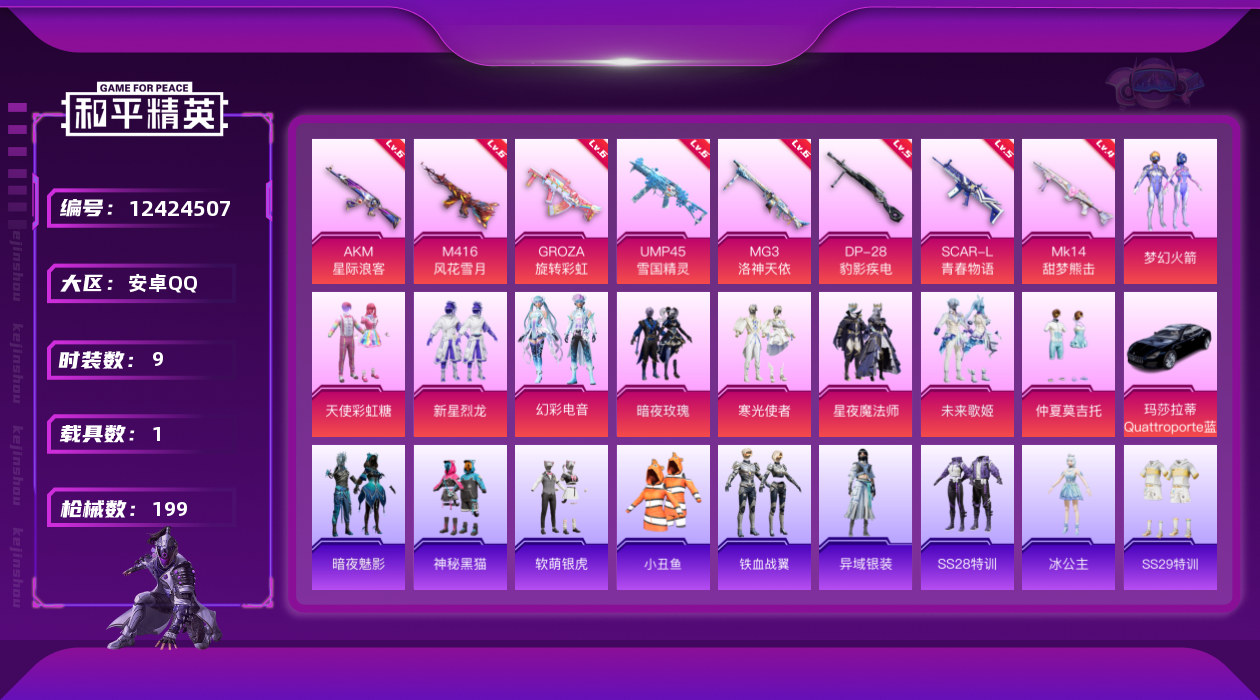 【10903359】【不可二次】【安卓QQ】软萌银虎 龟仙人 AKM-星际浪客 漫步者 暗夜契约 新星烈龙 M762-瑞龙福将 MG3-洛神天依 UMP45-雪国精灵 极速红龙 UMP4雪国精灵 M416-风花雪月 梦幻火箭 暗夜玫瑰 天使彩虹糖 瑞龙福将 GROZA-旋转彩虹 神秘黑猫 SCAR-L-青春物语 雪山精英 纯白誓言 团圆交子