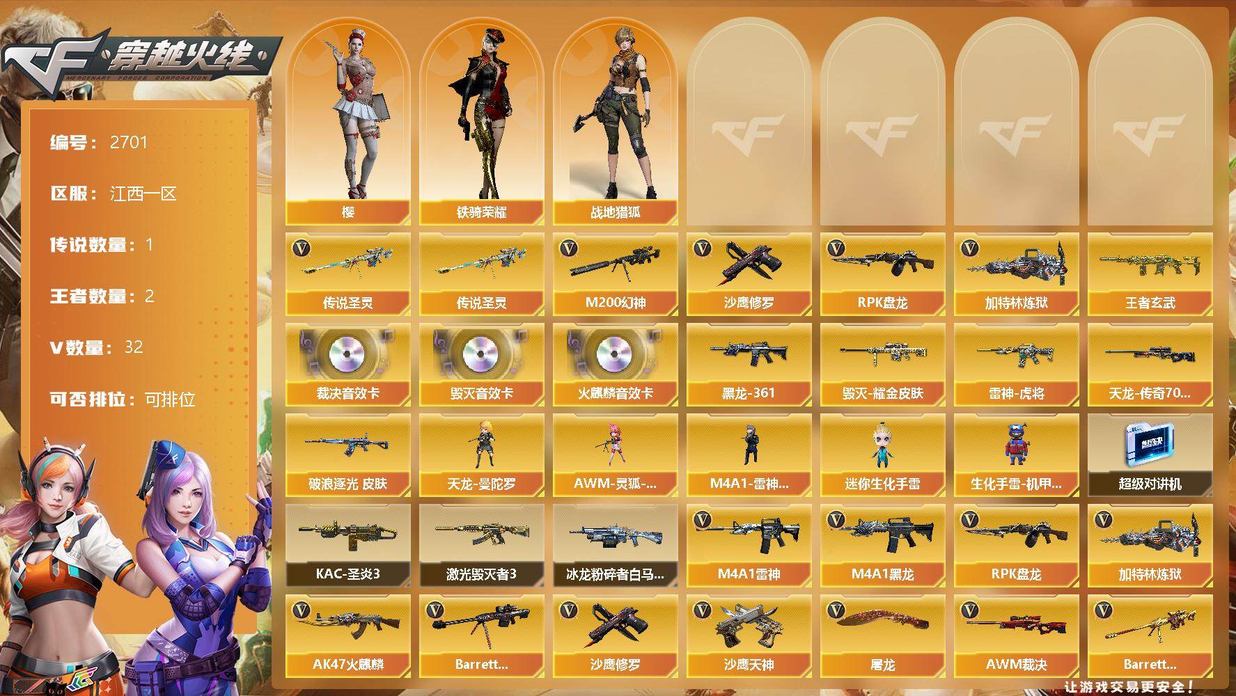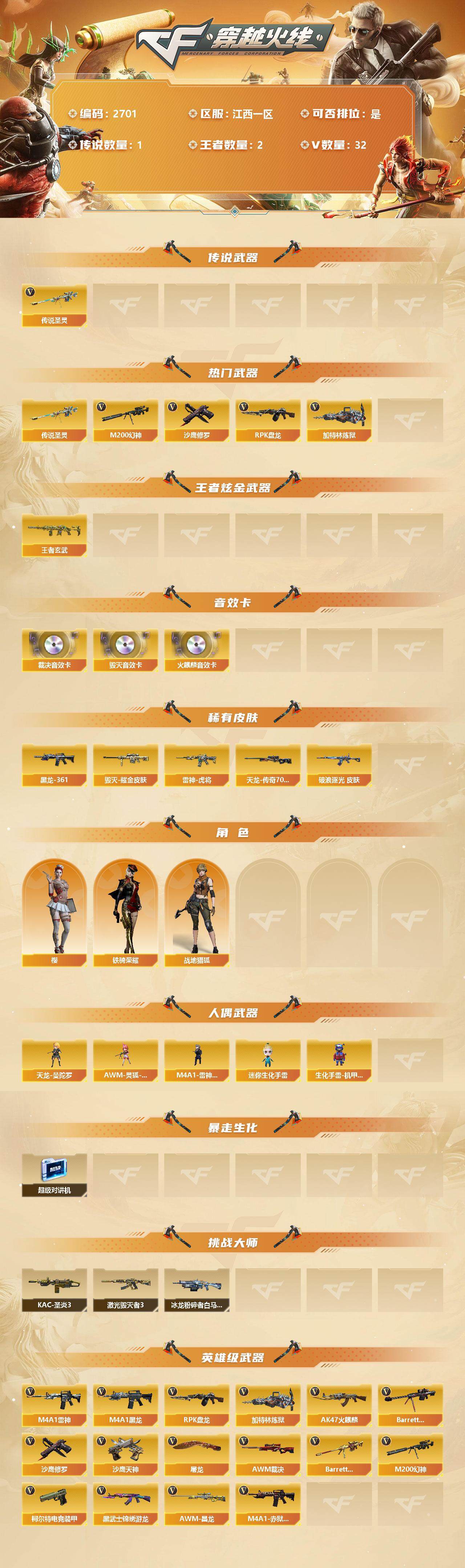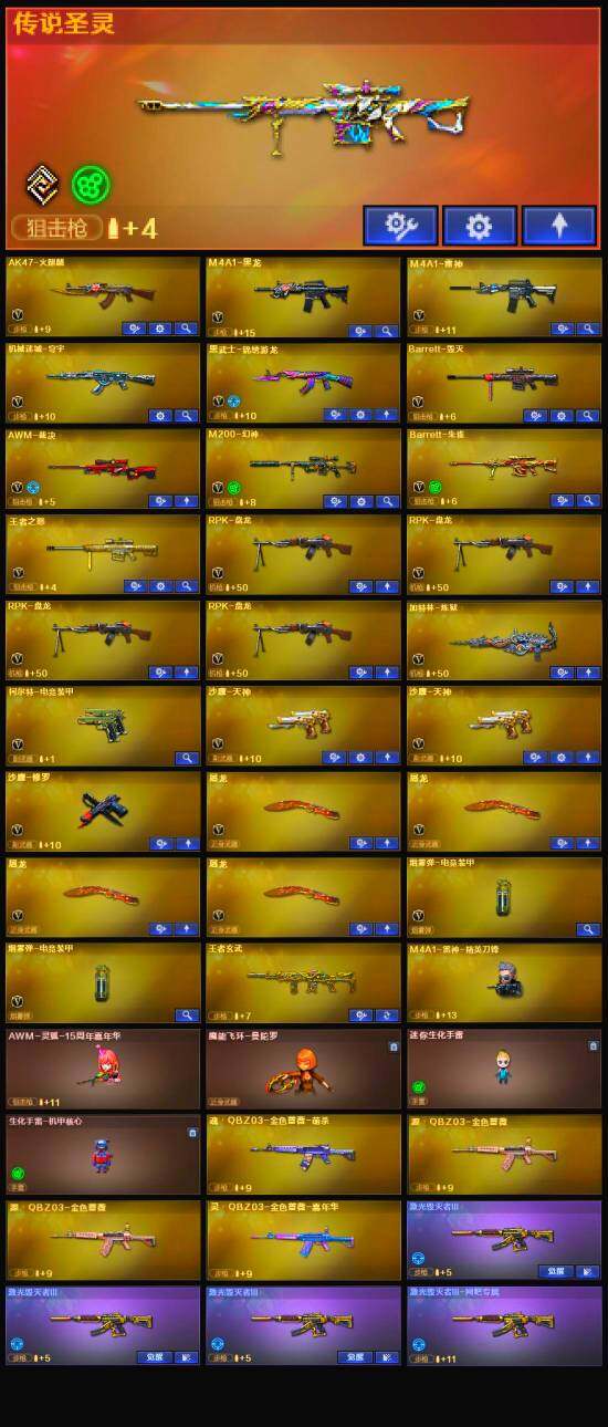 【10903957】【10903957】【商品标题】:江西一区-32V-2王者-0炫金【传说武器】:传说圣灵【热门武器】:传说圣灵,M200-幻神,RPK-盘