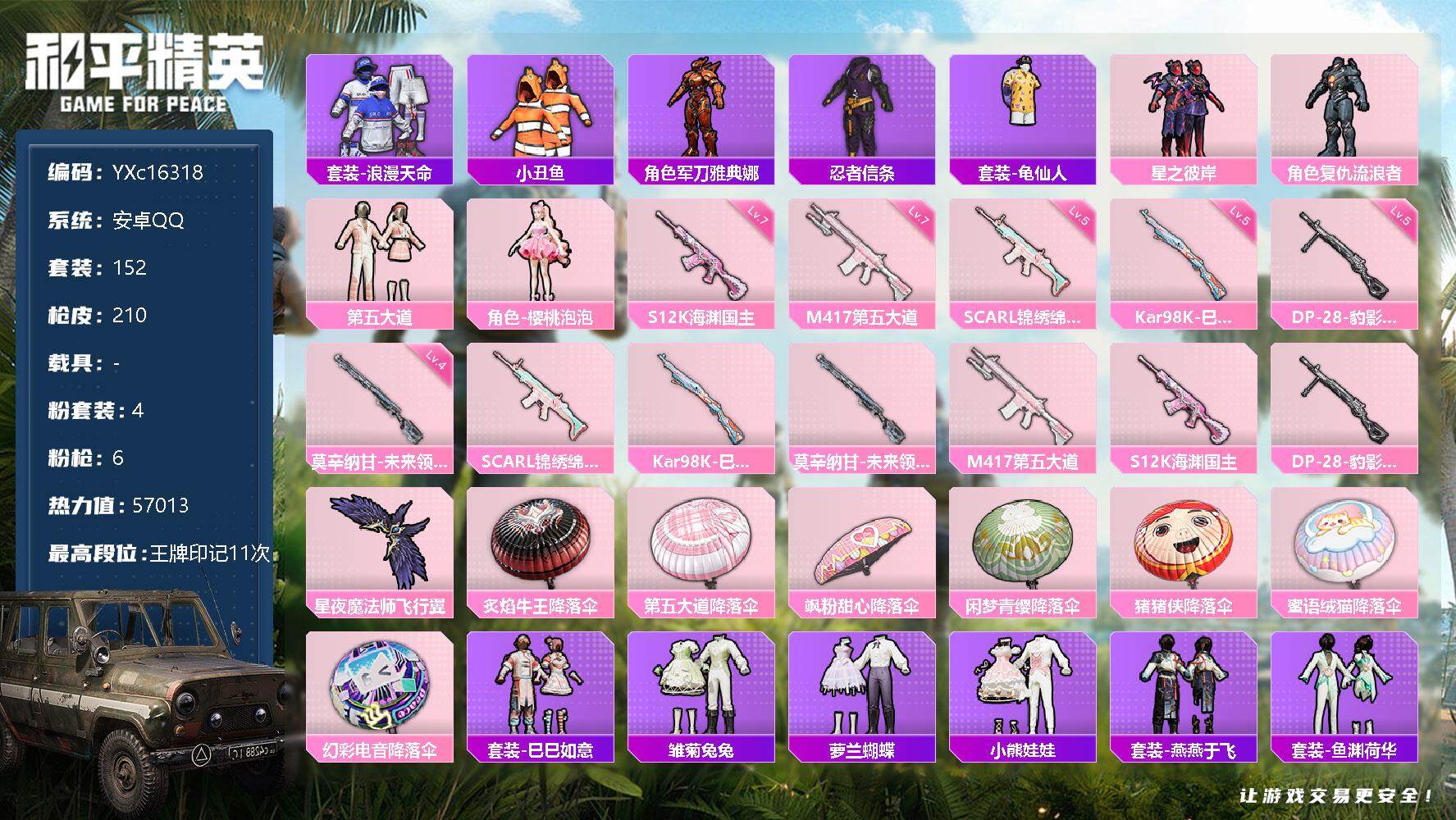【10905342】【可二次】【安卓QQ】龟仙人 水银刺客 S12K-海渊国主 韶华初心 狂沙舞者 豚鼠丹丹 忍者信条 M762-奇异狩猎者 SCAR-L-锦绣绵绵 第五大道降落伞 星之彼岸 狂战萌兔 浪漫假日 炙焰牛王降落伞 M417-第五大道 浪漫天命 莫辛纳甘-未来领航者