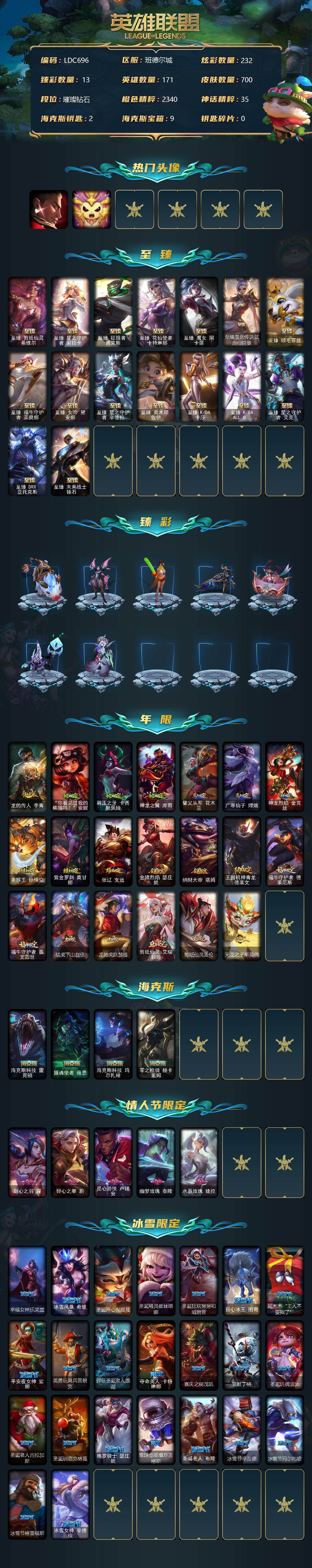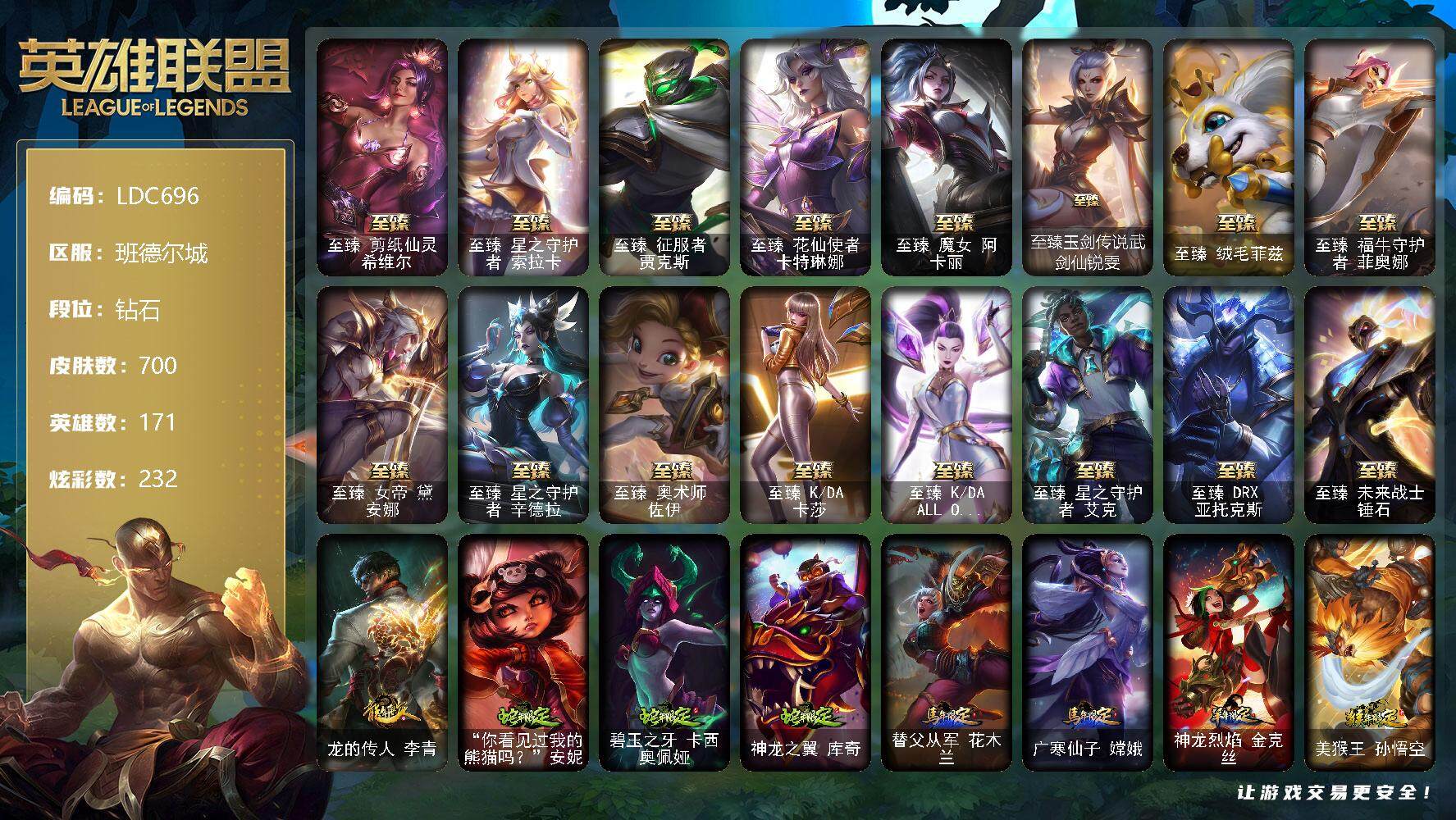 【10914964】【LDC696】171英雄/700皮肤/1终极/25神话/132限定/13臻彩/232炫彩/78传说/129史诗/钻石/觅心游侠卢锡安/星守索拉卡/至臻剪纸仙灵希维尔/至臻星之守护者索拉卡/至臻征服者贾克斯/至臻花仙使者卡特琳娜/至臻魔女阿卡丽/至臻玉剑传说武剑仙/至臻绒毛菲兹/至臻福牛守护者菲奥娜/至臻女帝黛安娜/至臻星之守护者辛德拉/至臻奥术师佐伊/至臻K/DA卡莎/至臻