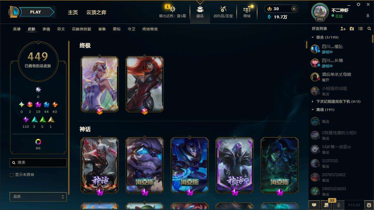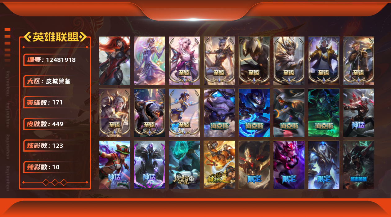 【10917307】[12481918]【gpz_962437】 t27906【皮城警备】449皮肤 123炫彩 10臻彩 19神话/44限定/40传说/171英雄 账号等级:995 单双排段位:铂金【重要头像】觅心之翼奎因 银河魔装机神安妮 幼犬内瑟斯 沐浴震惊 不错哦 至臻魔女婕拉 【重要皮肤】灵魂莲华拉克丝至臻 青花瓷拉克丝至臻 女帝黛安娜至臻 魔女婕拉至臻 真实伤害