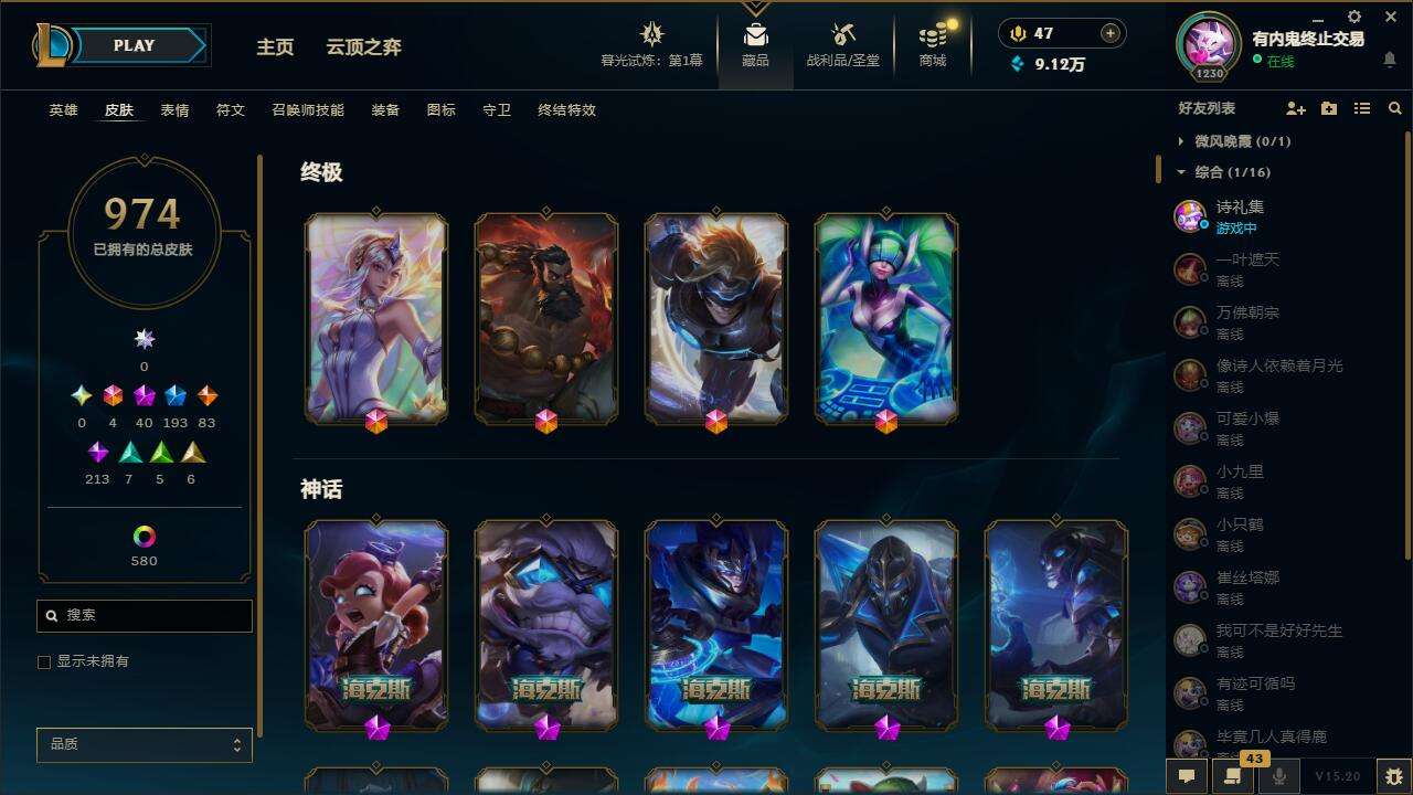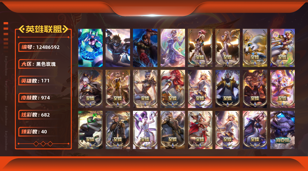 【10918588】[12486592]【gpz_962476】 t27976【黑色玫瑰】蓝龙瞎 974皮肤 682炫彩 40臻彩 40神话/193限定/83传说/171英雄 账号等级:1230 云顶神话:1 单双排段位:翡翠【重要头像】猪妹手办 星守阿狸 爱意绵绵 爱情之歌 心型钥匙 觅心游侠卢锡安 觅心之翼奎因 雪花 大家伙 SSG霞 春晖神女拉克丝 小希 勇者阿狸
