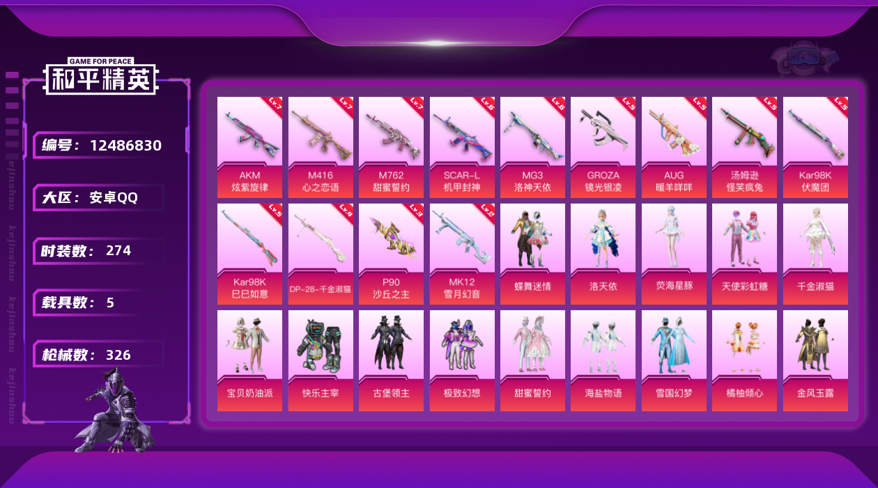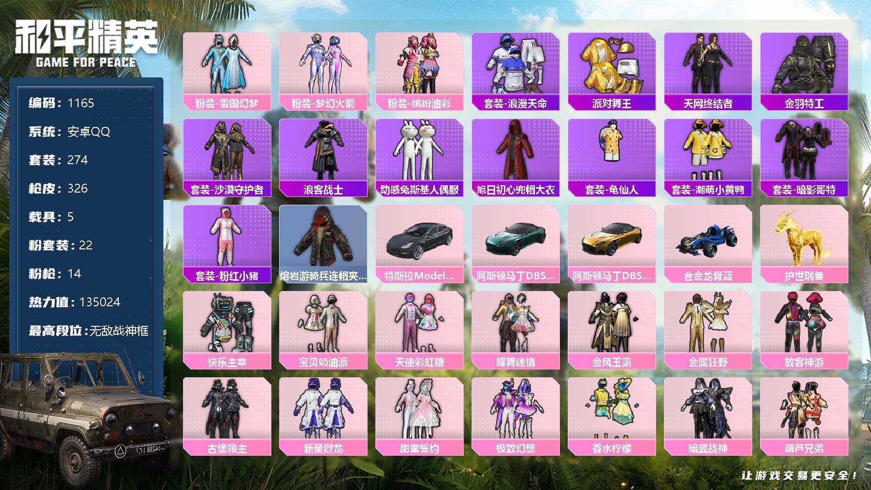 【10918653】【不可二次】【安卓QQ】合金龙骨蓝色 暗翼战神 雪国梦幻 新星烈龙 金属狂野 阿斯顿马丁S绿色 洛天依 葫芦兄弟 放客神游 快乐主宰 海盐物语 M416-心之恋语 缤纷油彩 蝶舞迷情 98K-伏魔团 SCAR-机甲封神 MG3-洛神天依 极致幻想 AKM-炫紫旋律 古堡领主 金风玉露 M762甜蜜誓言 天使彩虹糖 汤姆逊-怪笑疯兔 宝贝奶油派 甜蜜誓约 阿斯顿马丁S金色